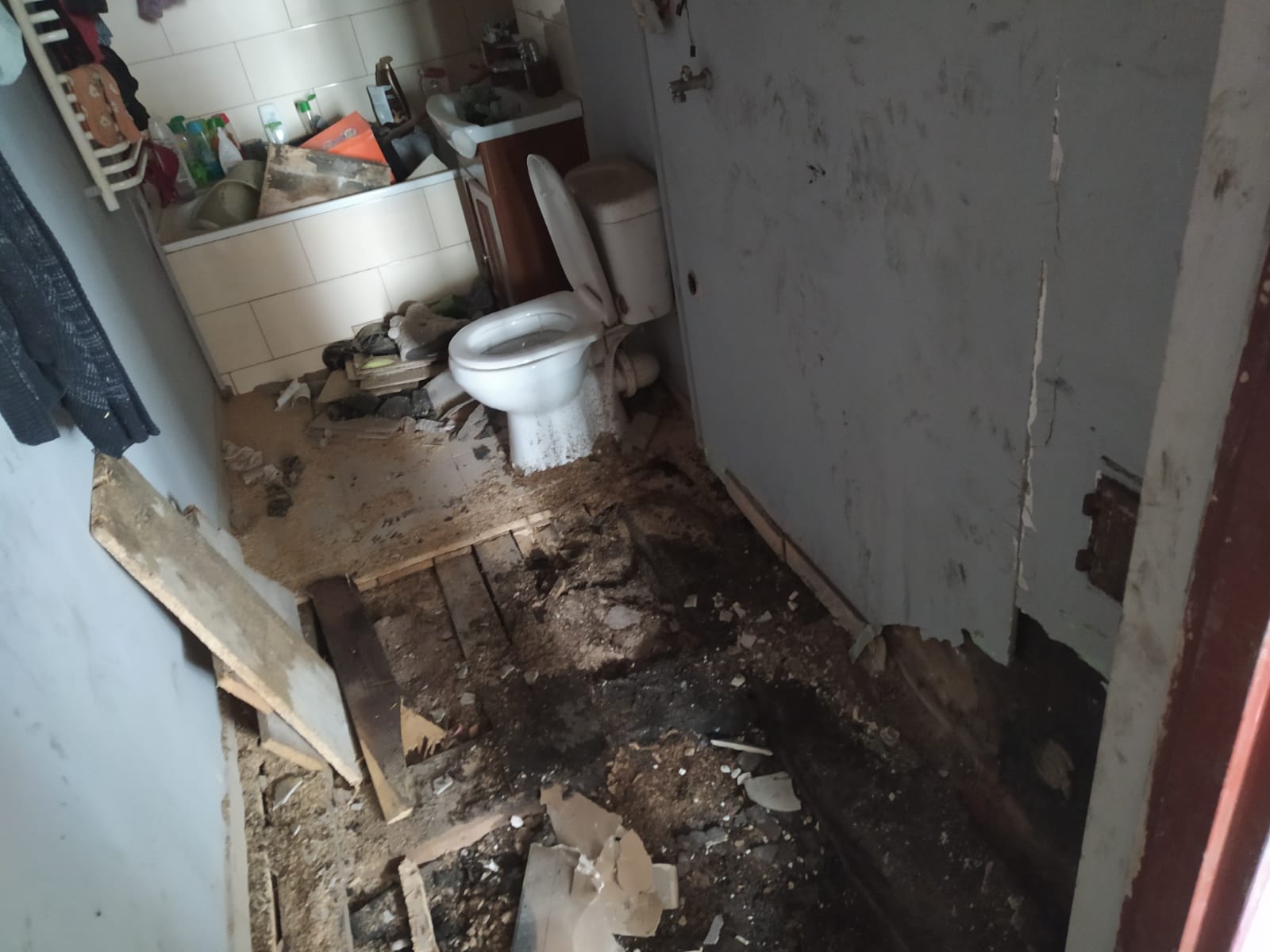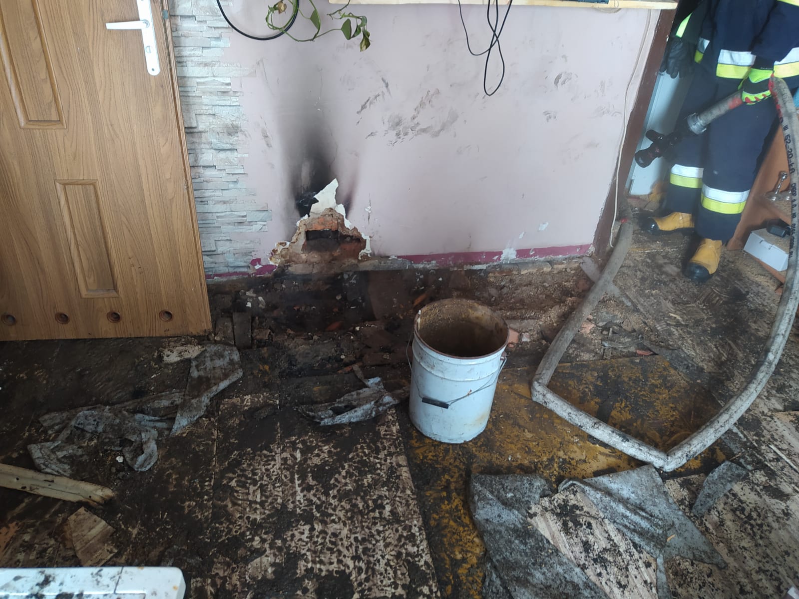 Kierujący Działaniem Ratowniczym po przeprowadzonym rozpoznaniu ustalił, że dym wydobywa się spod podłogi, w mieszkaniu na pierwszym piętrze. Działania zastępów polegały na zabezpieczeniu miejsca zdarzenia, a następnie usuwaniu części podłogi i podawaniu wody na palące się elementy drewnianego stropu.