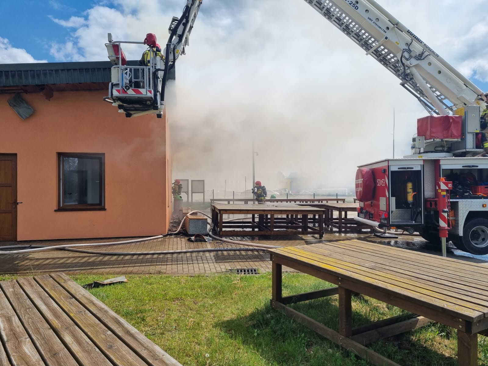 30 maja 2023 r. o godzinie 13:52, dyżurny Stanowiska Kierowania Komendanta Powiatowego PSP w Olecku, otrzymał zgłoszenie o pożarze budynku administracyjnego w Olecku przy ul. Rzeźnickiej. Po dotarciu na miejsce pierwszych zastępów okazało się, że ogniem objęty był cały dach obiektu. Po przeprowadzonym rozpoznaniu i przeszukaniu wykluczono obecność osób we wewnętrzu budynku. Działania zastępów polegały na podaniu czterech prądów wody w natarciu na palącą się konstrukcję dachu, wykorzystując między innymi podnośnik hydrauliczny i drabiny. Prowadzenie działań było utrudnione ze względu na silny wiatr oraz intensywne zadymienie. W działaniach trwających ponad 3 godziny, brały udział 4 zastępy JRG PSP Olecko, a także strażacy z jednostek OSP Kowale Oleckie i Borawskie – łącznie 22 ratowników.