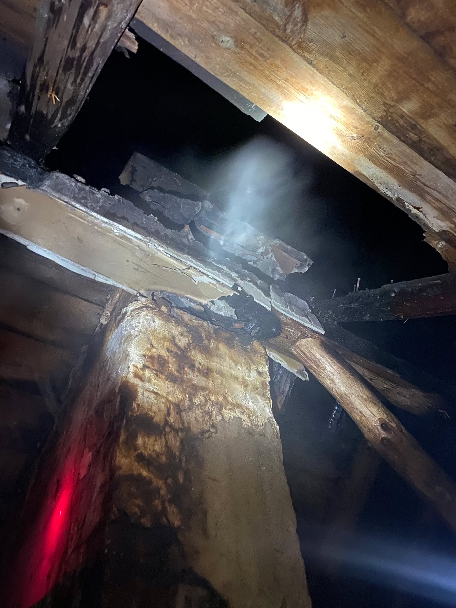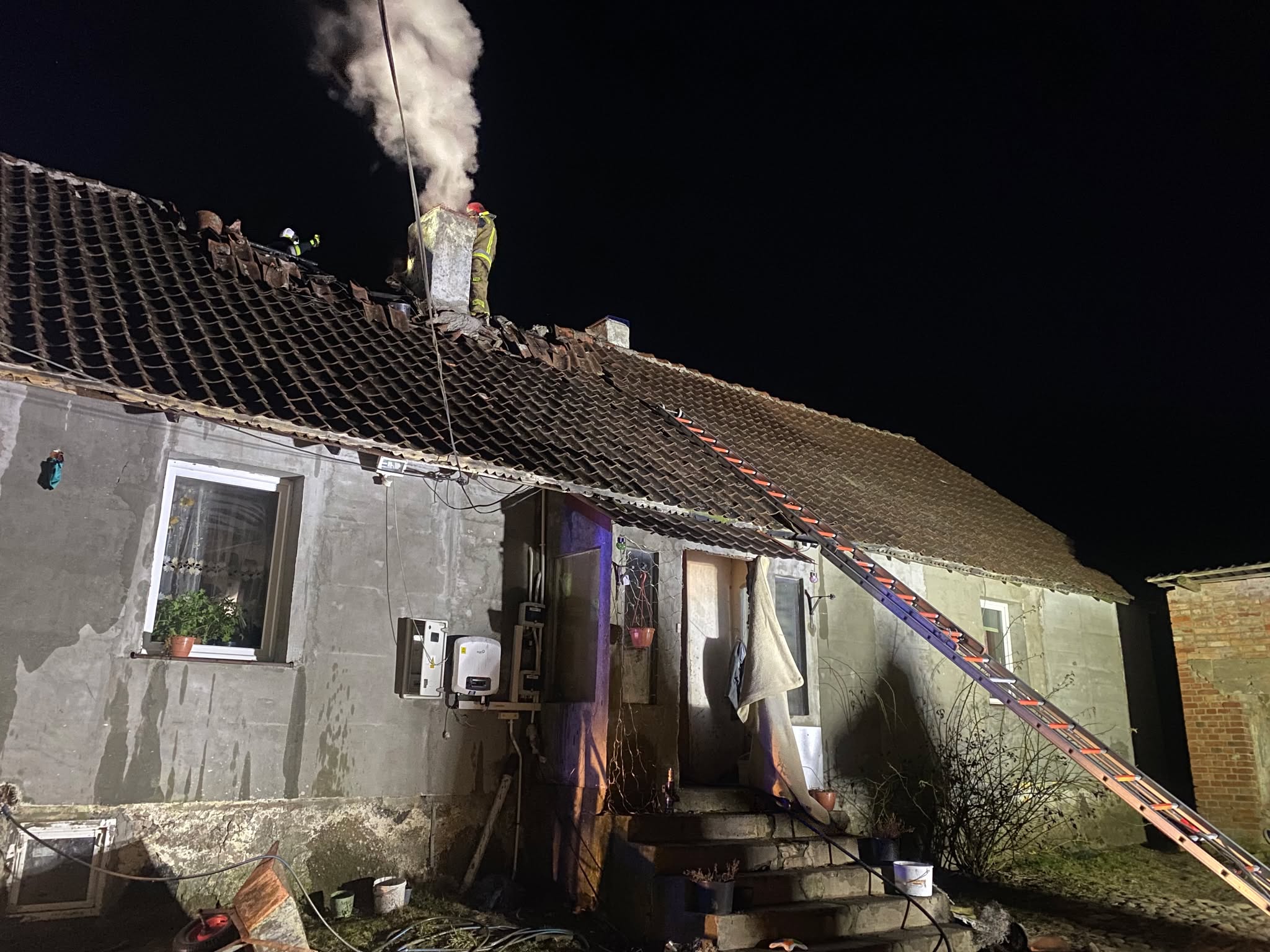 Po dotarciu na miejsce pierwszych zastępów straży pożarnej i przeprowadzeniu rozpoznania, Kierujący Działaniem Ratowniczym potwierdził informacje o pożarze. Stwierdzono, że ogień objął częściowo konstrukcję dachu oraz stropu budynku. Przyczyną zdarzenia było nadmierne nagrzanie się konstrukcji od pożaru sadzy w przewodzie kominowym. Temperatura przewodu kominowego wynosiła ponad 200°C, co doprowadziło do zapłonu elementów konstrukcyjnych poddasza .Działania właściciela budynku oraz jego próba ugaszenia pożaru wpłynęły na rozmiar zdarzenia, ograniczając jego skutki.