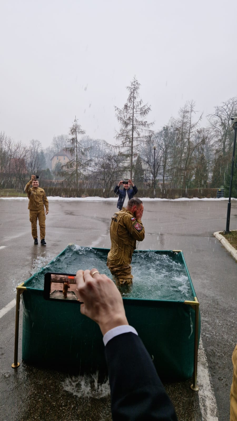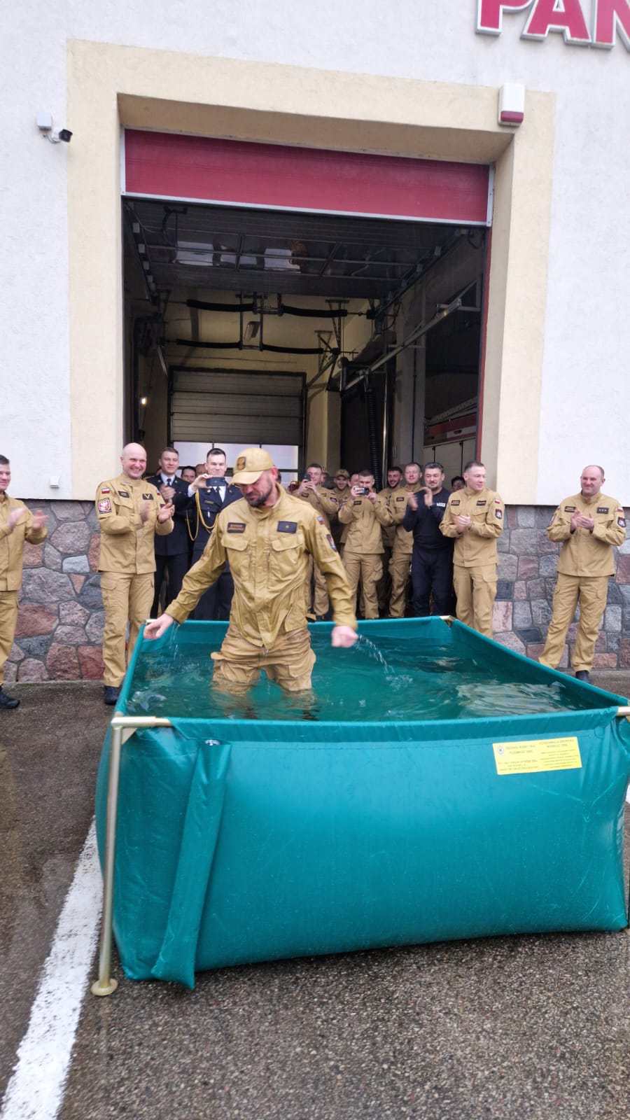 Zgodnie ze starą strażacką tradycją, uroczystości emerytalne kończą się symboliczną kąpielą w przenośnym zbiorniku – nie inaczej było i tym razem.