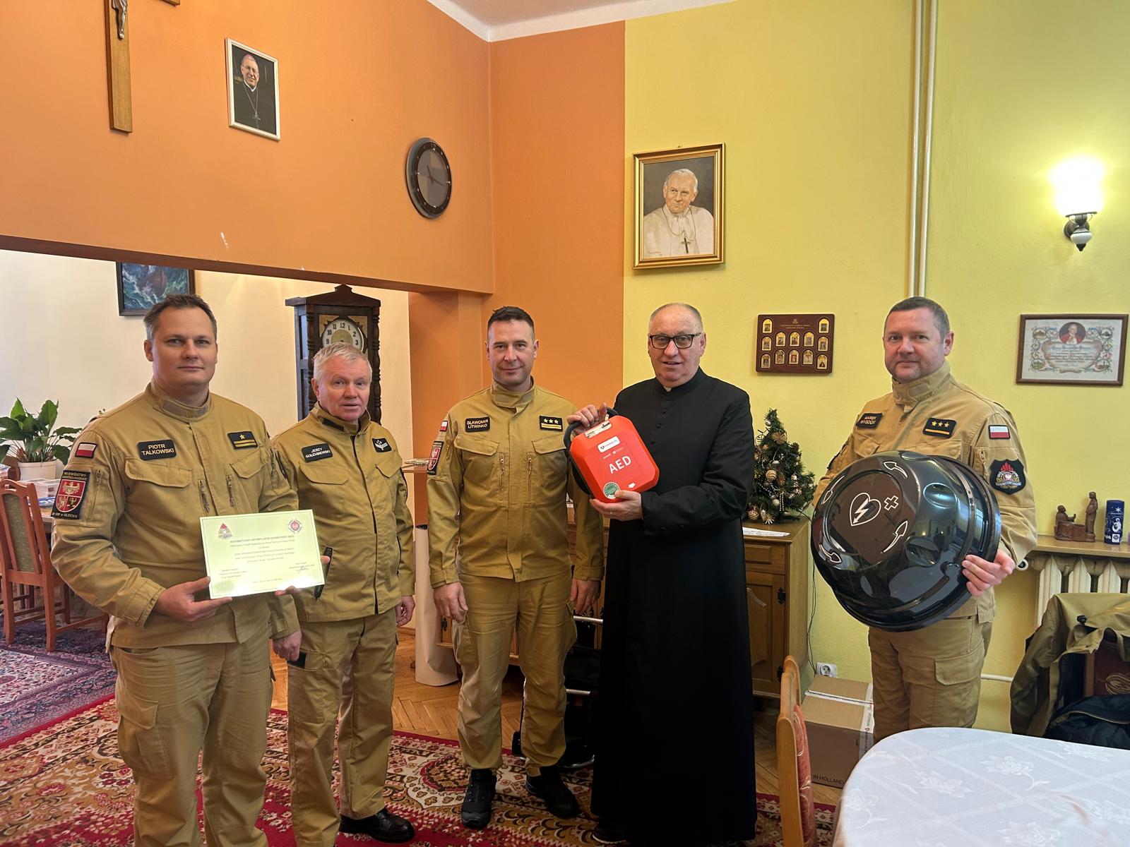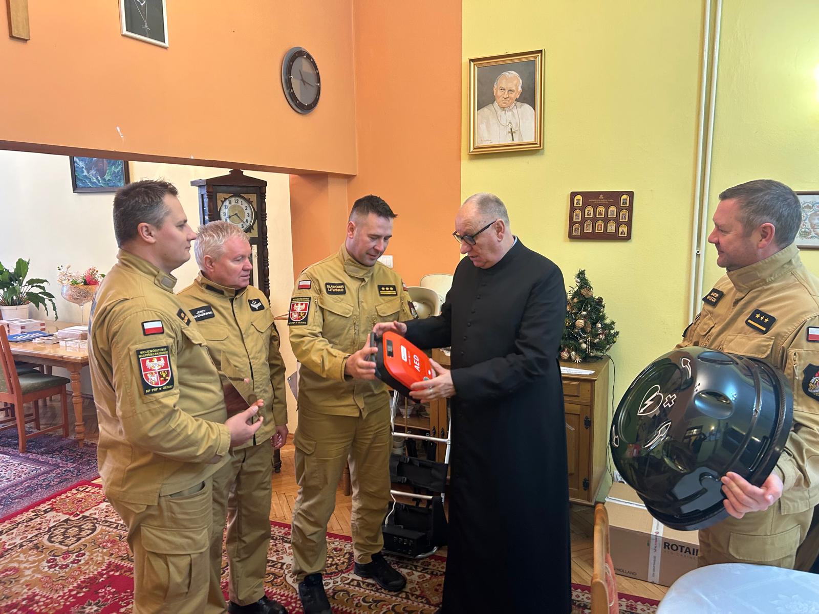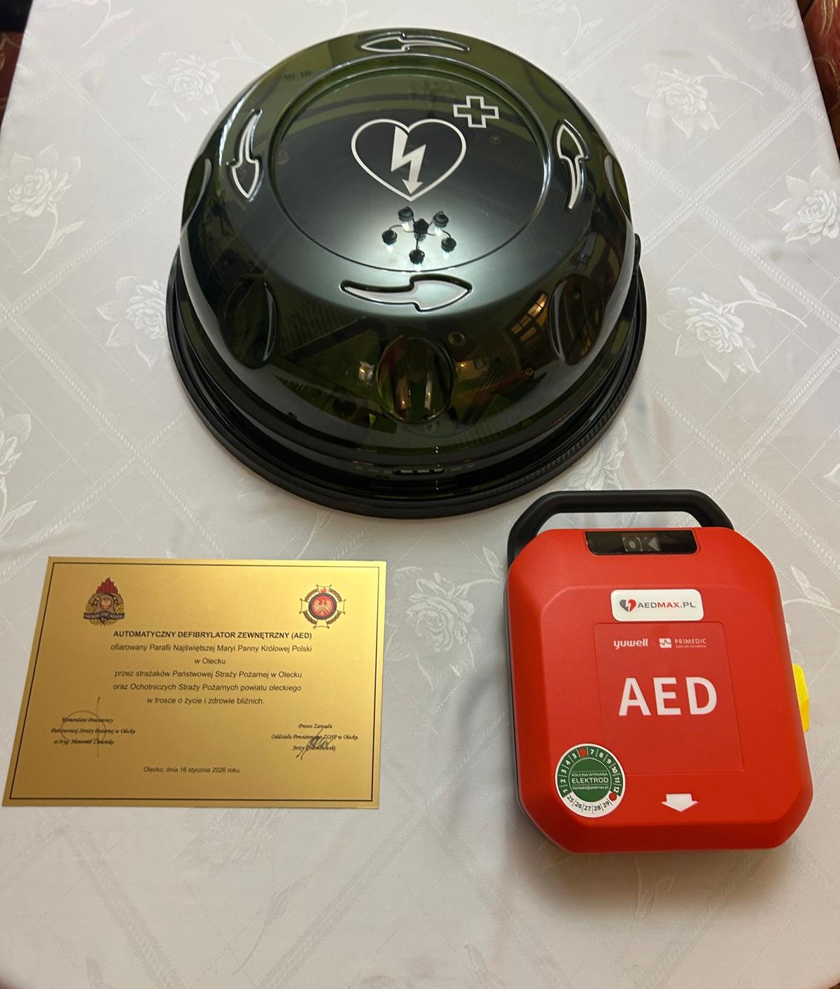 W trosce o bezpieczeństwo mieszkańców Olecka oraz osób przebywających na terenie parafii, doszło do uroczystego przekazania automatycznego defibrylatora zewnętrznego (AED) na ręce ks. Prałata Lecha Janowicza proboszcza parafii pw. NMP Królowej Polski w Olecku. Urządzenie zostało sfinansowane dzięki wspólnej inicjatywie funkcjonariuszy i pracowników cywilnych Komendy Powiatowej Państwowej Straży Pożarnej w Olecku oraz Zarządu Oddziału Powiatowego Związku Ochotniczych Straży Pożarnych w Olecku.