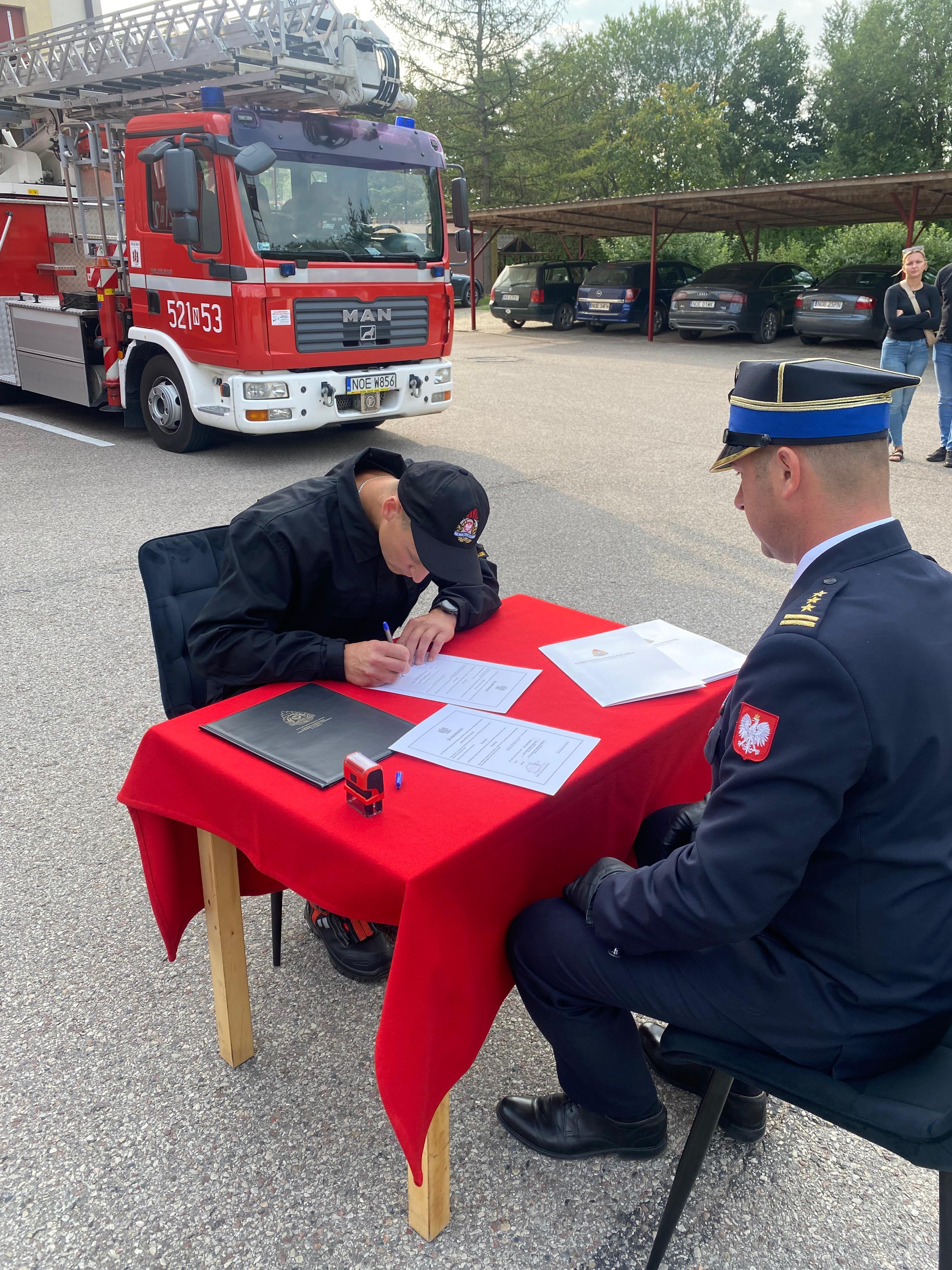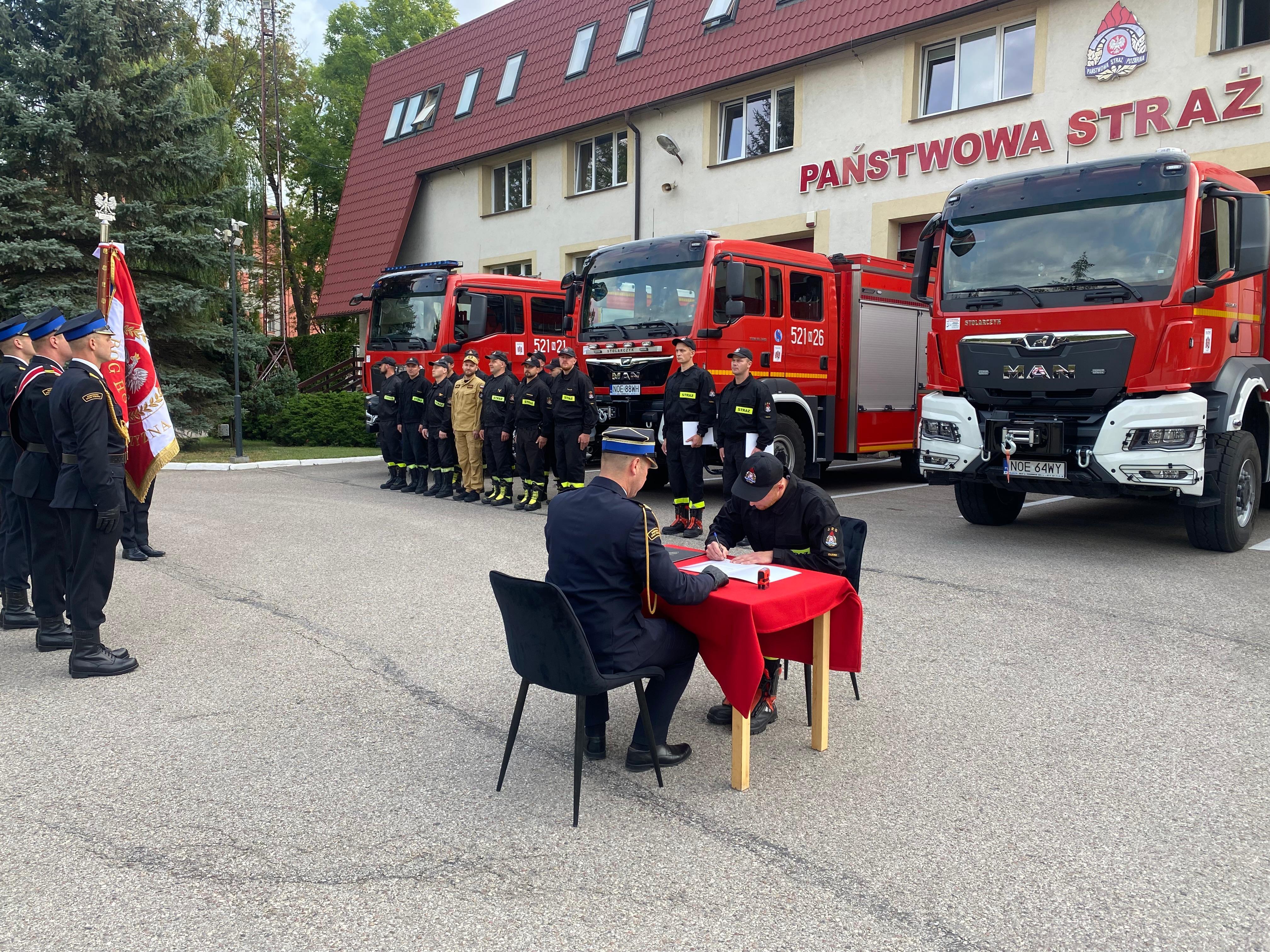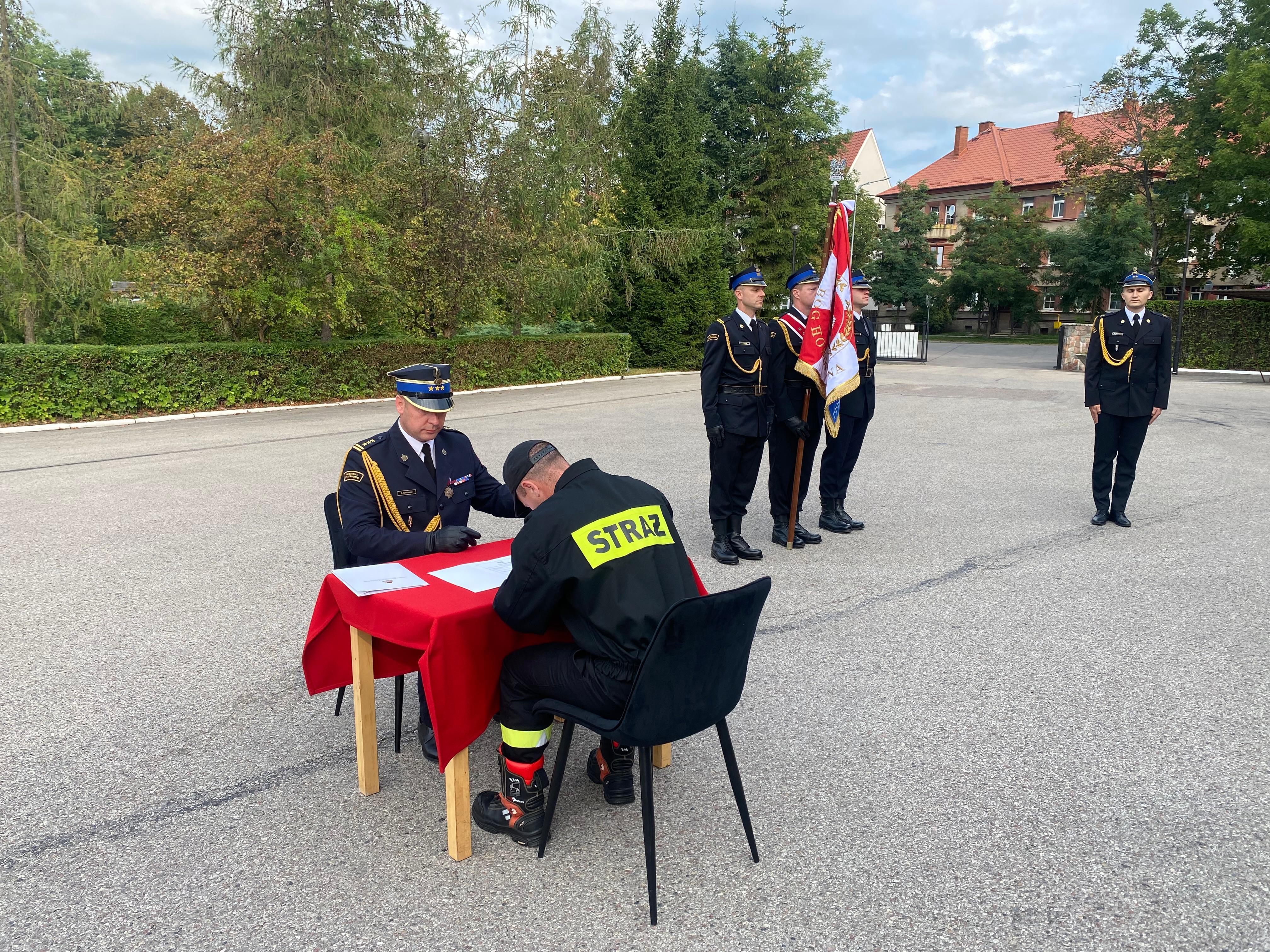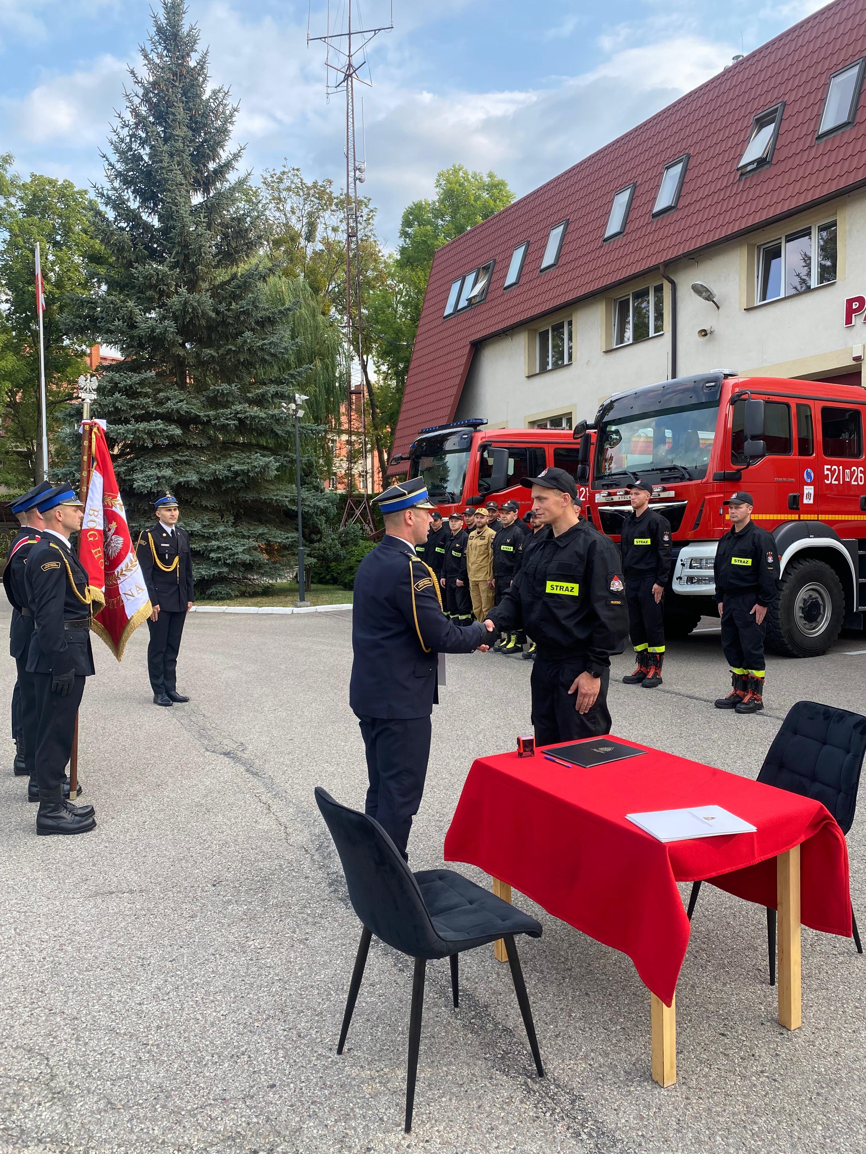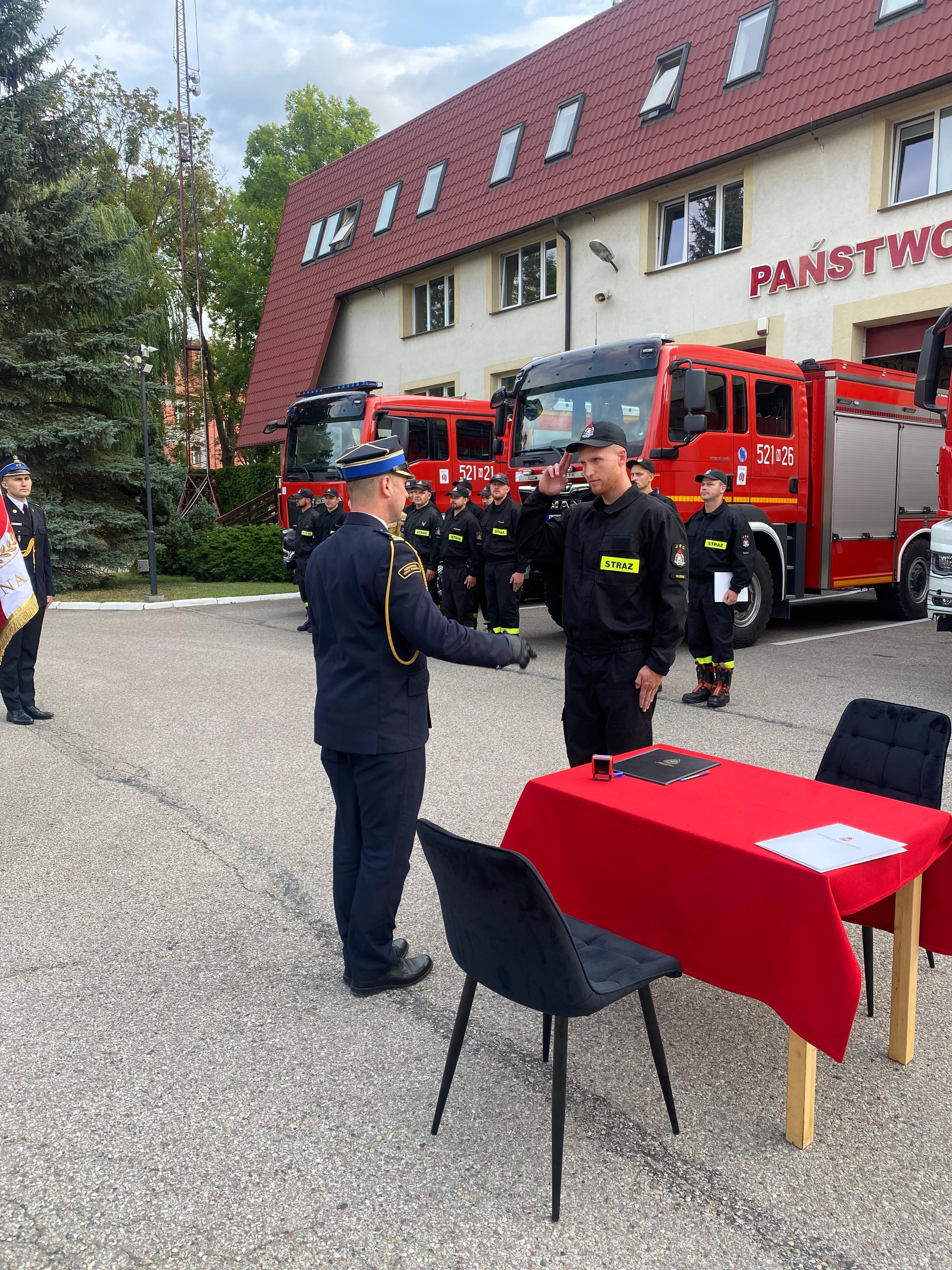 Strażacy złożyli podpisy pod aktami ślubowania, pieczętując ten ważny moment w ich karierze zawodowej. Z rąk komendanta odebrali również akty mianowania do służby przygotowawczej oraz rozkazy o nadaniu stopnia strażaka.