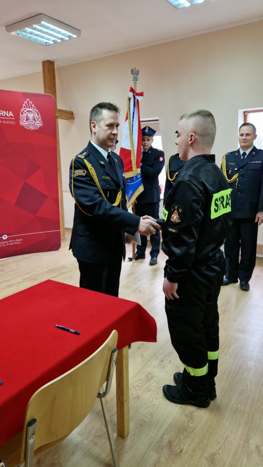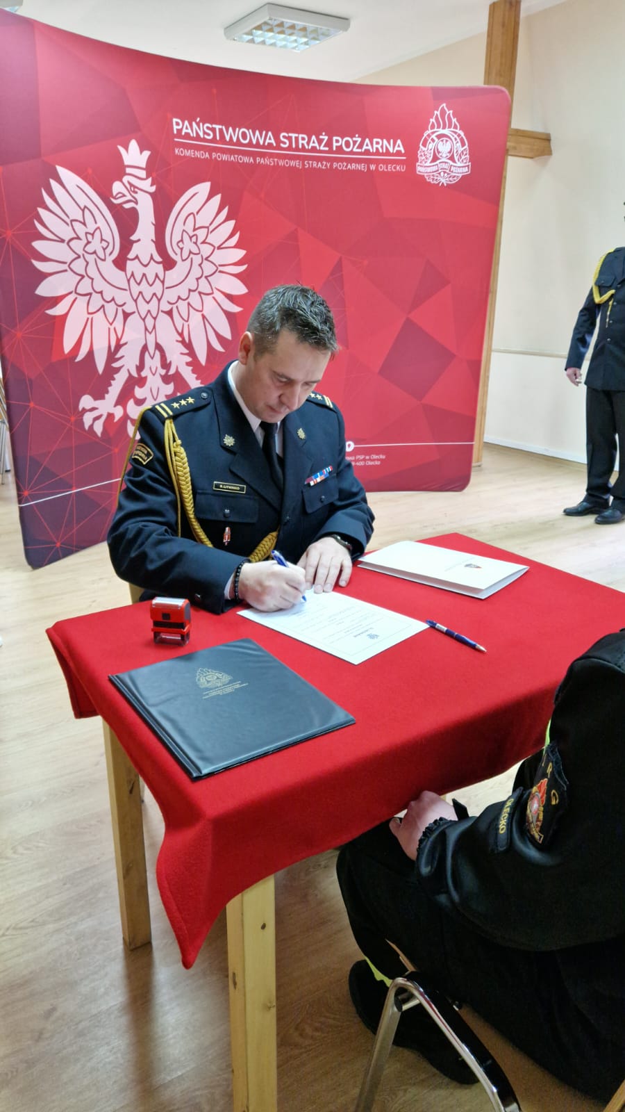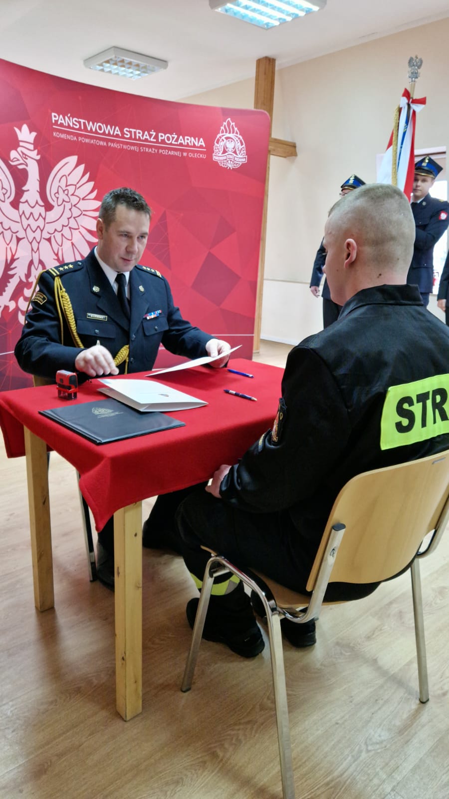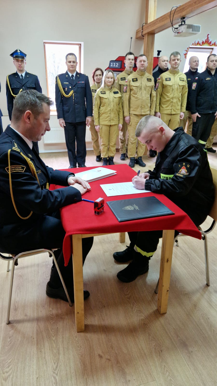Po złożeniu przysięgi funkcjonariusz podpisał akt ślubowania, formalizując tym samym swoje zobowiązania wobec służby. Następnie starszy brygadier Sławomir Litwinko wręczył mu akt mianowania do służby przygotowawczej. W swoim przemówieniu komendant podkreślił znaczenie roty ślubowania, zaznaczając, że strażak reprezentuje formację nie tylko podczas pełnienia obowiązków służbowych, ale również w życiu codziennym.