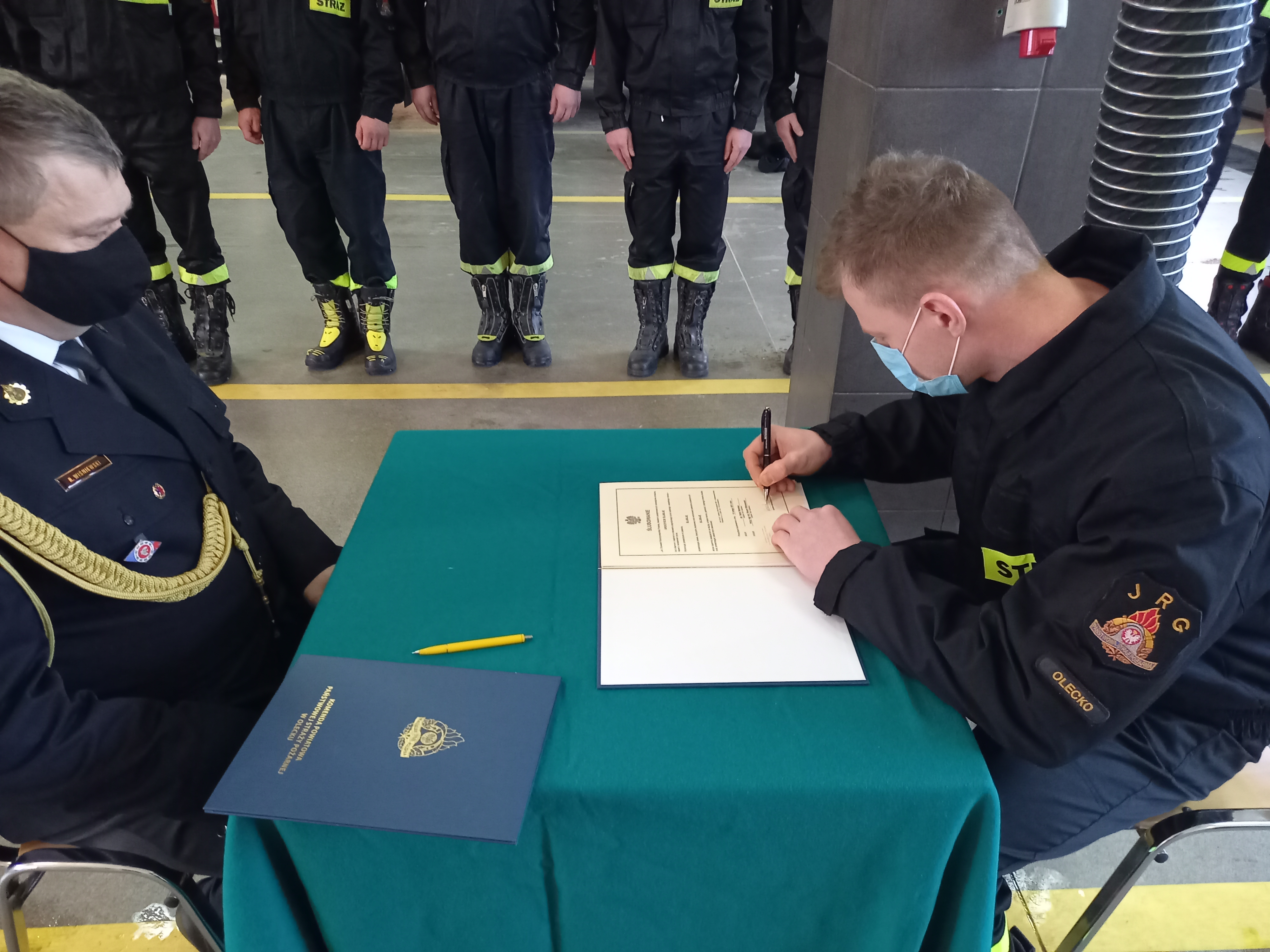 W dniu 12 lutego 2021 r. w Komendzie Powiatowej Państwowej Straży Pożarnej w Olecku podczas uroczystej zbiórki, odbyło się ślubowanie strażaków wstępujących w szeregi PSP.