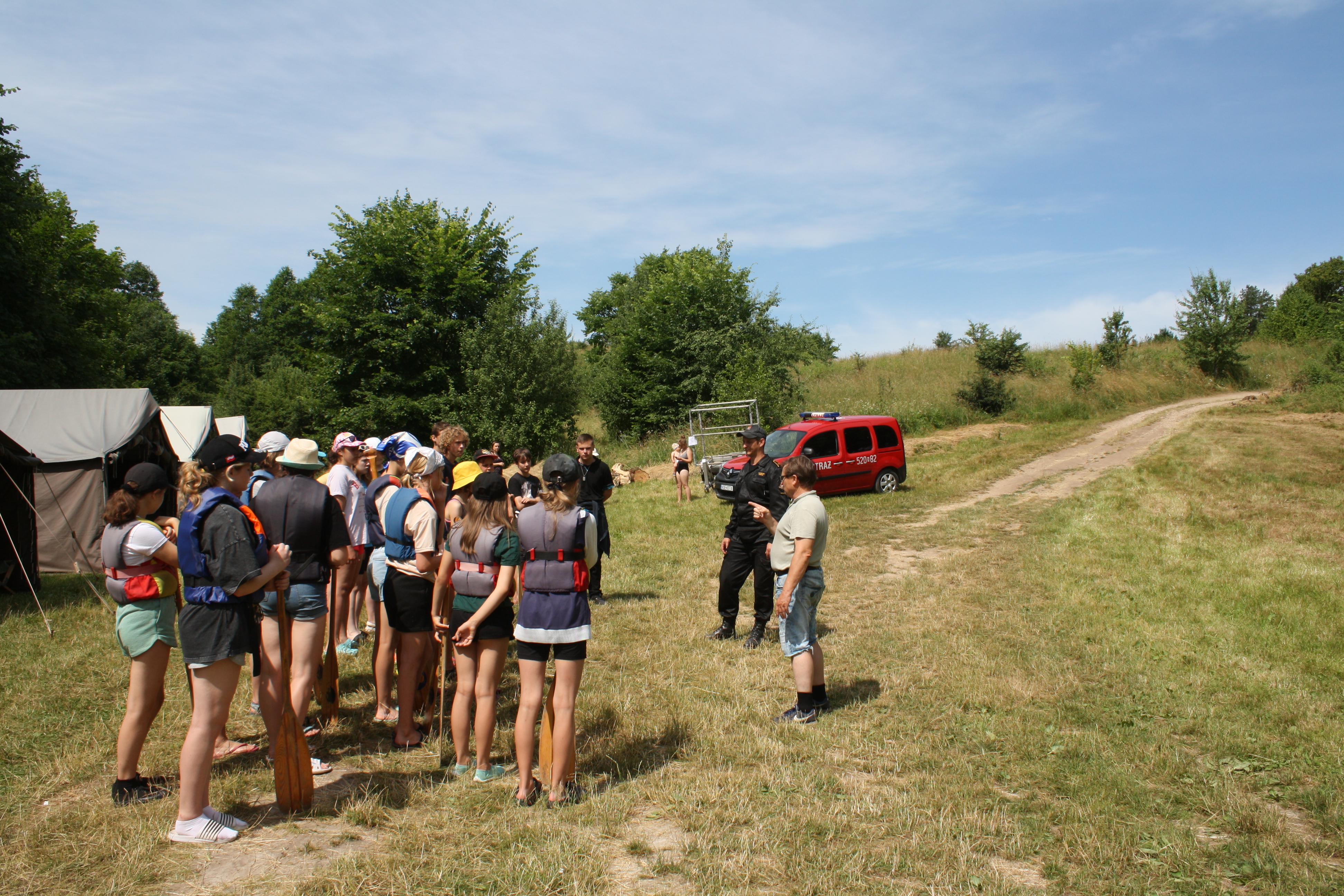 Funkcjonariusze Komendy Powiatowej Państwowej Straży Pożarnej w Olecku, dbając o bezpieczeństwo dzieci i młodzieży przebywającej na obozach harcerskich, przeprowadzili wizytację obozu zlokalizowanego w miejscowości Gąski nad jeziorem Przytulskim. Na terenie obozowiska zameldowanych jest łącznie 53 uczestników, w tym czternaścioro dzieci, które zakwaterowane są w Szkole Podstawowej. Nadzór nad wypoczywającymi sprawuje wykwalifikowana kadra opiekunów. Strażacy kontrolują obozy harcerskie w ramach porozumienia, jakie stanowi „Protokół uzgodnień w zakresie wzmocnienia bezpieczeństwa na obozach harcerskich pod namiotami”, które zostało zawarte pomiędzy Komendantem Głównym Państwowej Straży Pożarnej, Komendantem Głównym Policji, Dyrektorem Generalnym Lasów Państwowych, a organizacjami harcerskimi. Funkcjonariusze sprawdzili stan zabezpieczenia obozowiska, sposób wdrożenia obowiązujących zasad bezpieczeństwa oraz nadzorowali praktyczne sprawdzenie organizacji oraz warunków ewakuacji z terenu obozu. Wizyta była również okazją do przeprowadzenia zajęć edukacyjnych, w których poruszono zagadnienia związane z bezpiecznym przebywaniem nad wodą i postępowaniem podczas ewentualnych zagrożeń, mogących pojawić się w związku z powstaniem pożarów, niebezpiecznych wyładowań atmosferycznych, intensywnych opadów deszczu oraz silnych i porywistych podmuchów wiatru. Życzymy bezpiecznego i udanego wypoczynku.