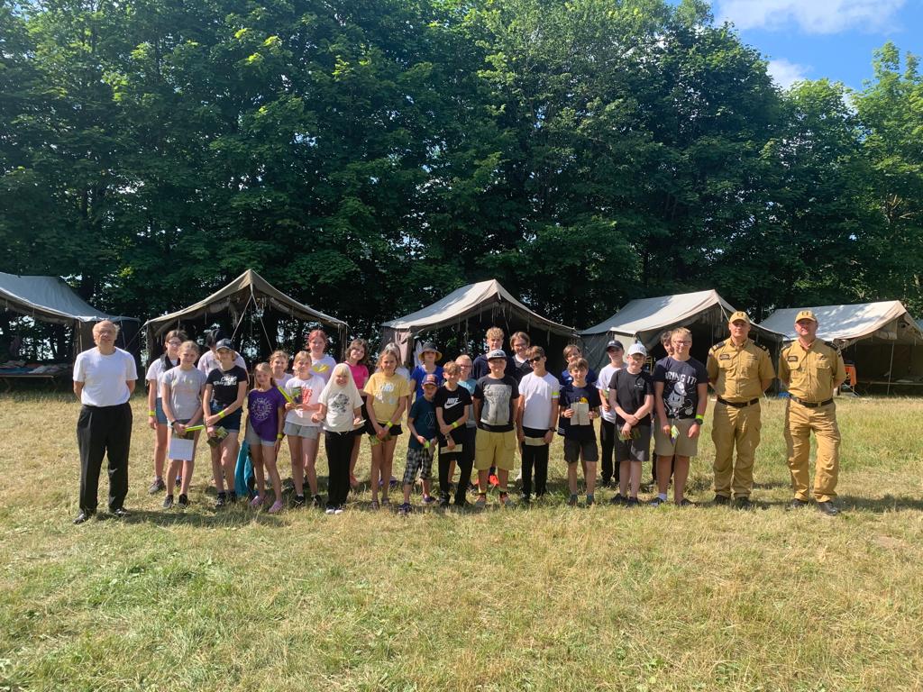 Funkcjonariusze Komendy Powiatowej Państwowej Straży Pożarnej w Olecku, dbając o bezpieczeństwo dzieci i młodzieży przebywającej na obozach harcerskich, przeprowadzili wizytację obozu zlokalizowanego w miejscowości Gąski nad jeziorem Przytulskim. Na terenie obozowiska pod namiotami zameldowanych jest łącznie 34 uczestników. Nadzór nad wypoczywającymi sprawuje wykwalifikowana kadra opiekunów. Strażacy kontrolują obozy harcerskie w ramach porozumienia, jakie stanowi „Protokół uzgodnień w zakresie wzmocnienia bezpieczeństwa na obozach harcerskich pod namiotami”, które zostało zawarte pomiędzy Komendantem Głównym Państwowej Straży Pożarnej, Komendantem Głównym Policji, Dyrektorem Generalnym Lasów Państwowych, a organizacjami harcerskimi. Funkcjonariusze sprawdzili stan zabezpieczenia obozowiska, sposób wdrożenia obowiązujących zasad bezpieczeństwa oraz nadzorowali praktyczne sprawdzenie organizacji oraz warunków ewakuacji z terenu obozu. Wizyta była również okazją do przeprowadzenia zajęć edukacyjnych, w których poruszono zagadnienia związane z bezpiecznym przebywaniem nad wodą i postępowaniem podczas ewentualnych zagrożeń, mogących pojawić się w związku z powstaniem pożarów, niebezpiecznych wyładowań atmosferycznych, intensywnych opadów deszczu oraz silnych i porywistych podmuchów wiatru. Życzymy bezpiecznego i udanego wypoczynku.