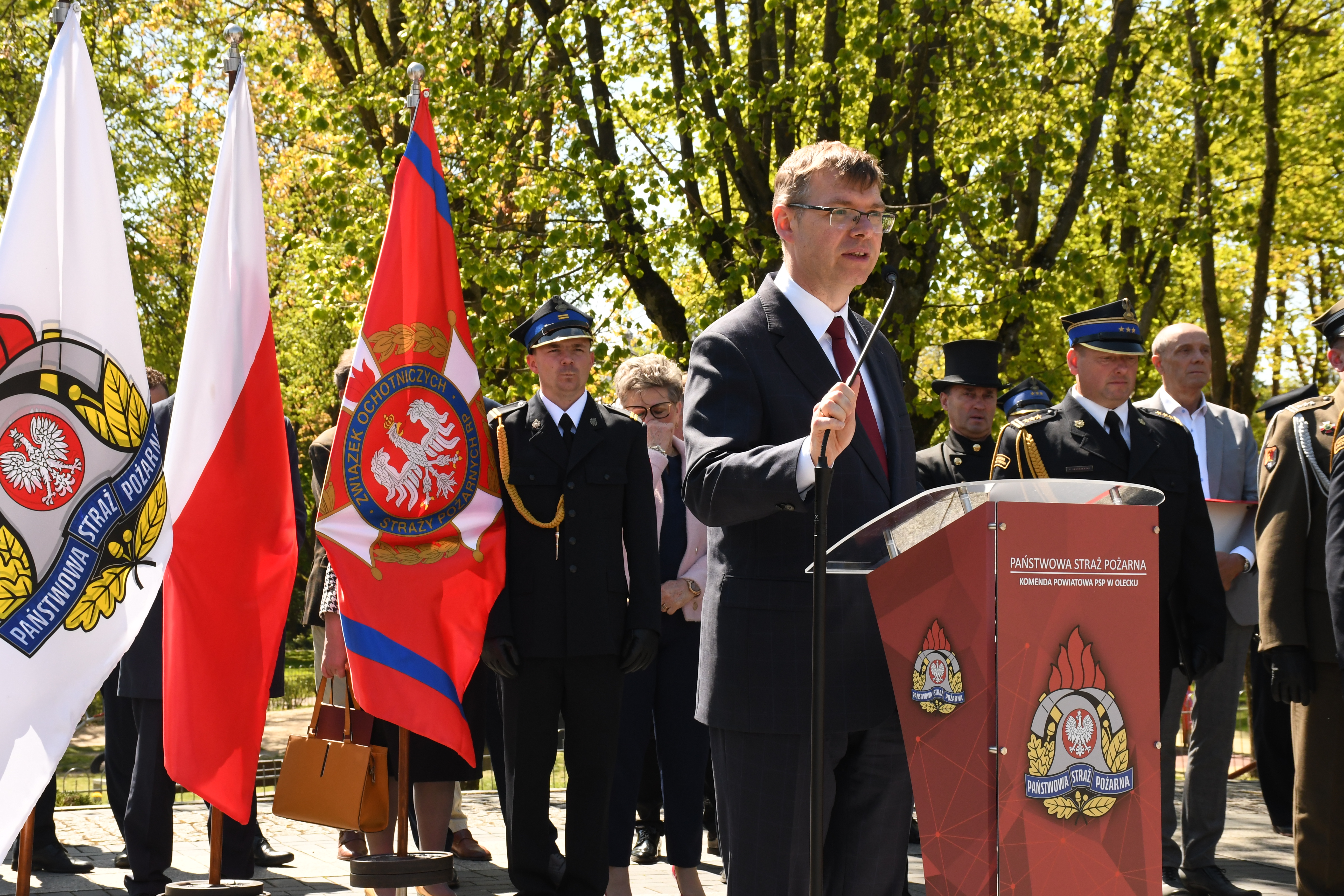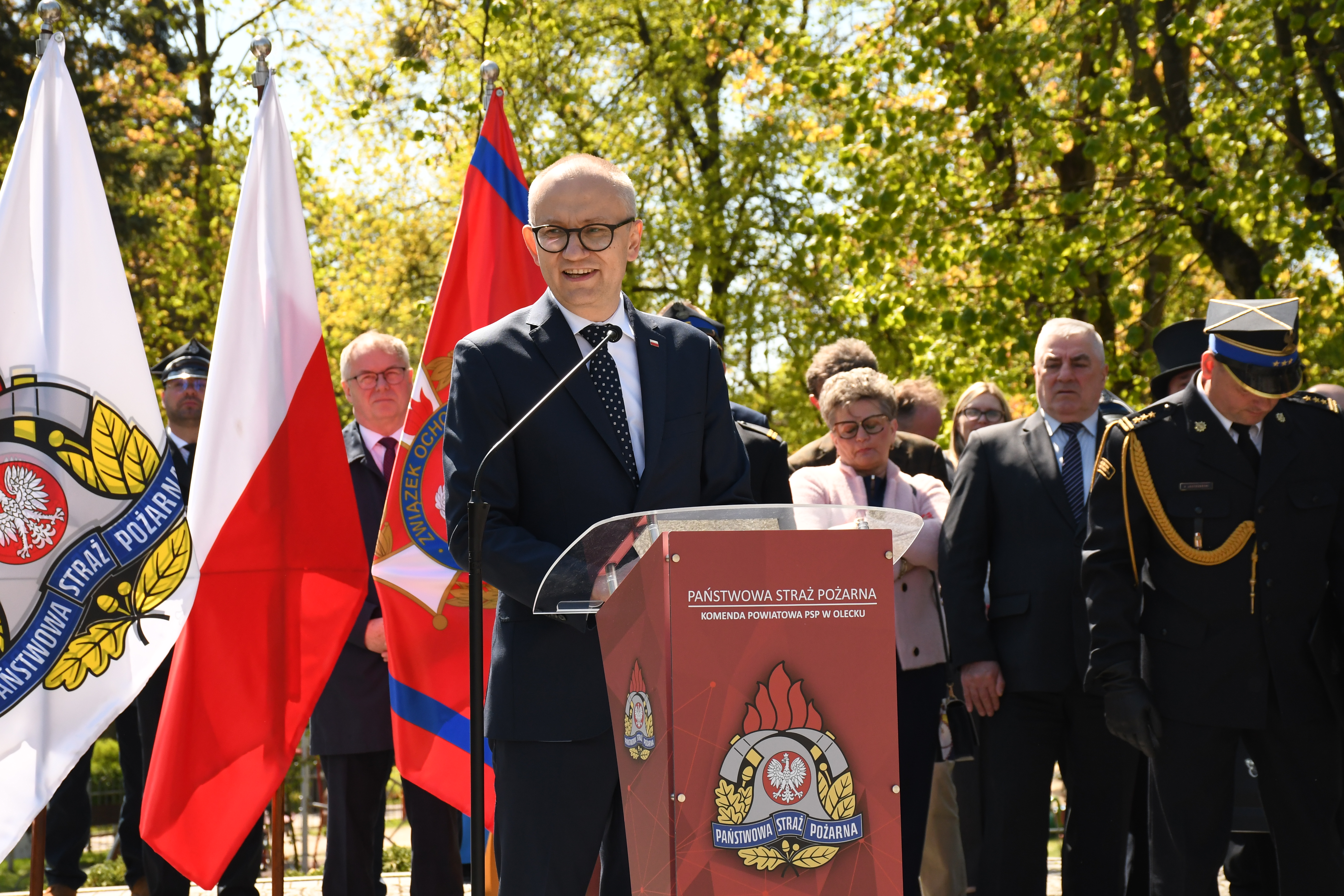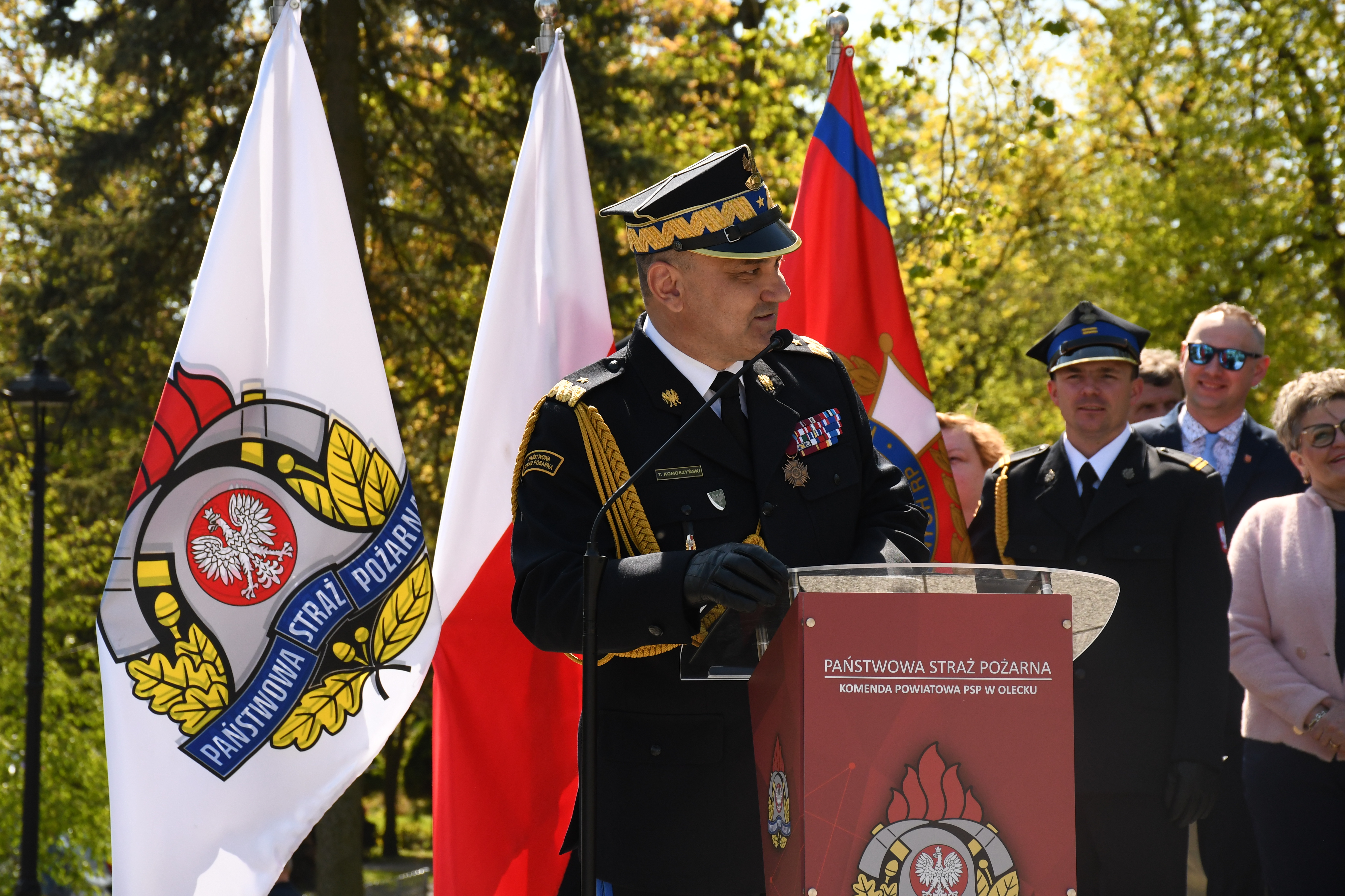 Szczególnym momentem uroczystości było przekazanie sztandaru Komendzie Powiatowej PSP w Olecku. Sekretarz Stanu w Ministerstwie Spraw Wewnętrznych i Administracji Błażej Poboży wręczył Sztandar Komendantowi Powiatowemu PSP st. bryg. Sławomirowi Litwinko, który przekazał go załodze oleckiej komendy PSP. To wielki zaszczyt i honor dla strażaków PSP z Olecka, a posiadanie własnego Sztandaru napawa dumą i daje energię do służby na rzecz społeczeństwa.