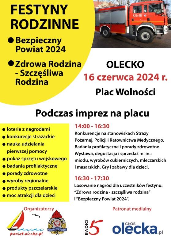 16 czerwca 2024 r. (w niedzielę) w Olecku, na placu w centrum miasta odbędą się 2 festyny rodzinne: