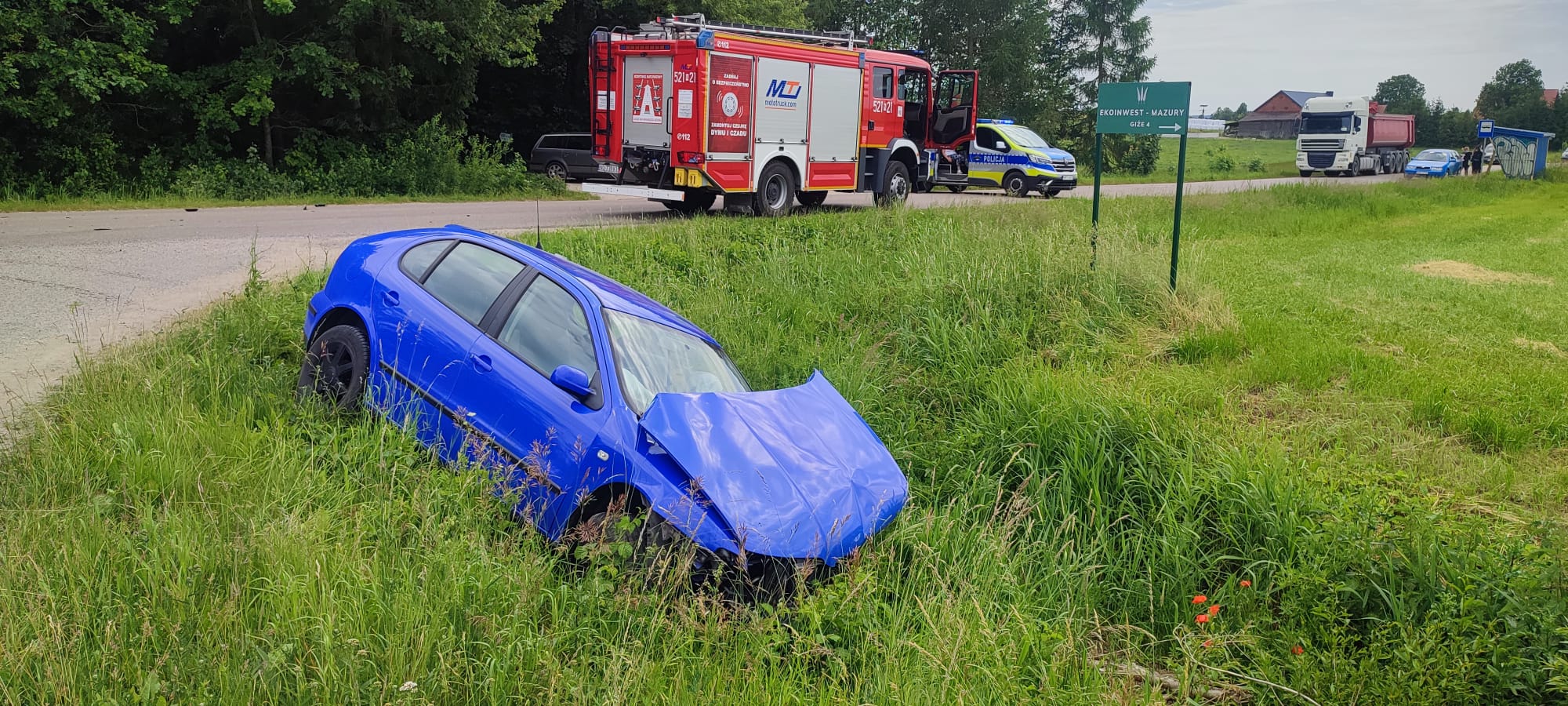 W poniedziałek, 23 czerwca, tuż po godzinie 13:00 w miejscowości Giże (pow. Olecki) doszło do poważnie wyglądającego wypadku drogowego. Na skrzyżowaniu dwóch dróg powiatowych zderzyły się dwa samochody osobowe. Pojazdami podróżowały łącznie cztery osoby – troje dorosłych oraz dziecko.