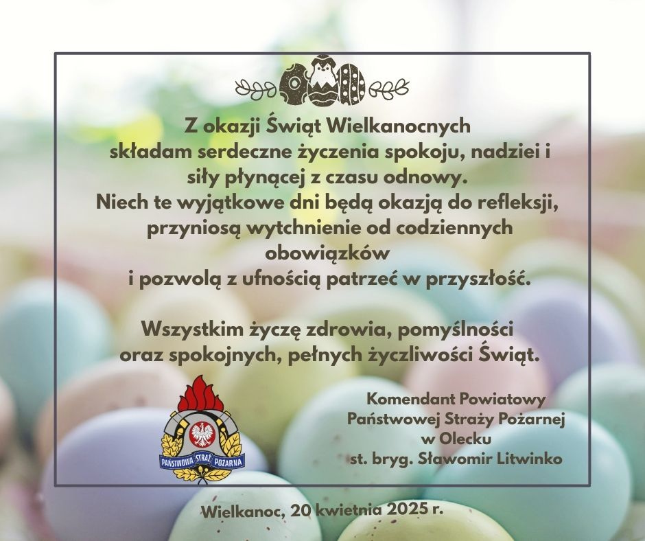 Życzenia Wielkanocne Komendanta Powiatowego PSP w Olecku 20.04.2025 Zdjęcia (1) Pokaż zdjęcie 1 z galerii.
