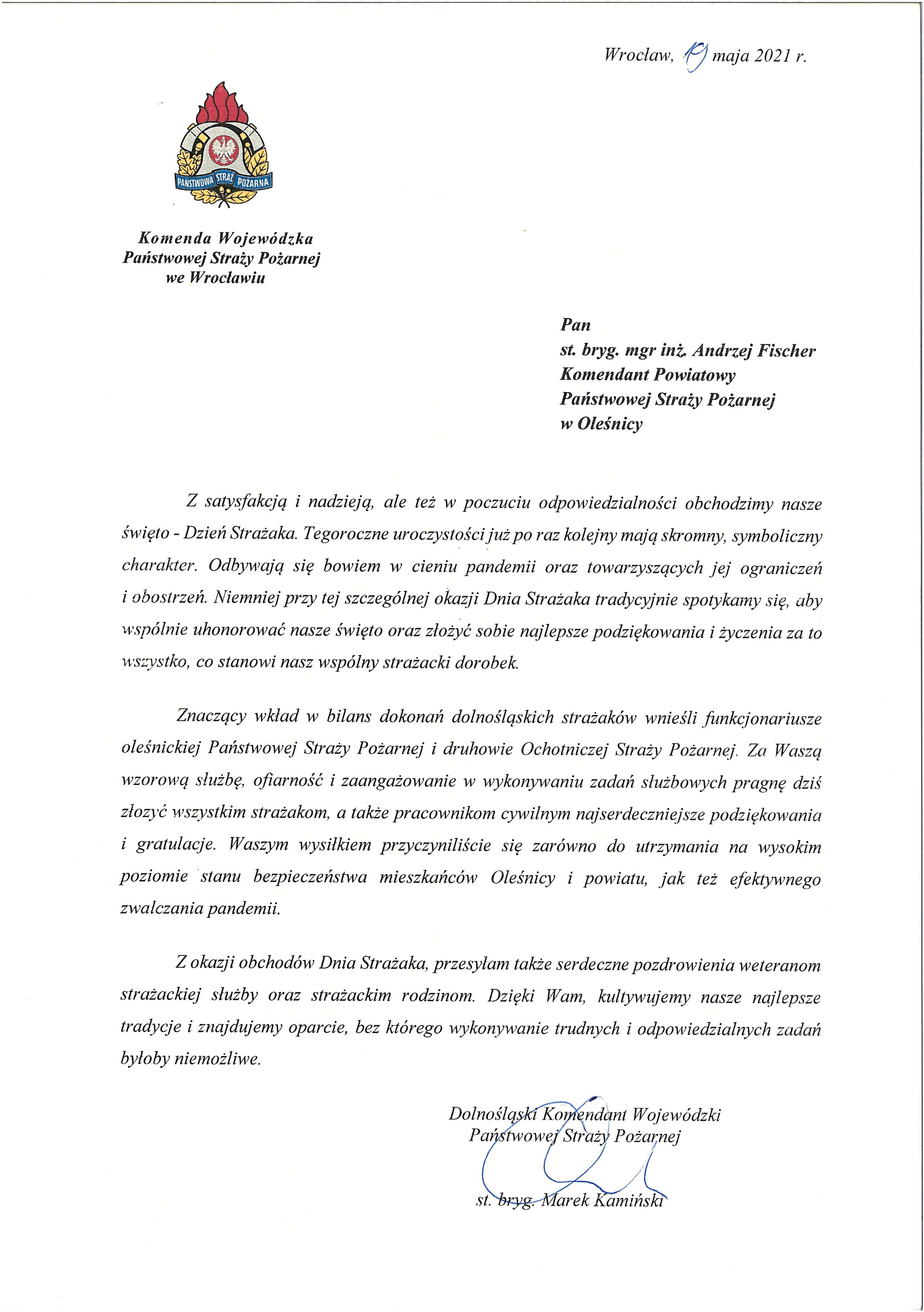 Po wręczeniu odznaczeń, awansów i podziękowań głos zabrał Pan st. bryg. Piotr Grzyb, który odczytał list od Dolnośląskiego Komendanta Wojewódzkiego PSP we Wrocławiu Pana st. bryg. Marka Kamińskiego, jak również krótko scharakteryzował ostatni rok strażaków województwa dolnośląskiego, wyraził też słowa uznania dla strażaków oleśnickich.