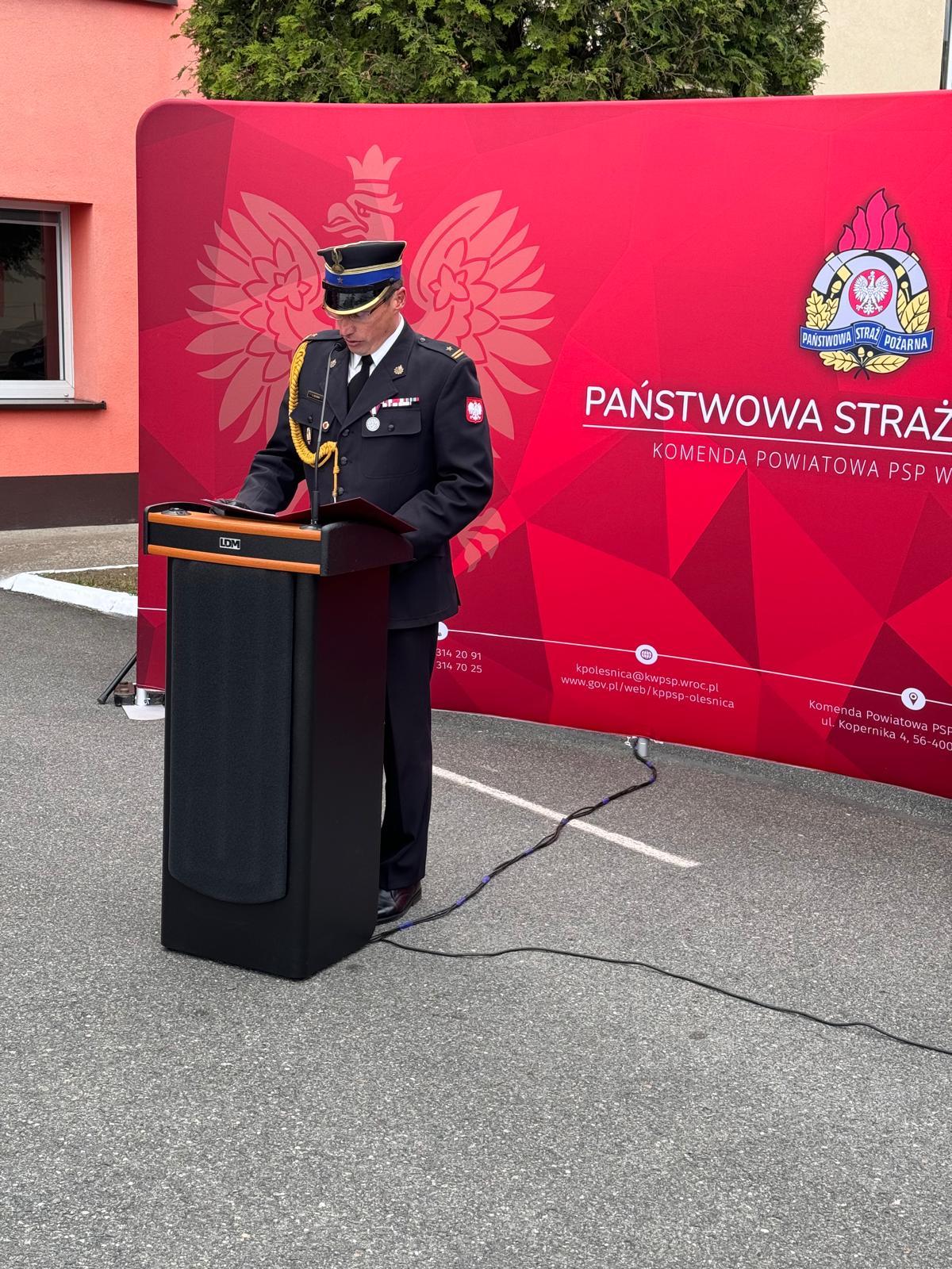 Następnie głos zabrał Komendant Powiatowy PSP w Oleśnicy mł. bryg. Łukasz Słoma, który przywitał przybyłych na naszą uroczystość gości, którzy licznie dopisali.