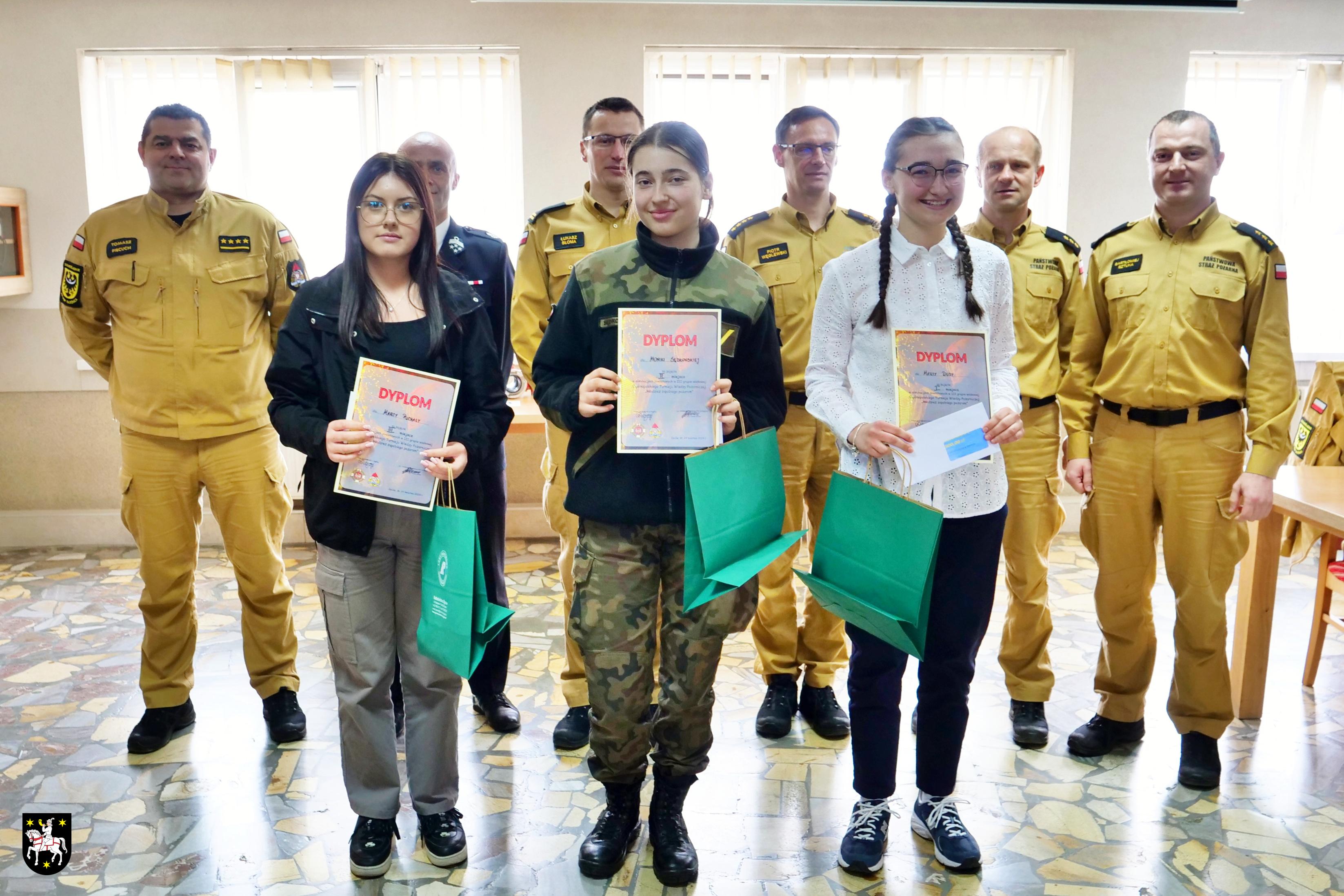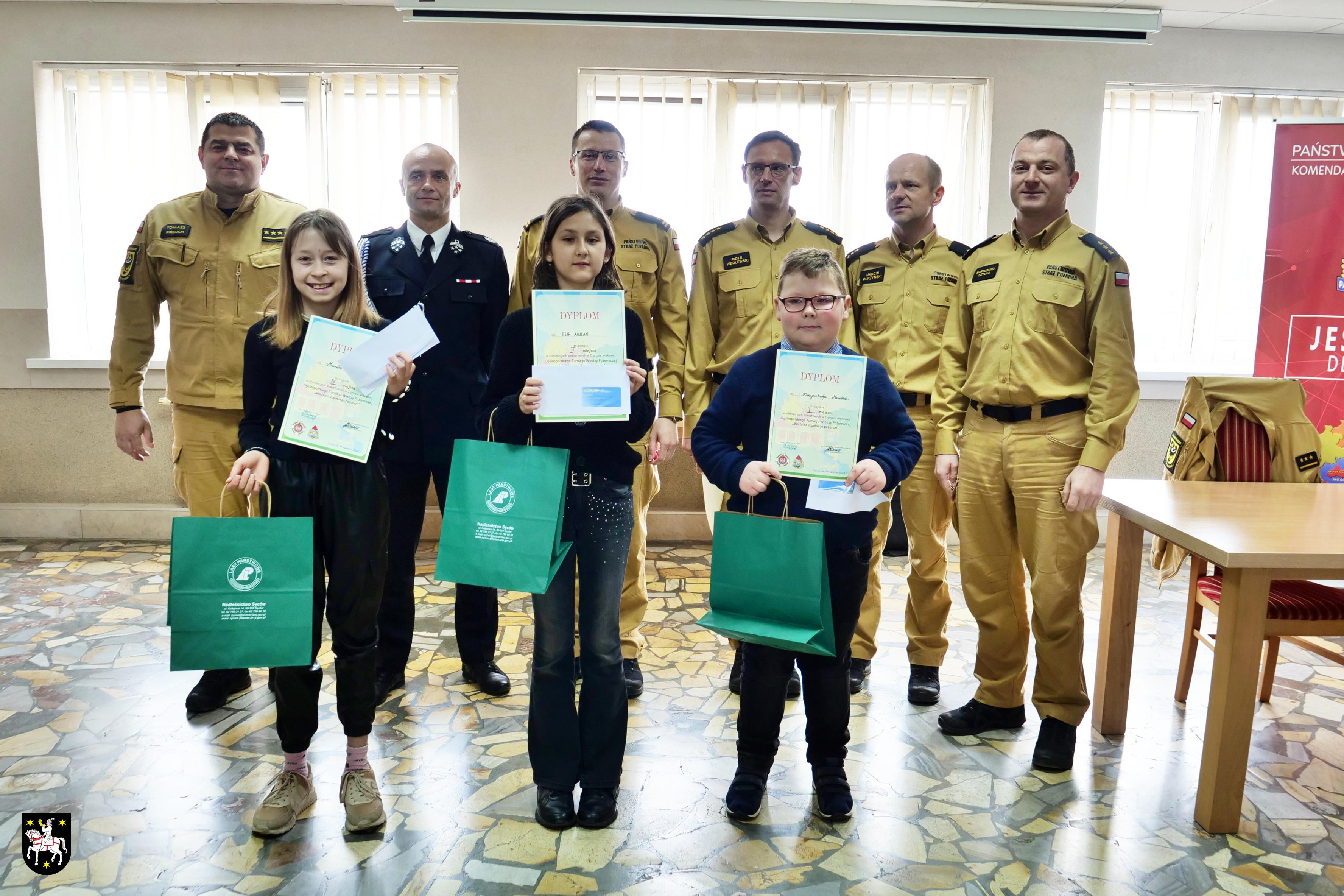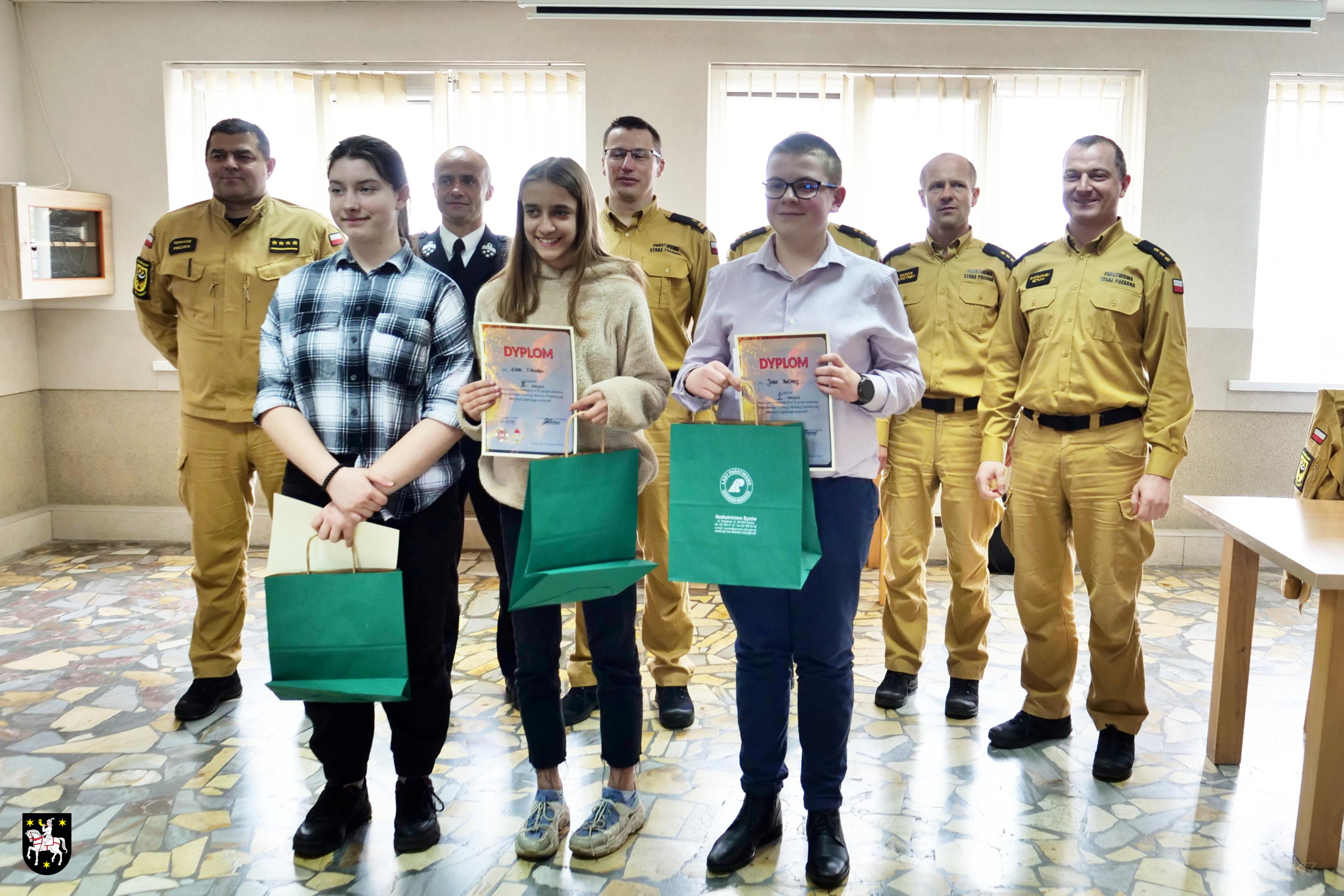 Nagrody i upominki dla uczestników oraz laureatów wręczali p.o. Komendant Powiatowy PSP w Oleśnicy mł. bryg. Łukasz Słoma oraz Prezes ZP ZOSP RP w Oleśnicy dh Tomasz Dżugaj w asyście przewodniczącego komisji.