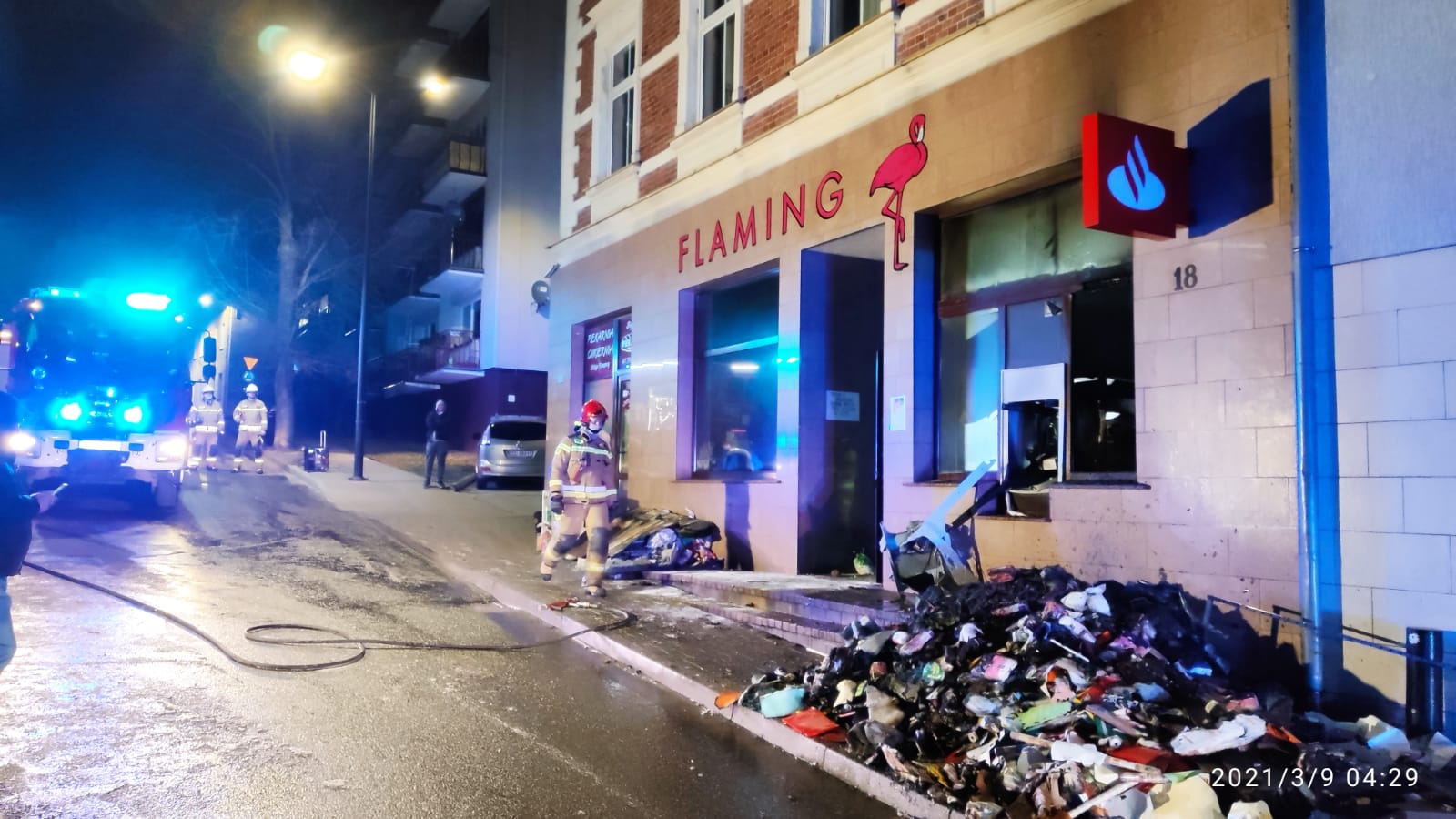 Po przybyciu na miejsce zdarzenia i przeprowadzeniu rozpoznania kierujący działaniami ratowniczymi ustalił, że doszło do pożaru w lokalu handlowo - usługowym zlokalizowanym na parterze budynku wielorodzinnego, prawdopodobną przyczyną pożaru było wysadzenie bankomatu. Cztery osoby z trzynastu przebywające w mieszkaniach na wyższych kondygnacjach ewakuowały się samodzielnie przed przybyciem Straży.