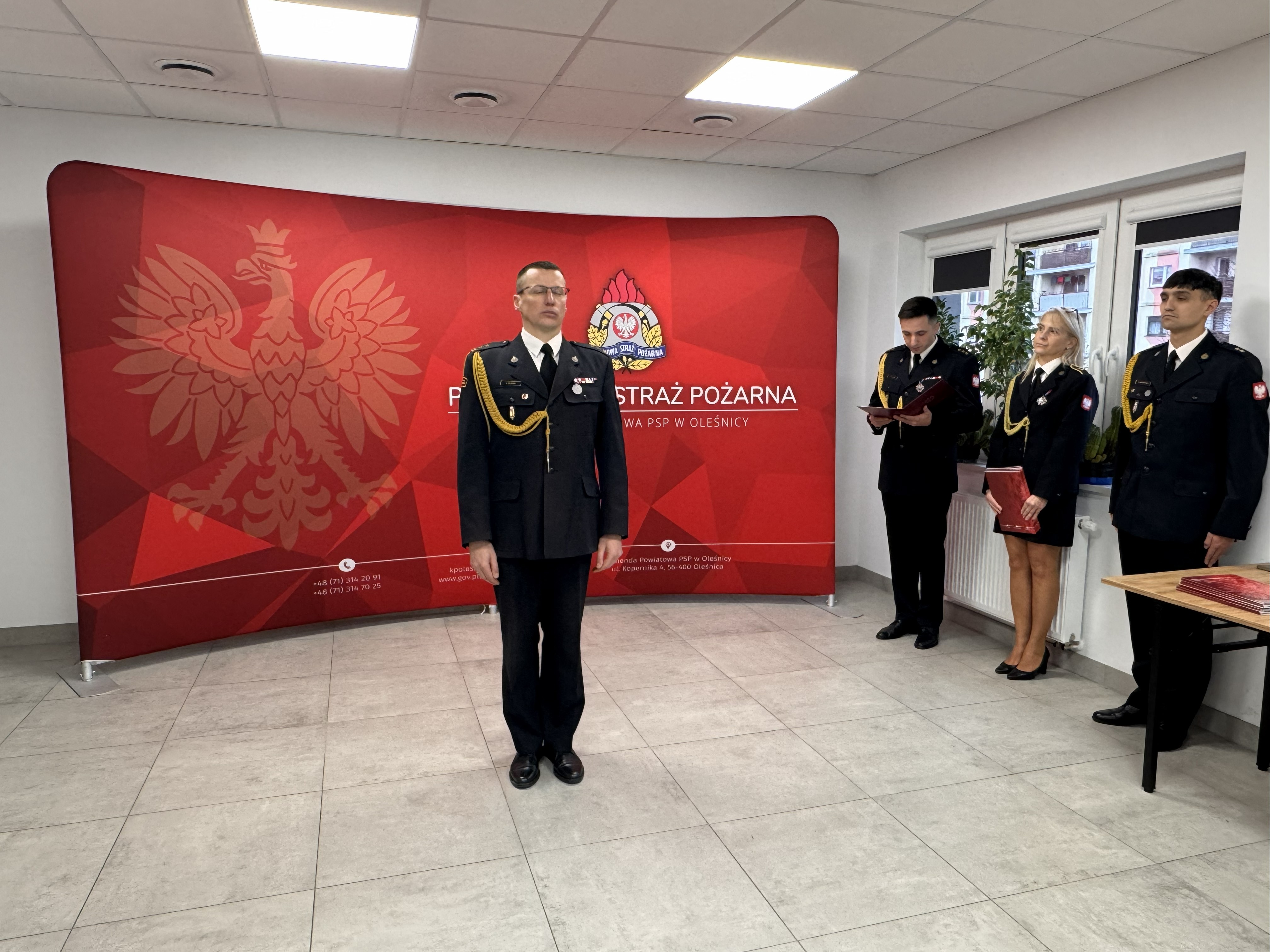 W dniu 17 listopada 2025 r. w Komendzie Powiatowej Państwowej Straży Pożarnej w Oleśnicy odbyła się uroczysta zbiórka z okazji Narodowego Święta Niepodległości.