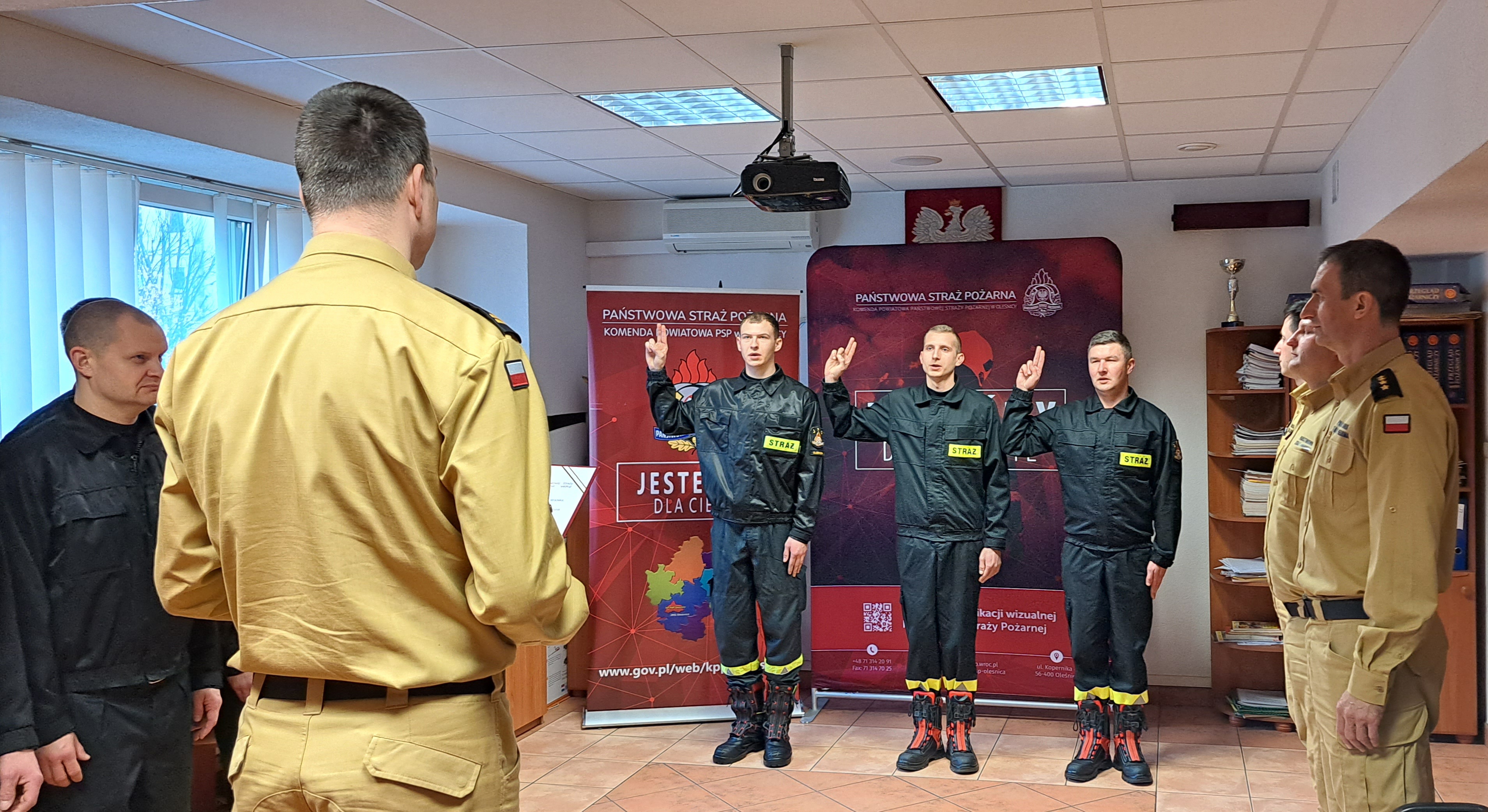 W dniu 13 kwietnia 2023 roku w sali szkoleniowej Komendy Powiatowej PSP w Oleśnicy odbyła się uroczystość ślubowania trzech funkcjonariuszy, którzy będą pełnić służbę w Jednostce Ratowniczo-Gaśniczej w Oleśnicy oraz Sycowie.