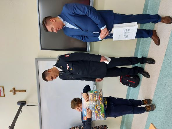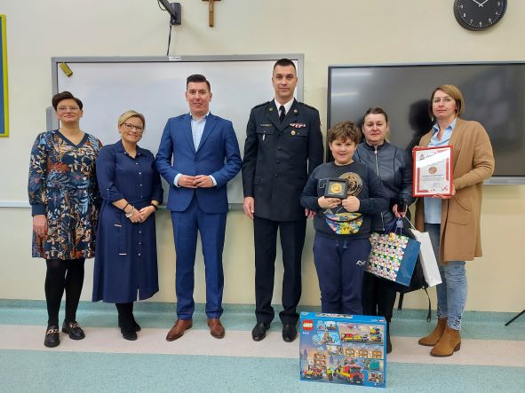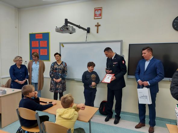 Karolowi gratulujemy, a za swoją godną naśladowania postawę, poza wyróżnieniem odznaką i dyplomem Komendanta Głównego PSP otrzymał inne prezenty (plecak z gadżetami strażackimi, czujkę dymu, klocki lego, dres sportowy) ufundowane przez: Komendę Główną PSP, Starostę Powiatu Oleśnickiego, Komendę Powiatową PSP w Oleśnicy oraz Urząd Miasta i Gminy w Sycowie.