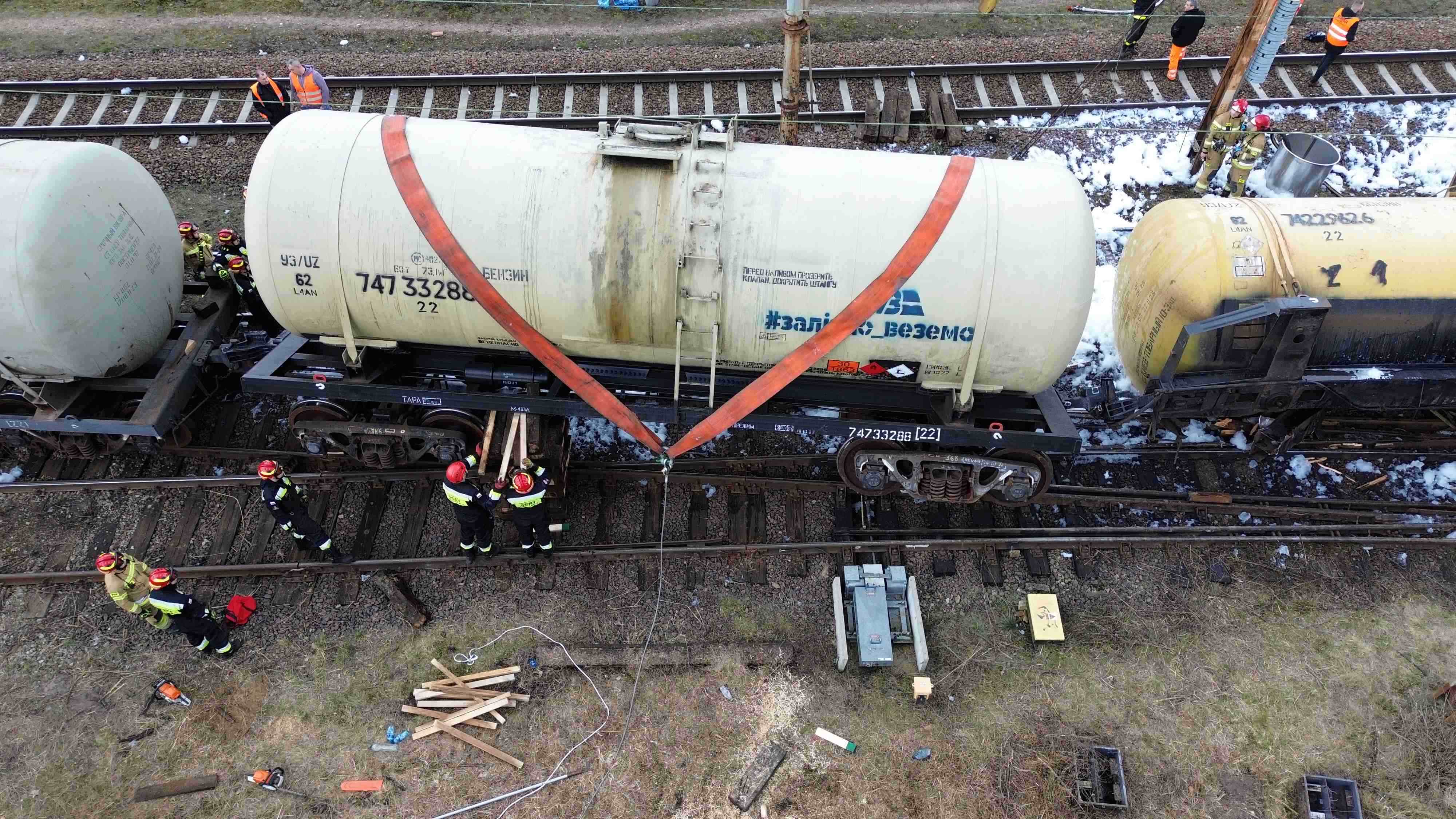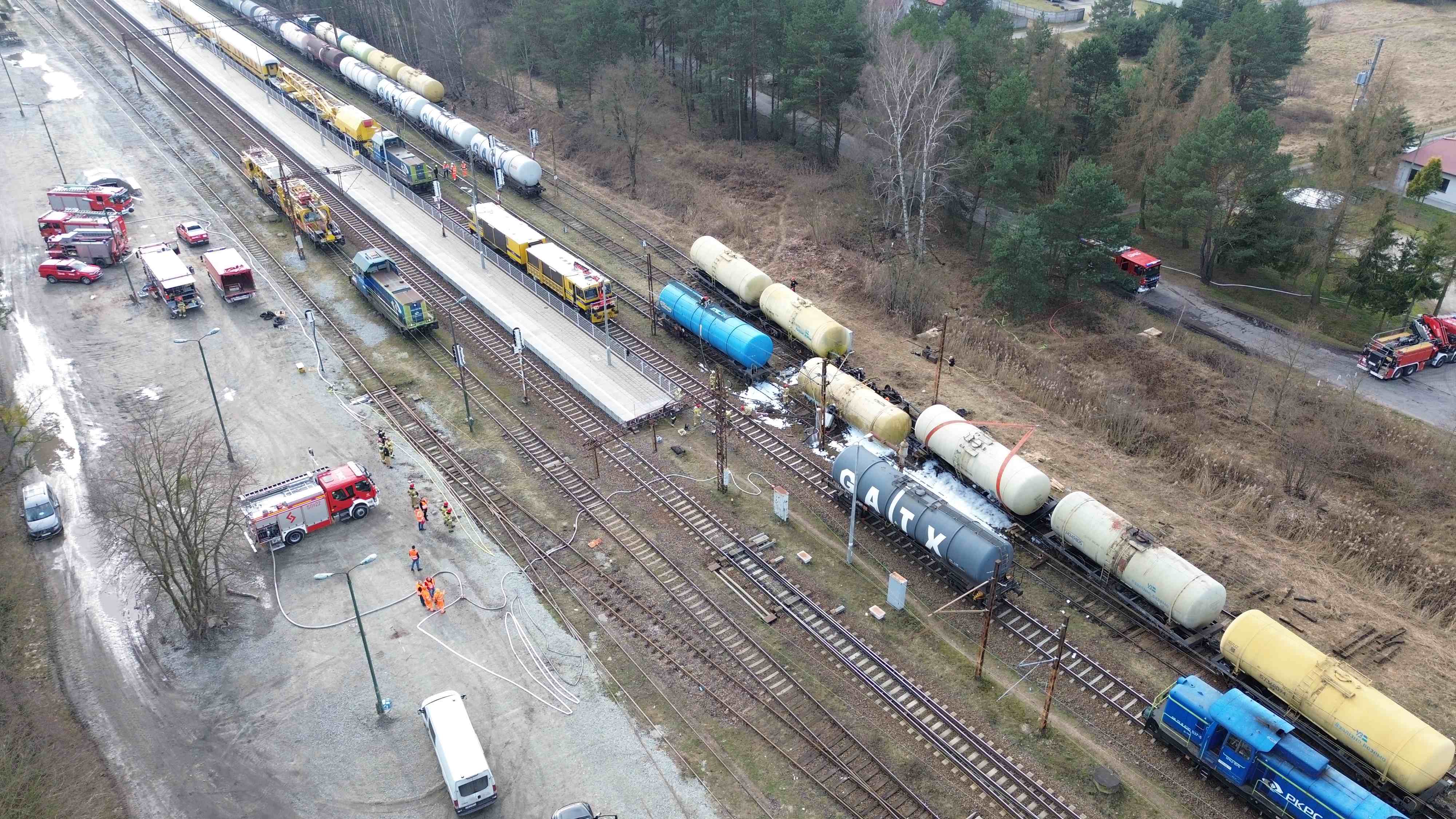 Działania Specjalistycznej Grupy Ratownictwa Technicznego polegały na wykonaniu przy użyciu podkładów drewnianych i dźwigu ratowniczego stabilizacji przechylonej cysterny, aby nie doszło do jej przewrócenia. Wspólnie z pracownikami PKP Cargo rozłączono nieuszkodzone od uszkodzonych cystern i zabrano je z miejsca zdarzenia z wykorzystaniem lokomotywy spalinowej.