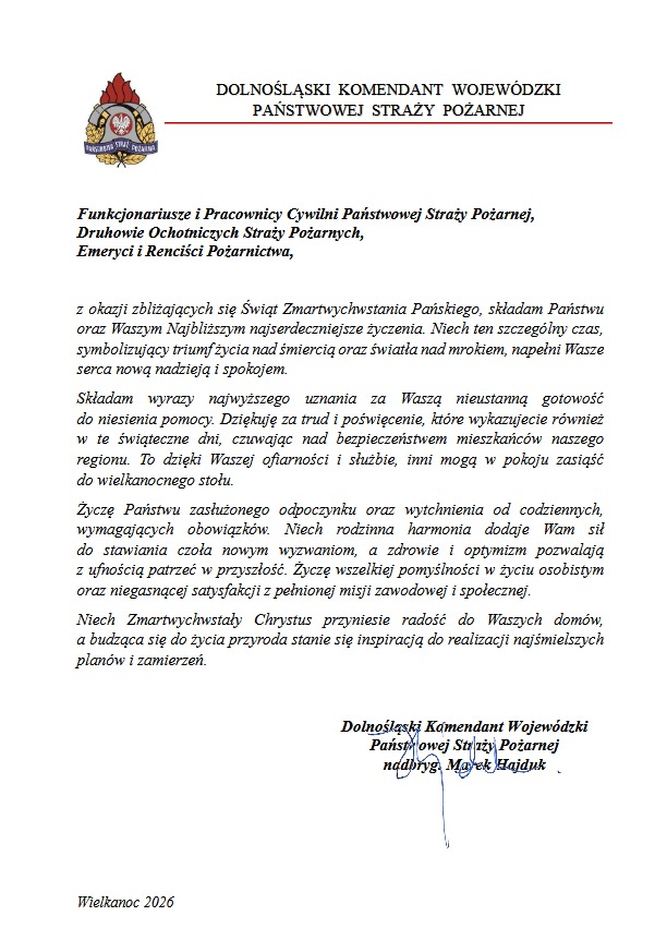 Życzenia Wielkanocne Dolnośląskiego Komendanta Wojewódzkiego Państwowej Straży Pożarnej