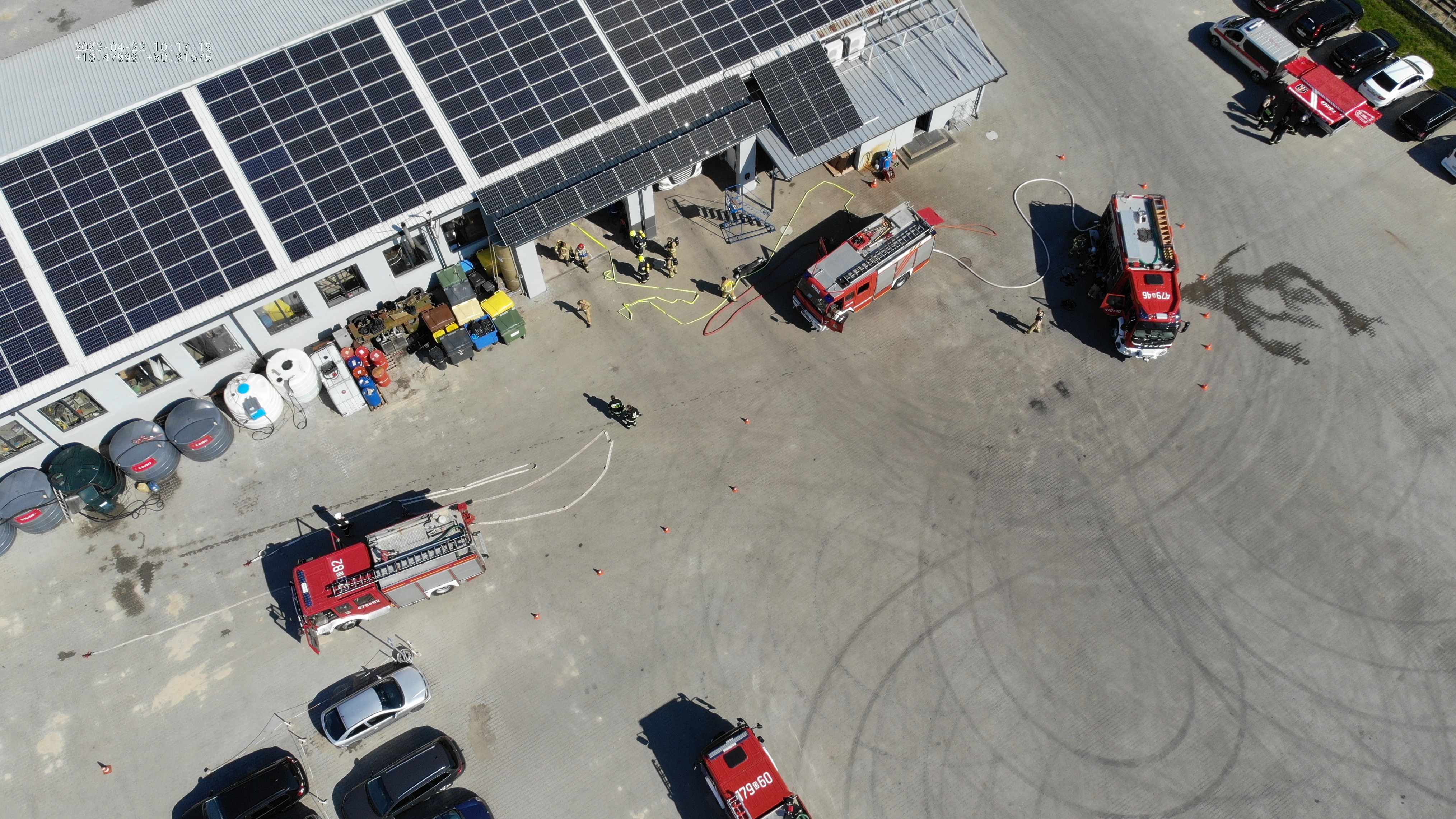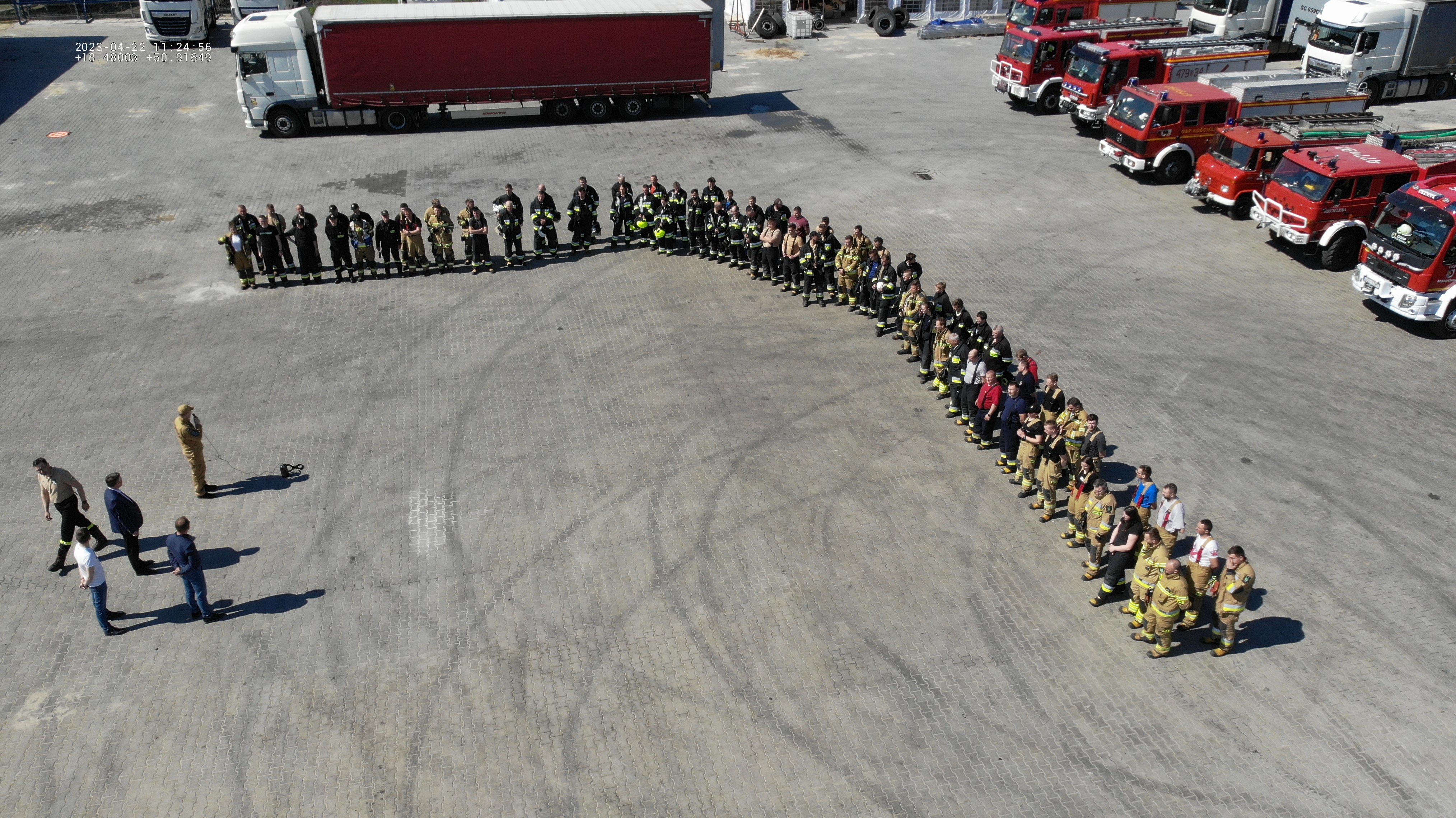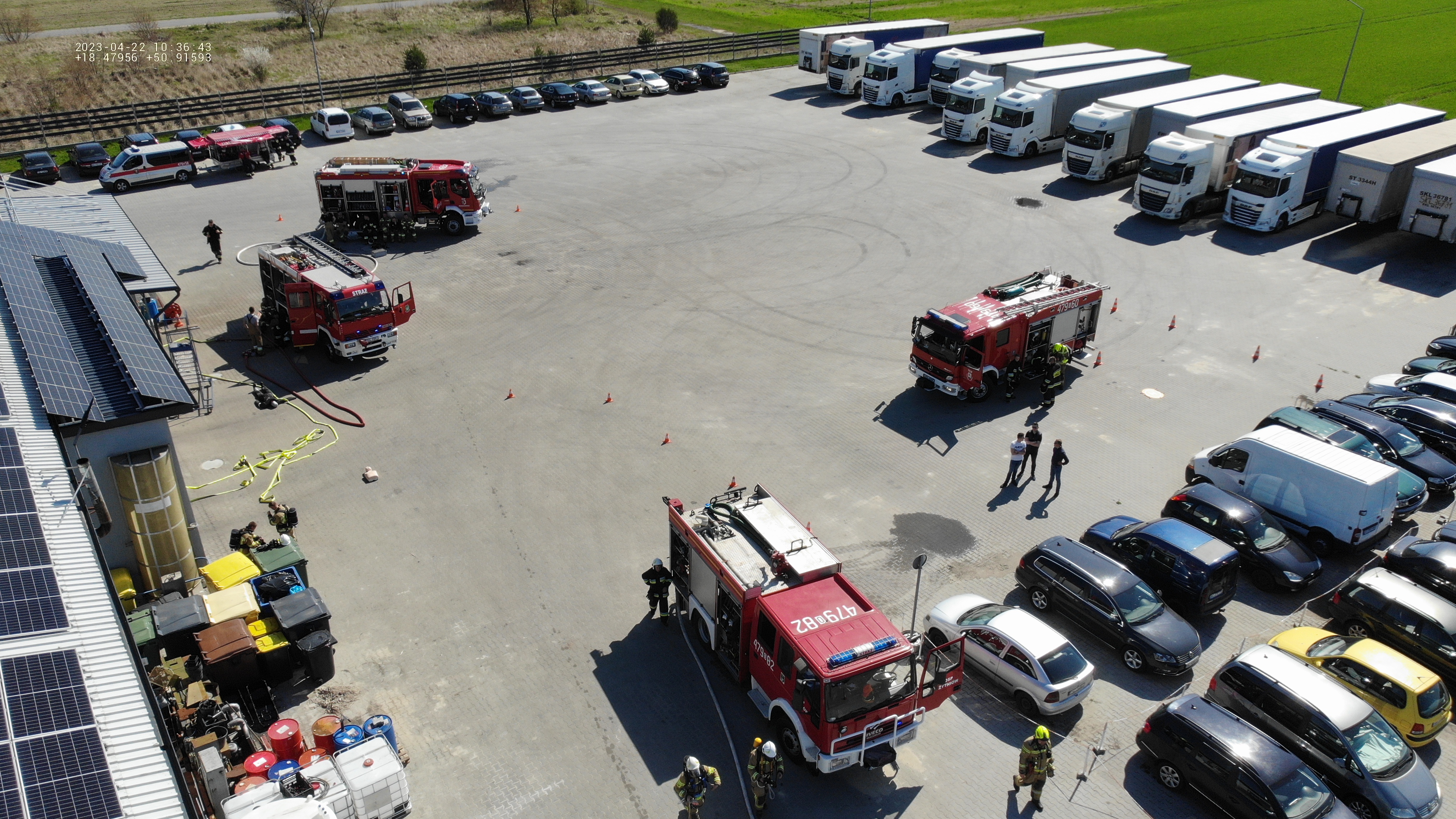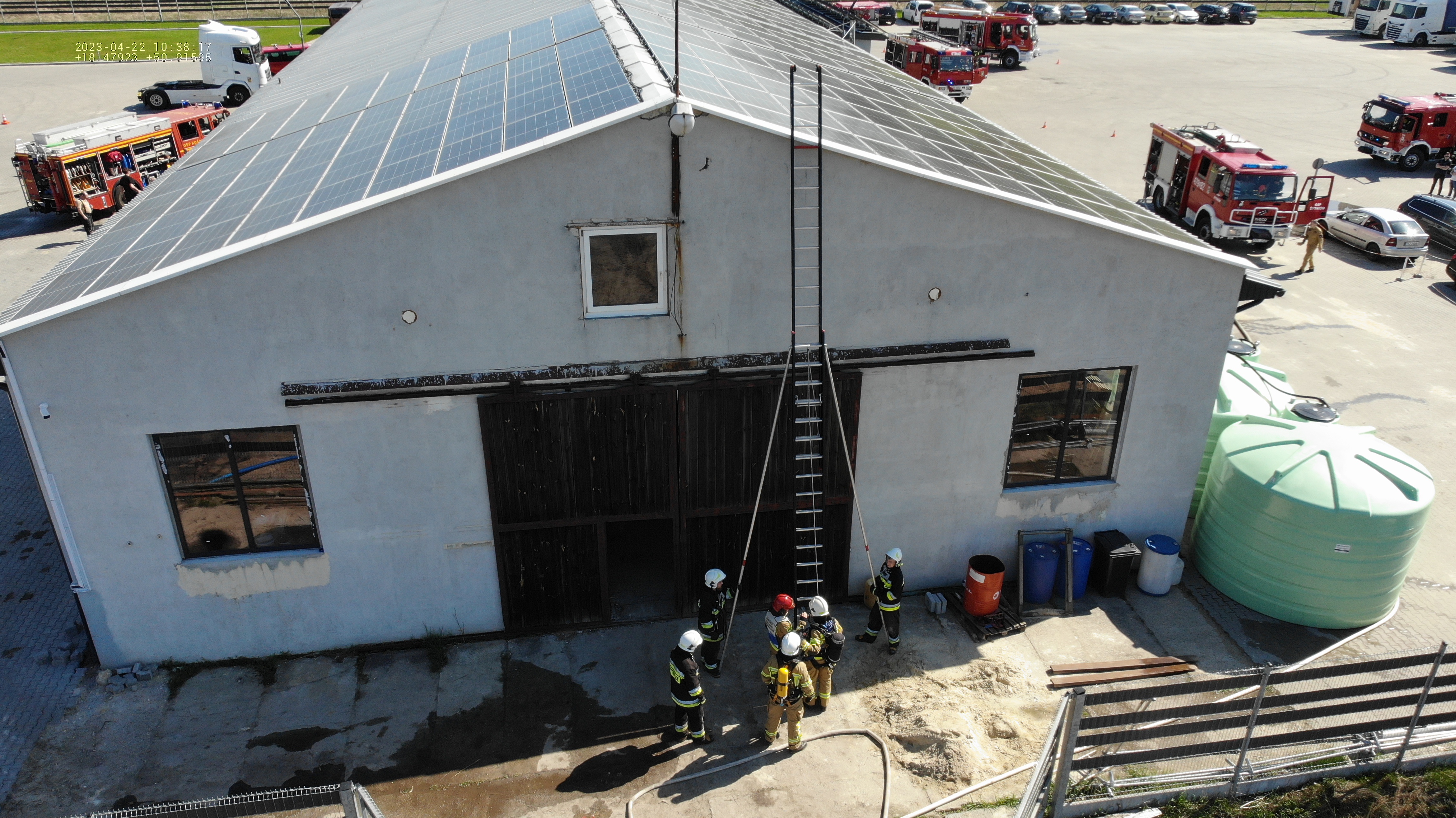 W sobotę 22.04.2023 r. na terenie firmy "Dobosz Trans" zorganizowane zostały ćwiczenia jednostek OSP KSRG z terenu powiatu oleskiego. Tematem przewodnim było doskonalenie umiejętności strażaków OSP przy pożarach obiektów produkcyjnio magazynowych w szczególniości: