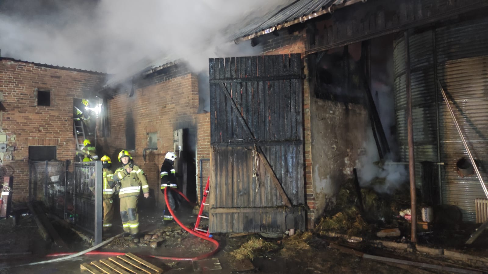 Po przybyciu na miejsce zdarzenia pierwszych zastępów straży pożarnej zastano rozwinięty pożar budynku gospodarczego. Właściciele we własnym zakresie próbowali ratować zwierzęta i mienie. Działania straży pożarnej polegały na podaniu prądów wody na pożar, działaniach obronnych w celu niedopuszczenia przeniesienia pożaru na budynek inwentarski w którym znajdowały się zwierzęta oraz obronie budynku mieszkalnego który znajdował się blisko pożaru. W tym samym czasie prowadzono również ewakuacje zwierząt i mienia. W budynkach znajdowało się 60 świń i 8 byków. Spalone siano i słomę z poddasza (około 150 m3) wywieziono na pobliskie pole, opróżniono palące się zboże w silosach (około 150 t). Całkowitemu spaleniu uległ dach na budynku gospodarczym. Wstępnie starty powstałe w wyniku zdarzenia oszacowano na 1 milion 200 tys. zł. Akcja trwała 10 godzin i 49 minut, brało w niej udział 19 zastępów straży pożarnej, policja i pogotowie energetyczne. Przypuszczalną przyczyną zdarzenia było prawdopodobnie zwarcie instalacji elektrycznej.