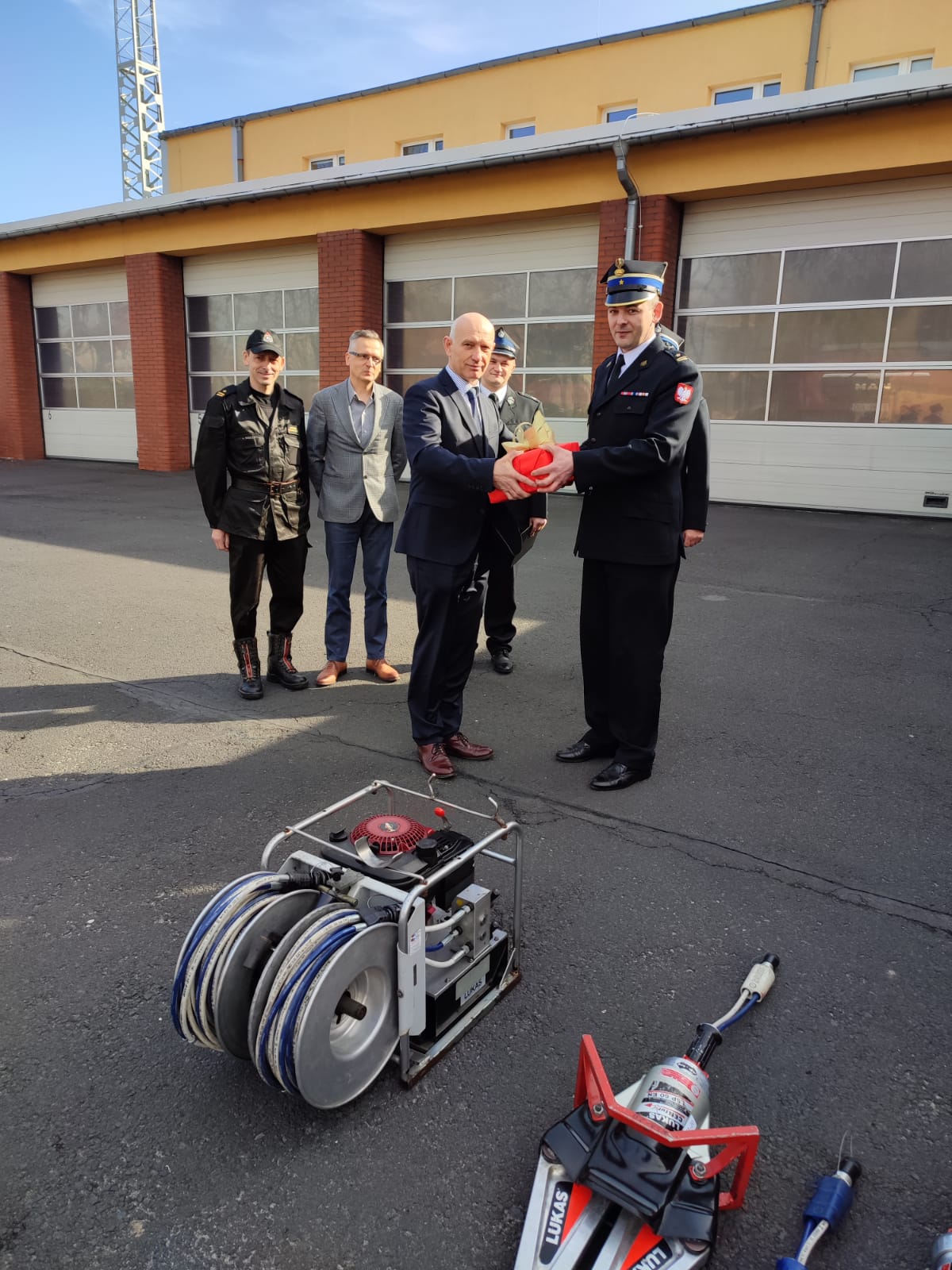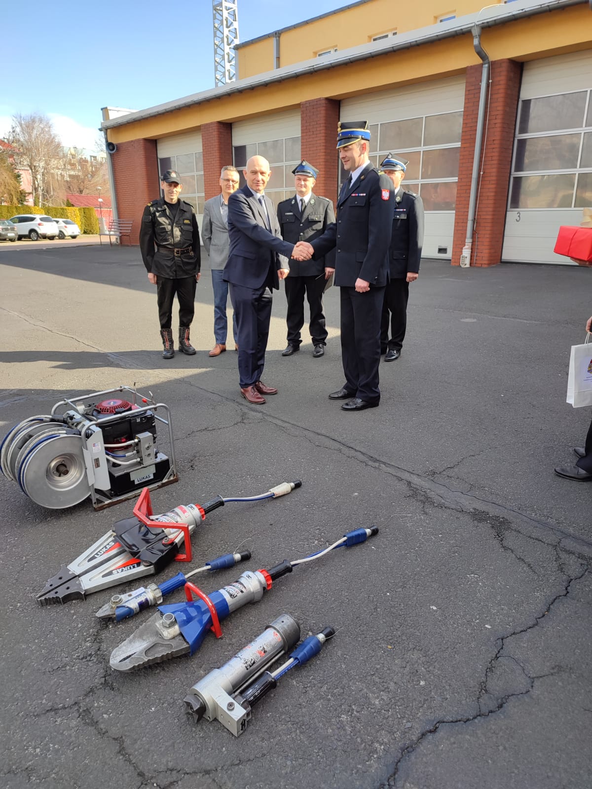 Sprzęt do tej pory używany był przez JRG w Oleśnie. W skład zestawu wchodzi: agregat hydrauliczna, nożyce, rozpieracz ramieniowy, cylinder rozpierający oraz nożyce do cięcia pedałów. Oficjalnego przekazania dokonał Komendant Powiatowy PSP w Oleśnie na ręce Burmistrza Praszki. Natomiast Burmistrz Praszki przekazał dla JRG w Oleśnie defibrylator.