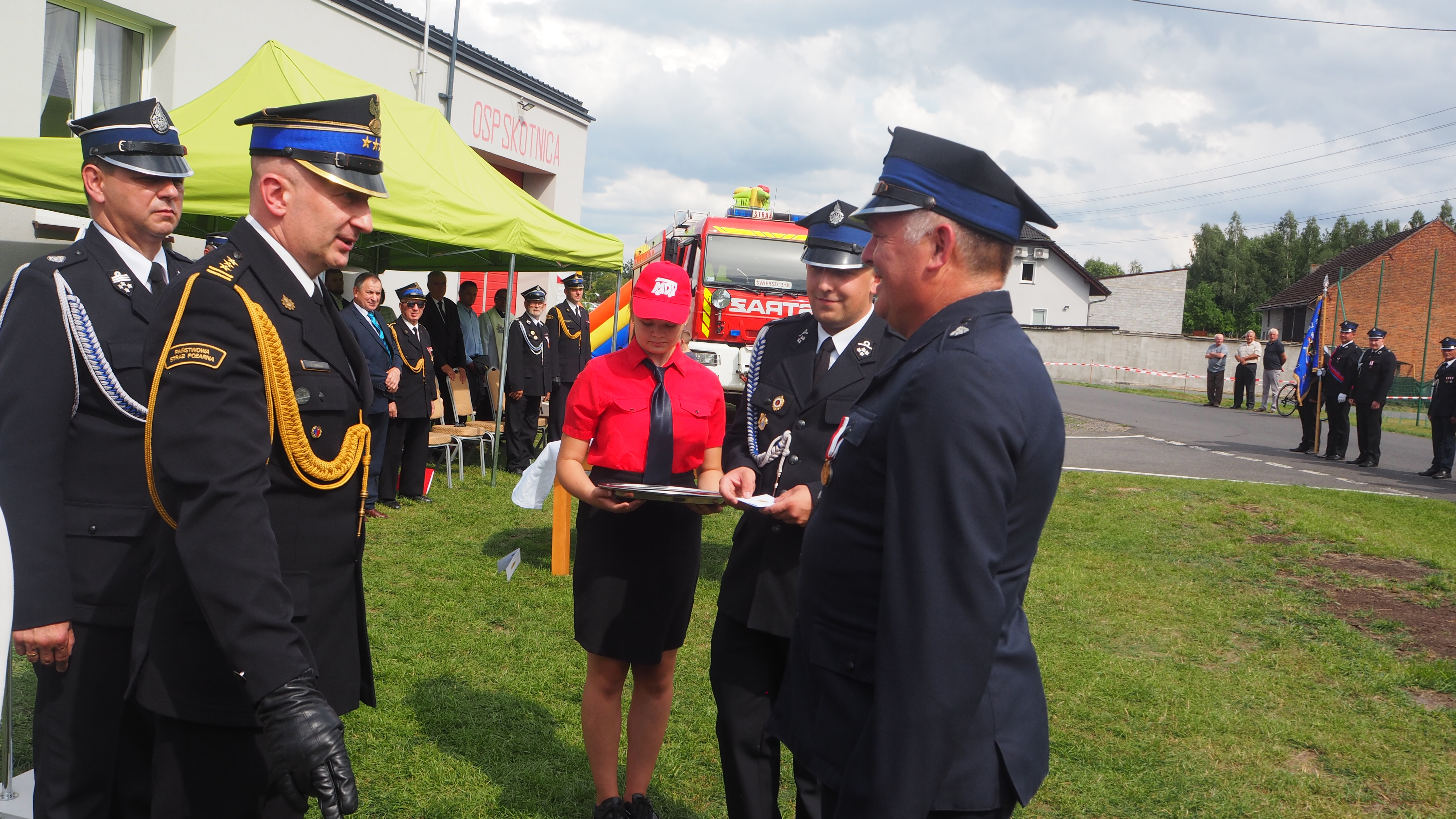 Podczas oficjalnej części uroczystości zaproszeni goście gratulowali jednostce sztandaru, samochodu oraz podkreślali profesjonalizm i ciągłą gotowość strażaków Ochotniczej Straży Pożarnej w Skotnicy do niesienia pomocy potrzebującym.