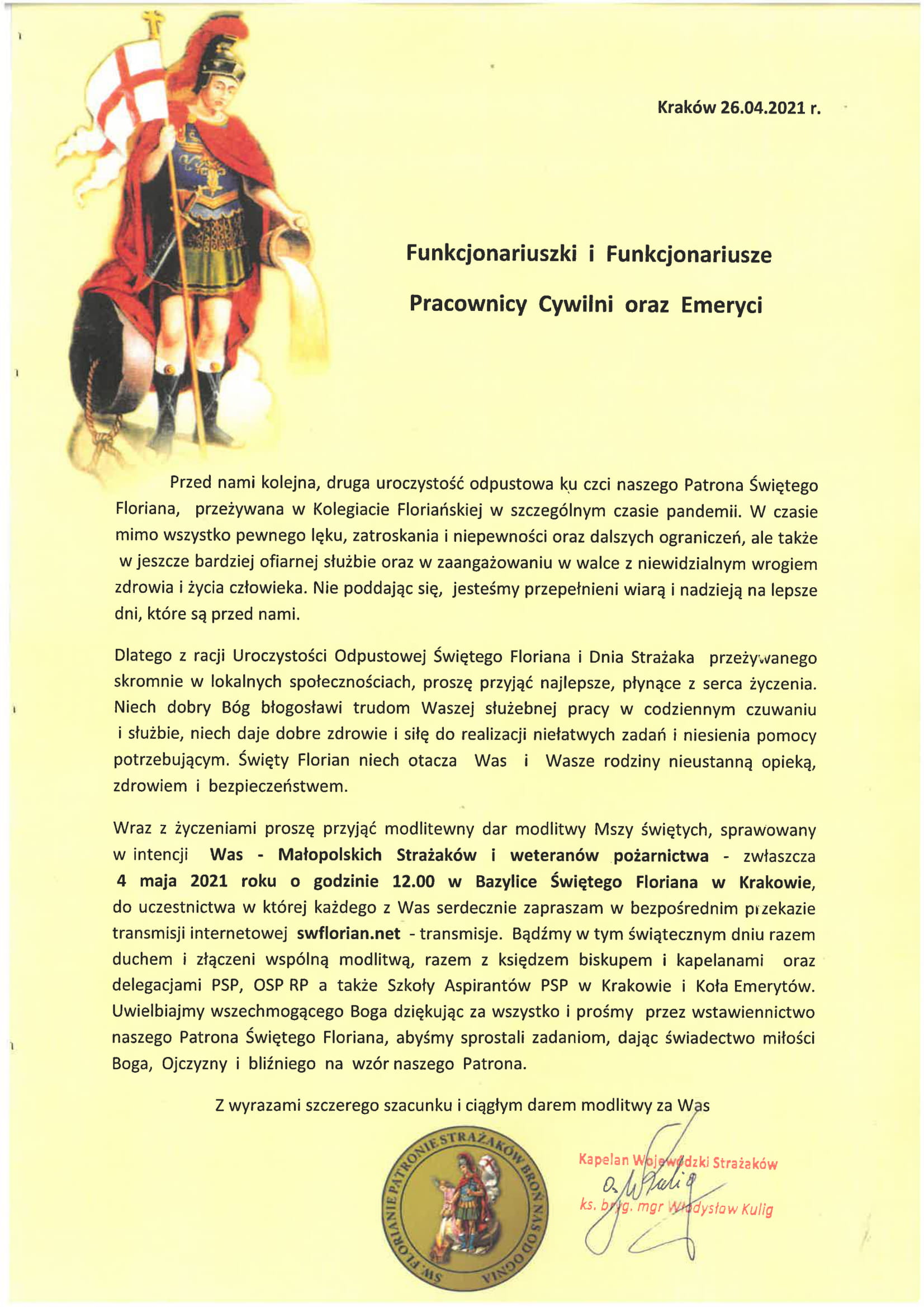 List Kapelana Małopolskich Strażaków z okazji Dnia Strażaka 2021 r.