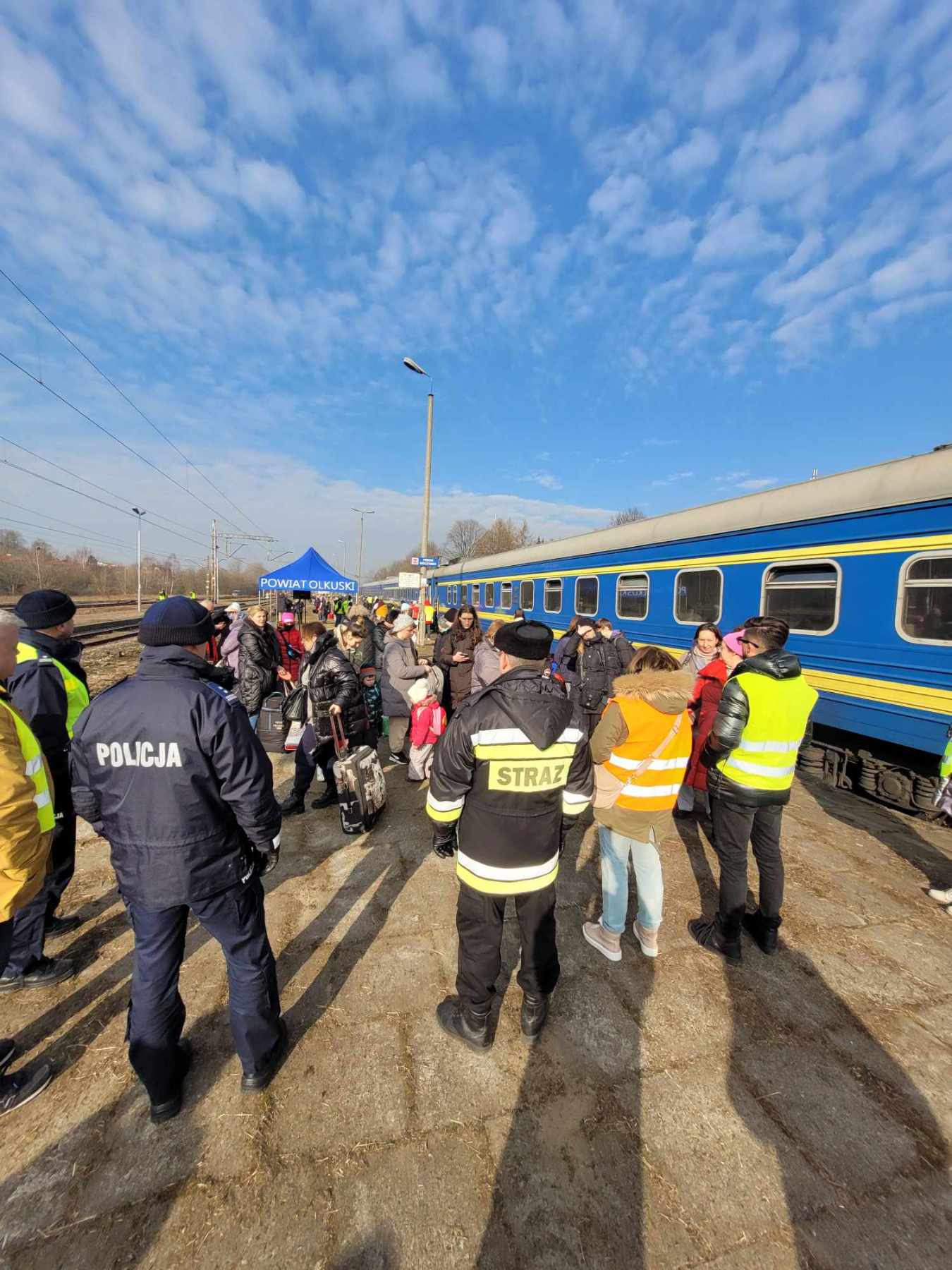 Strażacy Komendy Powiatowej Państwowej Straży Pożarnej w Olkuszu na czele z Komendantem i Zastępcą Komendanta Powiatowego wraz z powołanym sztabem oraz druhowie Ochotniczych Straży Pożarnych z powiatu olkuskiego pomagali przy organizacji i obsłudze technicznej miasteczka namiotowego oraz wraz z samorządowcami i innymi zaangażowanymi podmiotami nieśli pomoc przybyłym uchodźcom.