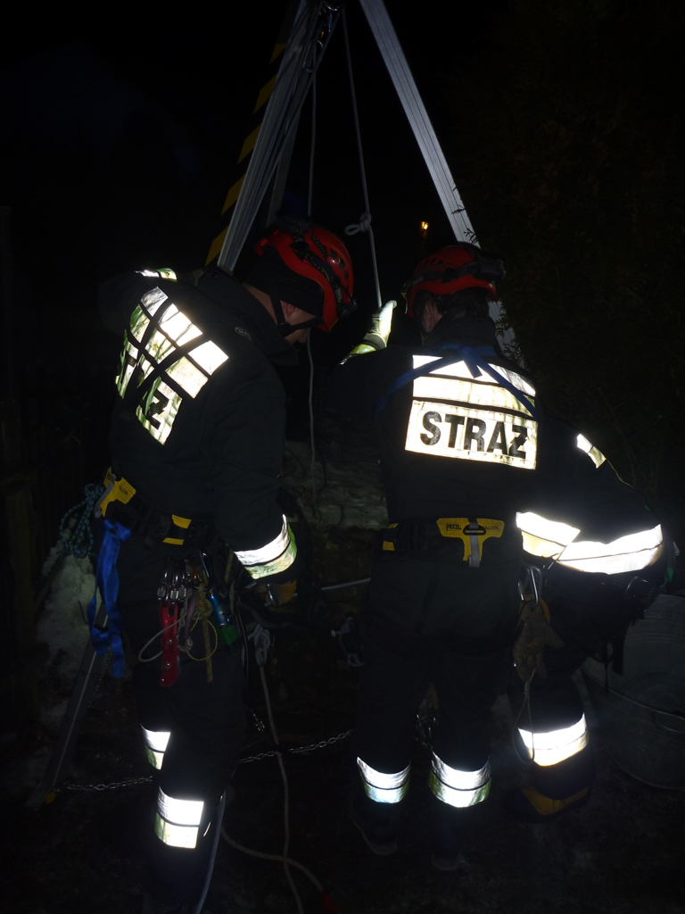 KDR po ocenie sytuacji i ewentualnych zagrożeniach dla ratowników, podjął decyzję o wydobyciu psa ze studni. Ratownik w szelkach, wyposażony w aparat OUO, czujnik bezruchu, detektor wielogazowy, sprzęt oświetleniowy i łączności został opuszczony do studni przy pomocy urządzenia ratowniczego i zabezpieczony dodatkowo linką stalową z ratowniczego urządzenia podnoszącego, wchodzącego w skład zestawu ratowniczego. Pozostali ratownicy wyposażeni w szelki oraz podpięci do elementów stałych przy pomocy lonż asekuracyjnych zabezpieczali zejście ratownika w dół studni. Niestety zakres pracy urządzeń JRG PSP Olkusz skończył się na 25 metrze a do dna studni pozostało jeszcze ok. 7 metrów. W takiej sytuacji KDR zdecydował o powrocie ratownika na powierzchnię, a w międzyczasie zadysponowano Specjalistyczną Grupę Ratownictwa Wysokościowego „Kraków 3” z JRG Nr 3 KM PSP w Krakowie. Po podjęciu ponownej próby zejścia przez ratownika SGRW, działania ratownicze zakończyły się sukcesem, pies został wydobyty ze studni i przekazany właścicielowi.