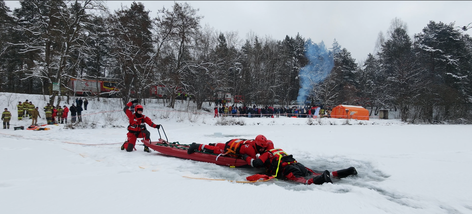 z zakresu ratownictwa lodowego dla strażaków JRG Olkusz. Ćwiczenia były kontynuacją programowego tematu wchodzącego w cykl doskonalenia zawodowego strażaków. Ćwiczenia strażaków połączone zostały z prewencją społeczną wśród młodzieży i dorosłych dotyczącą niebezpieczeństw i sposobu samoratowania, a także udzielania pomocy podczas zagrożeń tego typu. Strażacy przeprowadzili pokaz samoratowania, ratowania za pomocą przygodnego sprzętu w postaci sanek, szalika, kija, linki, czyli tak naprawdę przygodnych sprzętów. Naszym celem było pokazanie i uświadomienie młodzieży i dorosłym, że NIE MA BEZPIECZNEJ POKRYWY LODOWEJ, a jeśli znajdziemy się w sytuacji kryzysowej to miejmy podstawy do podjęcia próby samoratowania bądź udzielenia pomocy. Uczestnicy pokazu mieli możliwość obserwacji ćwiczeń strażaków JRG Olkusz z użyciem sań lodowych oraz bezprzyrządowego sposobu ewakuacji osób z akwenów pokrytych lodem. Dodatkowym zadaniem i wyzwaniem dla ćwiczących, było podanie kolców lodowych osobie w wodzie, z pomocą drona. Okazuje się że to kolejny przykład na zastosowanie Bezzałogowego Statku Powietrznego.