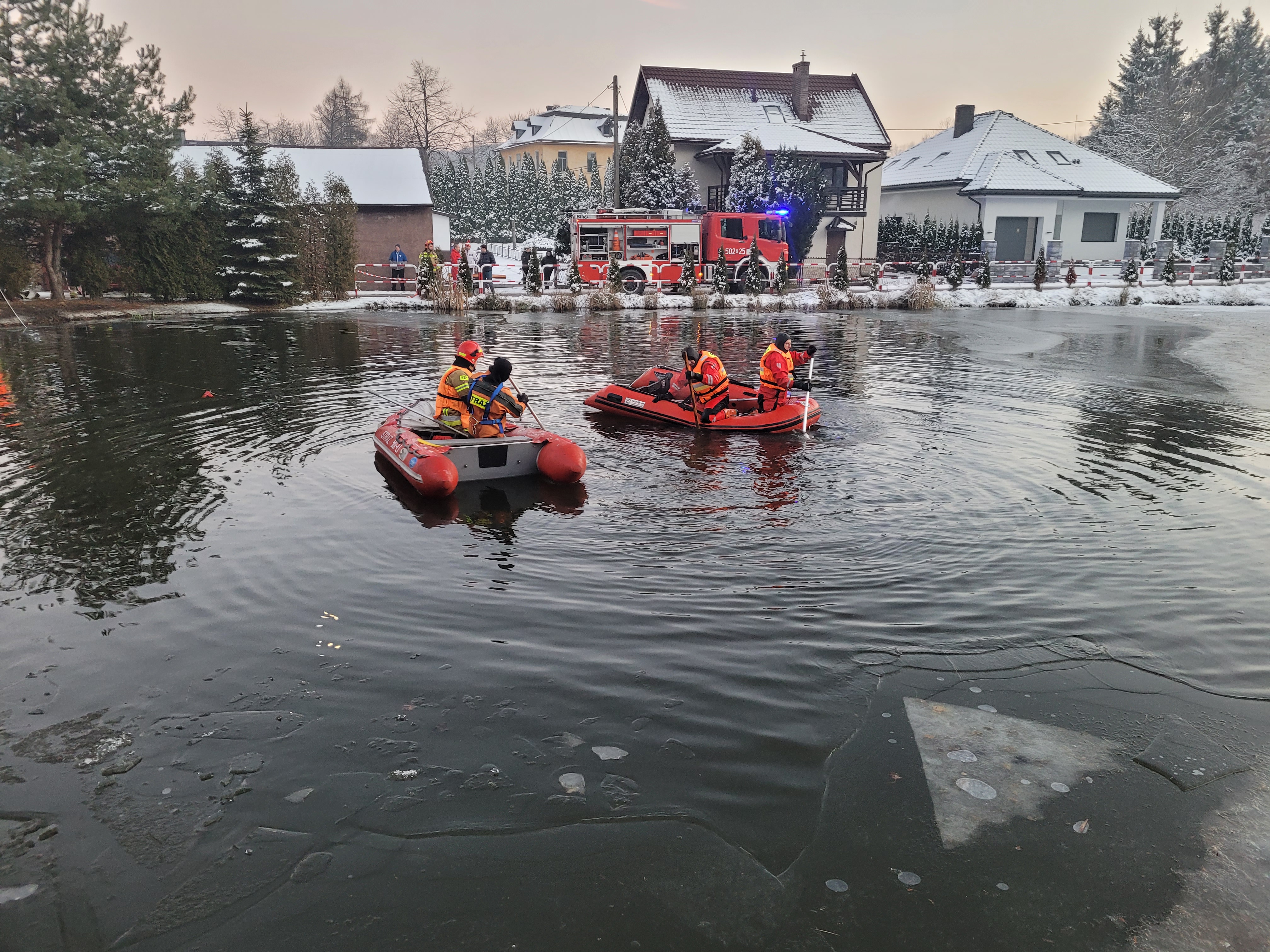 W dniu 13 grudnia 2021 r. o godzinie 14.47, Dyżurny Stanowiska Kierowania Komendanta Powiatowego Państwowej Straży Pożarnej w Olkuszu otrzymał zgłoszenie, że w stawie w Wolbromiu przy ul. Pod Lasem topią się dwie osoby. Po przybyciu na miejsce zdarzenia strażacy z Jednostki Ratowniczo-Gaśniczej w Wolbromiu zastali następującą sytuację: pod czterema osobami załamał się lód na akwenie wodnym. Jedna osoba samodzielnie wydostała się na brzeg, jest pod opieką policji w radiowozie, pozostałe trzy osoby znajdują się pod lustrem wody częściowo zamarzniętego zbiornika wodnego. Policja wskazała miejsce w którym doszło do załamania lodu. Działania strażaków polegały na zabezpieczeniu miejsca zdarzenia przed dostępem osób postronnych, zwodowaniu pontonu z dwoma ratownikami i przeszukiwaniu dna akwenu w celu lokalizacji i ewakuacji znajdujących się pod wodą mężczyzn. Po około 30 minutach od rozpoczęcia działań ratowniczych zlokalizowano pierwszego mężczyznę. Poszkodowany mężczyzna lat 28 został ewakuowany na brzeg i przekazany będącemu na miejscu zdarzenia Zespołowi Ratownictwa Medycznego, który natychmiast rozpoczął Medyczne Czynności Ratunkowe względem osoby poszkodowanej. Niestety działania te nie przywróciły funkcji życiowych poszkodowanemu i stwierdzono zgon mężczyzny. Po przyjeździe na miejsce zdarzenia zastępów z Jednostki Ratowniczo-Gaśniczej w Olkuszu, wprowadzono do działań drugi ponton z ratownikami i kontynuowano działania zmierzające do zlokalizowania dwóch pozostałych osób znajdujących się pod wodą. W kolejnej fazie działań na miejsce przybyli strażacy z Specjalistycznej Grupy Ratownictwa Wodno-Nurkowego z Krakowa, wyposażeni w sprzęt do nurkowania. Wprowadzony do działań ratowniczych nurek odnalazł dwóch pozostałych mężczyzn, którzy natychmiast zostali ewakuowani z wody i przekazani personelowi Zespołu Ratownictwa Medycznego. Obecny na miejscu lekarz stwierdził zgon obu poszkodowanych. Do działań zadysponowane były siły i środki z Państwowej Straży Pożarnej z Wolbromia, Olkusza, Krakowa i Nowego Targu oraz Ochotniczej Straży Pożarnej z Wierzchowiska, Zarzecza i Gołaczew. Ponadto w działaniach uczestniczyły służby współdziałające: Policja, Prokurator, Zespoły Ratownictwa Medycznego, ratownicy WOPR oddział w Olkuszu.