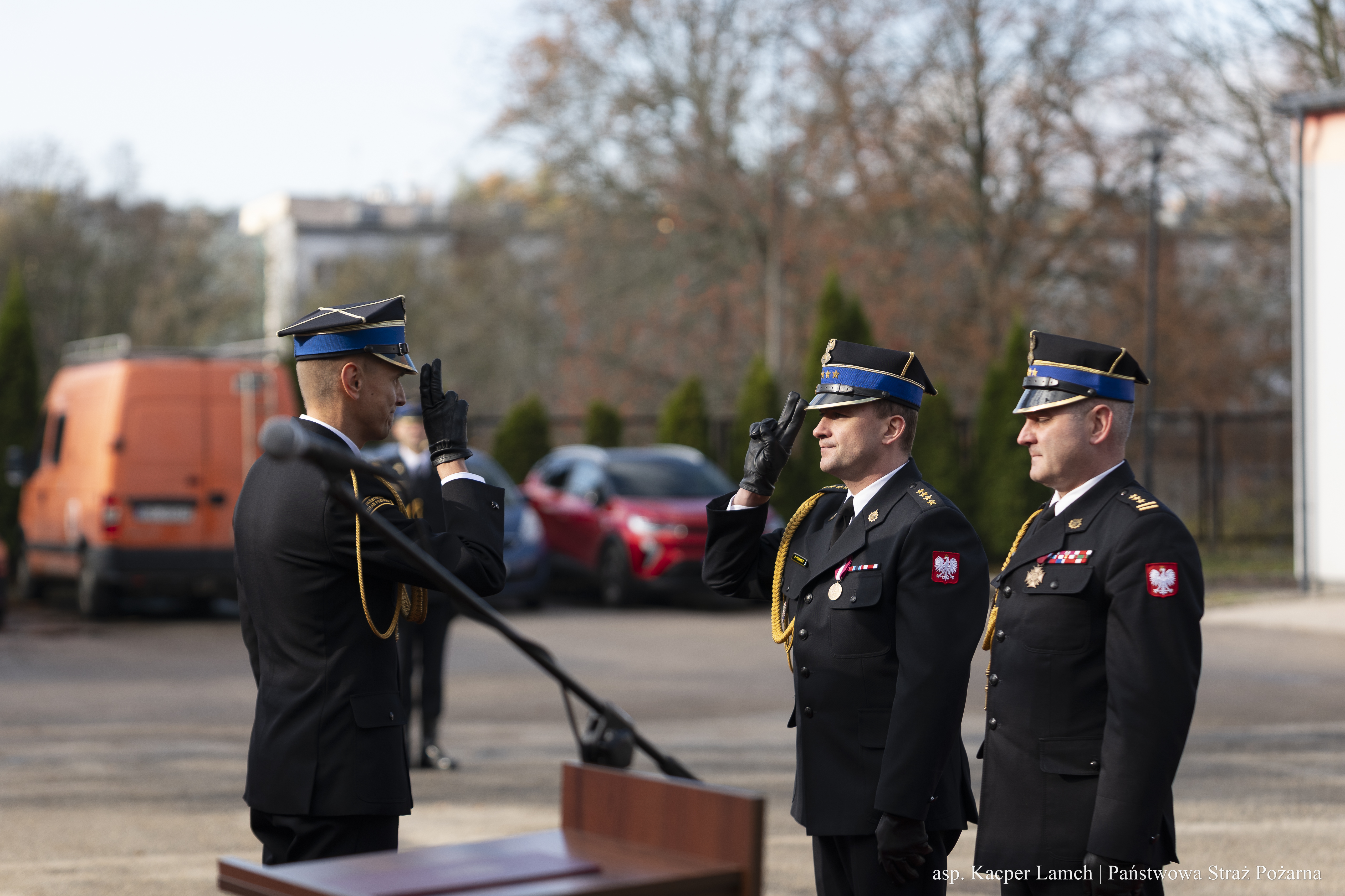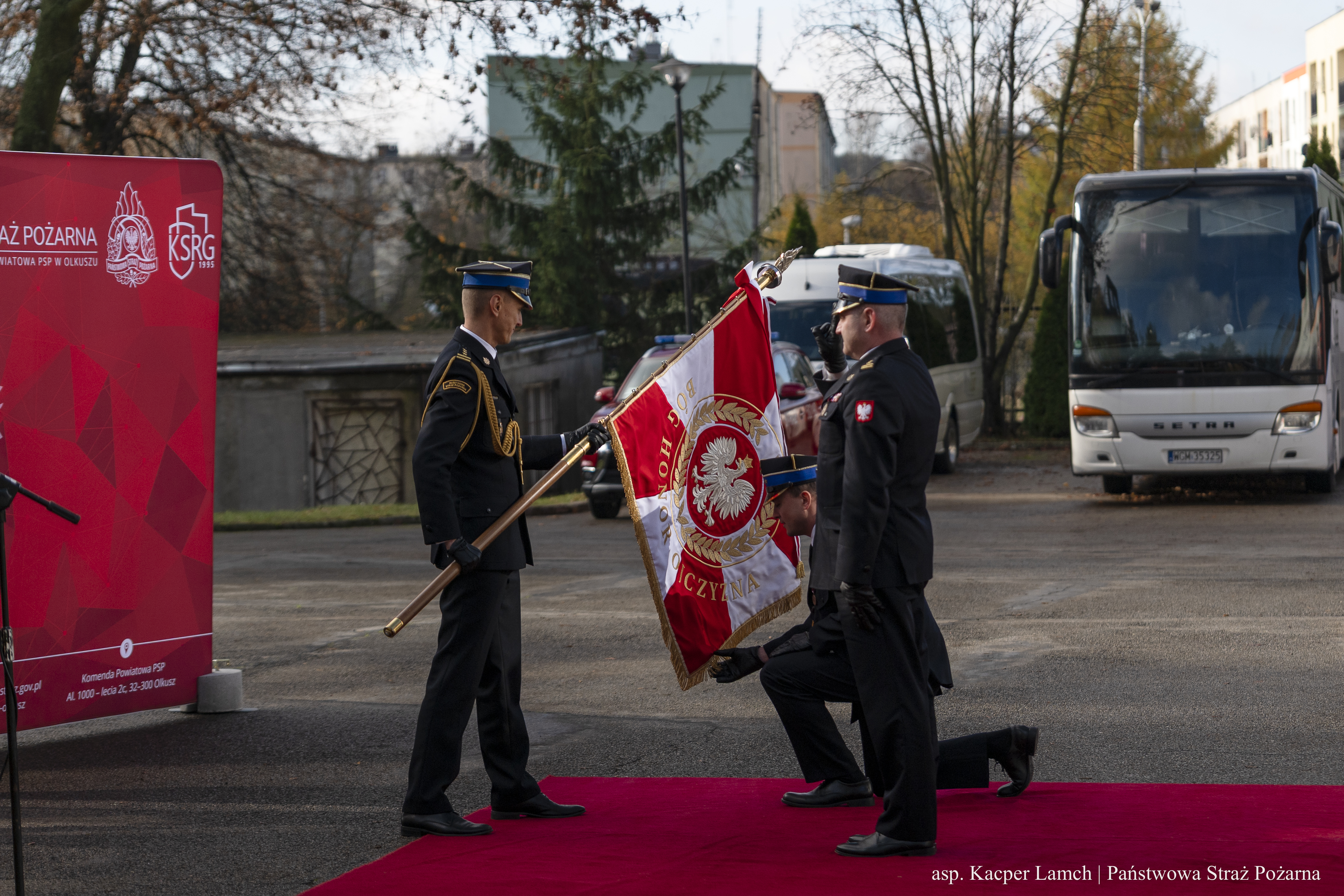 st. kpt. Mateusza Podsiadło. Zgodnie z decyzją st. bryg. Przemysława Przęczka Małopolskiego Komendanta Wojewódzkiego PSP z dniem 22 września 2025 roku st. kpt. Mateusz Podsiadło został powołany na stanowisko Komendanta Powiatowego PSP w Olkuszu. Dzisiejszy apel miał charakter symboliczny i był okazją do uroczystego przekazania sztandaru Komendy Powiatowej Państwowej Straży Pożarnej w Olkuszu przez st. bryg. Michała Polaka byłego Komendanta Powiatowego PSP w Olkuszu, a obecnie Z-cy Małopolskiego Komendanta Wojewódzkiego PSP obecnemu Komendantowi Powiatowemu PSP w Olkuszu st. kpt. Mateuszowi Podsiadło. Uroczystość odbyła się w obecności strażaków i pracowników cywilnych tutejszej komendy oraz zaproszonych gości w osobach: