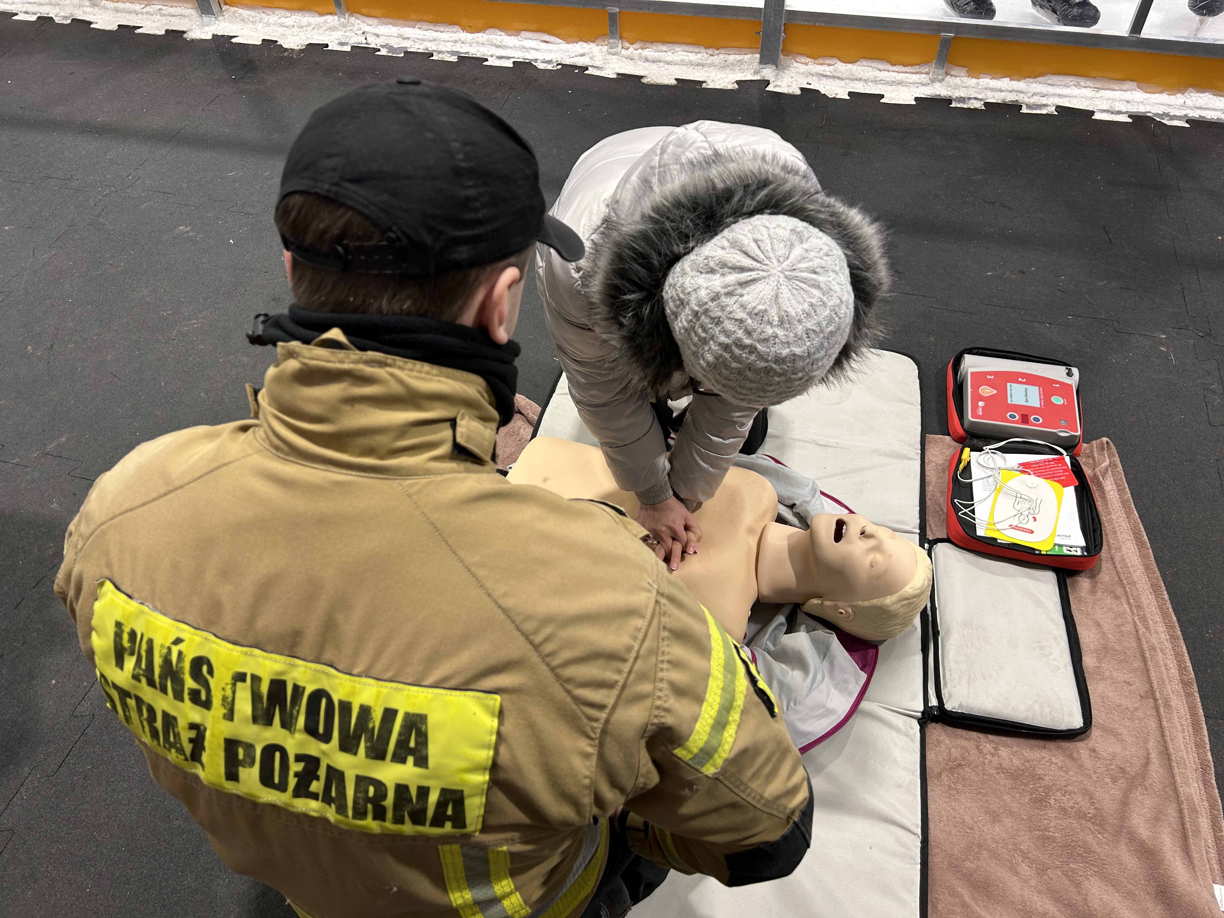 8 lutego 2025 r. na olkuskim lodowisku w Miejskim Ośrodku Sportu Rekreacji „Czarna Góra”, strażacy Komendy Powiatowej PSP w Olkuszu wraz z policjantami Komendy Powiatowej Policji w Olkuszu zorganizowali spotkanie z dziećmi i młodzieżą, mające na celu przybliżenie zasad bezpieczeństwa podczas zimowych zabaw. W ramach akcji „Kręci mnie bezpieczeństwo na stoku” funkcjonariusze przybliżyli zainteresowanym zasady bezpiecznego zachowania podczas wszelkiego rodzaju aktywności sportowej na śniegu, lodowisku oraz w ruchu drogowym. Dodatkową atrakcją była możliwość przeprowadzenia resuscytacji krążeniowo oddechowej u osoby poszkodowanej. Wiele osób, także dorosłych, miało możliwość pierwszy raz w życiu przeprowadzić RKO na profesjonalnym fantomie. Podczas pogadanek zwiększyliśmy świadomość uczestników spotkania, na tematy pierwszej pomocy oraz ogólnie pojętego bezpieczeństwa, tak podczas zabawy jak i codziennego życia. Strażacy z policjantami kolejny raz współdziałali w ramach szeroko rozumianej prewencji społecznej, przekazując niezbędną wiedzę najmłodszym oraz dorosłym mieszkańcom powiatu olkuskiego.