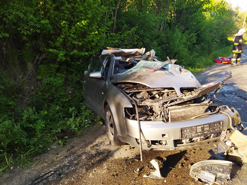W dniu 22 maja 2021 r. o godzinie 17:52, Dyżurny Stanowiska Kierowania Komendanta Powiatowego w Olkuszu otrzymał zgłoszenie o wypadku dwóch samochodów (osobowy i ciężarowy) w miejscowości Glanów. Po przybyciu na miejsce zdarzenia strażacy stwierdzili: zderzenie samochodu osobowego z ciężarowym, jedna osoba poszkodowana kierujący samochodem osobowym pozostaje w pojeździe, ruch zablokowany w obu kierunkach. Działania straży polegały na: zabezpieczeniu miejsca zdarzenia przed dostępem osób postronnych poprzez rozstawienie pachołków ostrzegawczych oraz znaków drogowych "wypadek" na długości 150 metrów, udzieleniu Kwalifikowanej Pomocy Przedmedycznej osobie poszkodowanej, (stabilizacja odcinka szyjnego kręgosłupa, tlenoterapia, wsparcie psychiczne, opatrzenie rany głowy), w tym samym czasie dokonano stabilizacji pojazdu za pomocą klinów schodkowych, odłączeniu akumulatora, a także przy pomocy narzędzi hydraulicznych wykonywano dostęp do zakleszczonych nóg poszkodowanego. Po wykonaniu dostępu ewakuacja rannego kierowcy odbyła się w asyście lekarza Zespół Ratownictwa Medycznego przybyłego na miejsce zdarzenia. Dalsze działania polegały na pomocy w stabilizacji złamanej ręki oraz transporcie poszkodowanego do karetki (poszkodowany został przetransportowany do Szpitalnego Oddziału Ratunkowego w Miechowie). Kierujący samochodem ciężarowym po przebadaniu odmówił udzielenia Kwalifikowanej Pomocy Przedmedycznej. Następnie usunięto z jezdni płyny eksploatacyjne które, wyciekły z uszkodzonego pojazdu oraz inne uszkodzone elementy pojazdu. W trakcie wykonywania ww. czynności kierujący pojazdem ciężarowym zasłabł. Poszkodowanemu udzielono Kwalifikowanej Pomocy Przedmedycznej (wsparcie psychiczne, tlenoterapia) jednocześnie zadysponowano Zespół Ratownictwa Medycznego, który po przybyciu na miejsce i przebadaniu poszkodowanego zabrał go do Szpitalnego Oddziału Ratunkowego w Olkuszu. W działaniach udział brały 2 zastępy straży pożarnej z Jednostki Ratowniczo-Gaśniczej PSP w Wolbromiu, 2 zastępy z OSP Glanów, 1 zastęp z OSP Trzyciąż, 4 radiowozy Policja i 2 Zespoły Ratownictwa Medycznego.