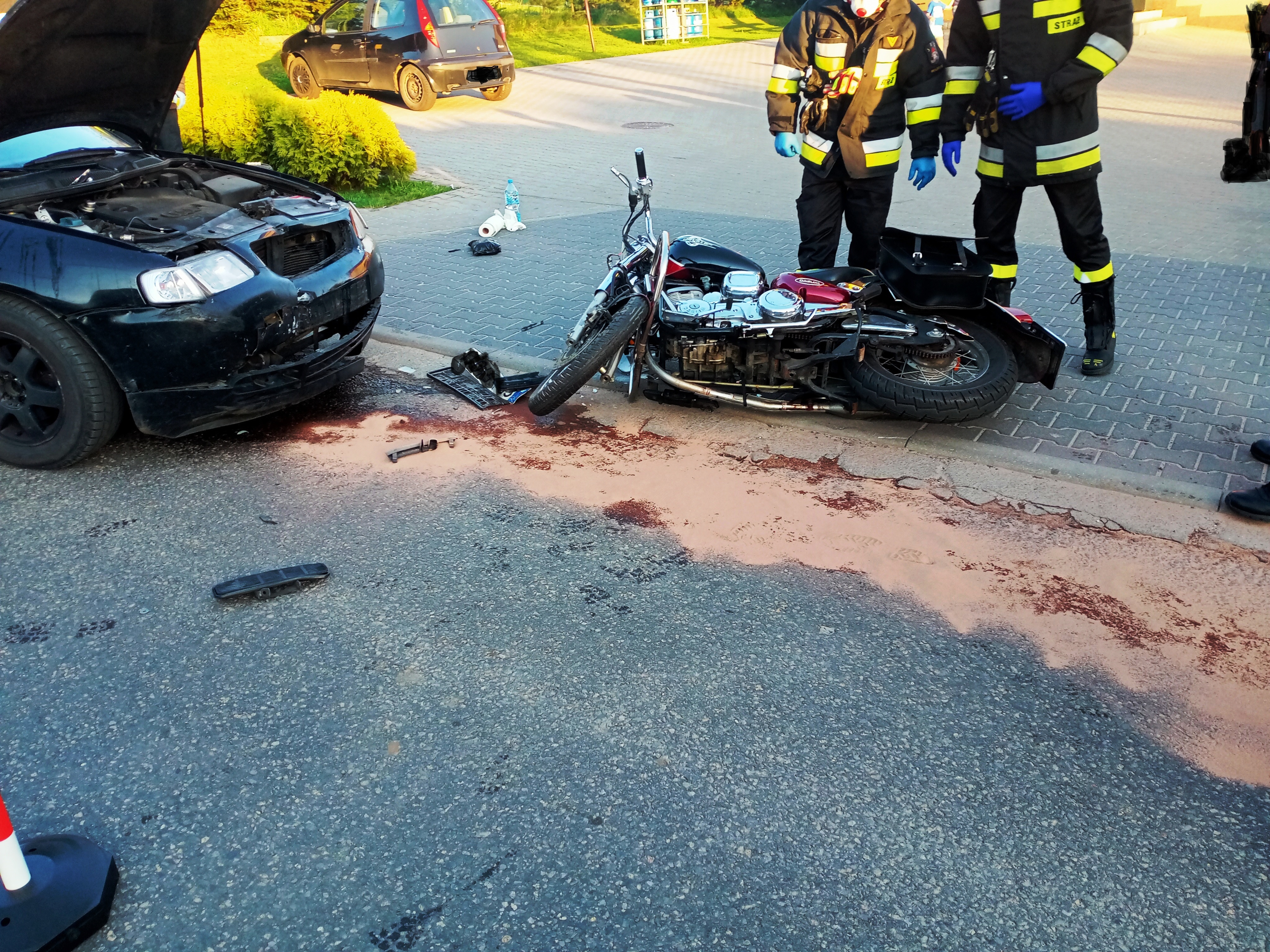 W dniu 12 maj 2021 r. około godziny 19, Dyżurny Stanowiska Kierowania Komendanta Powiatowego w Olkuszu otrzymał zgłoszenie o wypadku motocykla i samochodu osobowego w miejscowości Dłużec. Po przybyciu na miejsce zdarzenia strażacy stwierdzili zderzenie samochodu osobowego z motocyklem. Jedna osoba poszkodowana kierujący motocyklem, ruch na drodze odbywa się wahadłowo. Działania strażaków polegały na: udzieleniu Kwalifikowanej Pomocy Przedmedycznej poszkodowanemu mężczyźnie (wywiad ratowniczy, badanie urazowe, opatrzenie zranionej nogi, wsparcie psychiczne), zabezpieczeniu miejsca zdarzenia przed dostępem osób postronnych, odłączeniu akumulatorów w pojazdach. W kolejnej fazie działań usunięto z jezdni plamę substancji ropopochodnej za pomocą sorbentu. Poszkodowany kierowca motocykla został zabrany przez Zespół Ratownictwa Medycznego do szpitala w Olkuszu. W działaniach udział brały 2 zastępy straży pożarnej z Jednostki Ratowniczo-Gaśniczej PSP w Wolbromiu, 1 zastęp z OSP w Dłużcu, Policja oraz Zespół Ratownictwa Medycznego.
