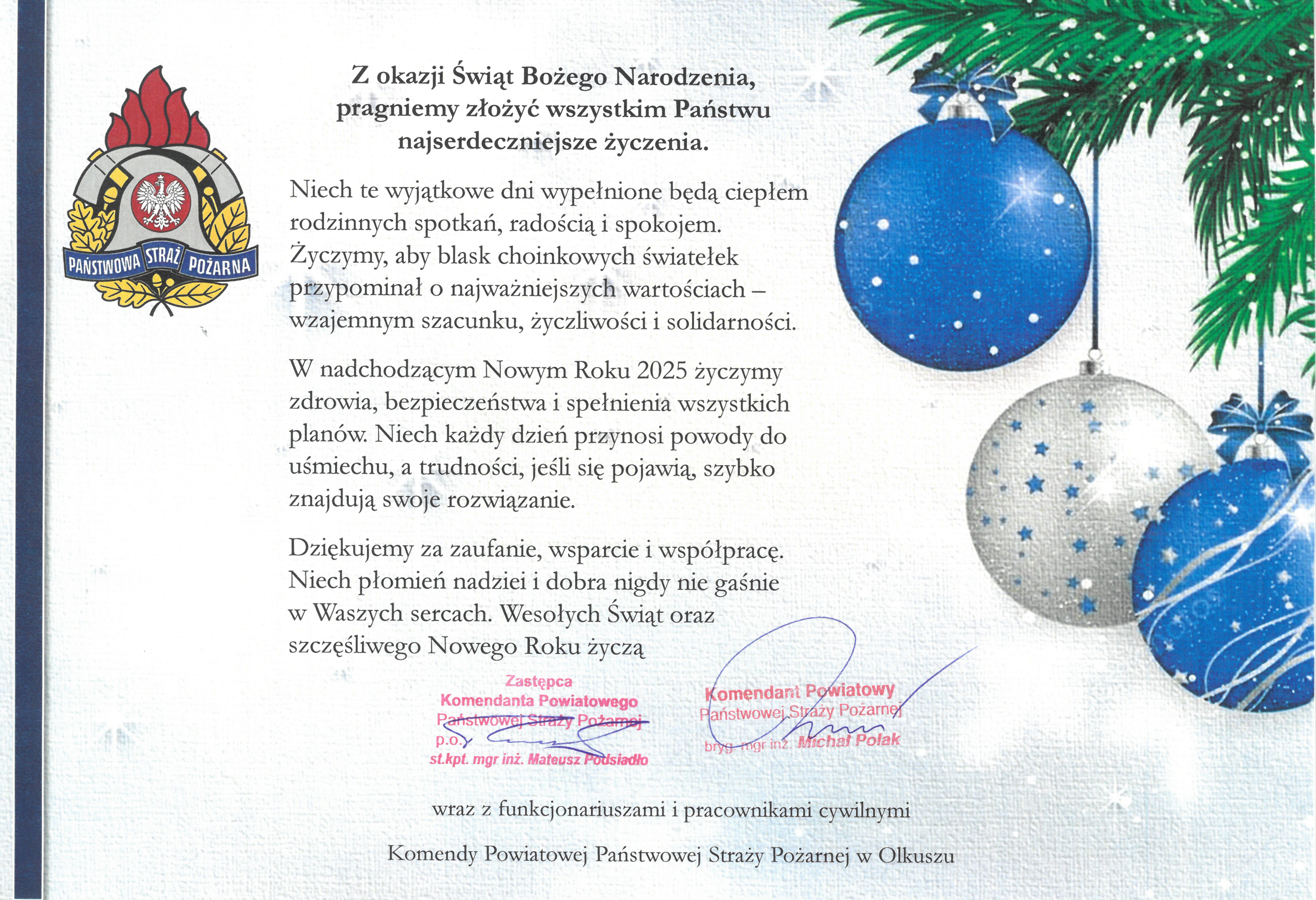 Dziękujemy za zaufanie, wsparcie i współpracę. Niech płomień nadziei i dobra nigdy nie gaśnie w Waszych sercach. Wesołych Świąt oraz szczęśliwego Nowego Roku życzą Komendant Powiatowy, Zastępca Komendanta Powiatowego wraz z funkcjonariuszami i pracownikami cywilnymi Komendy Powiatowej Państwowej Straży Pożarnej w Olkuszu
