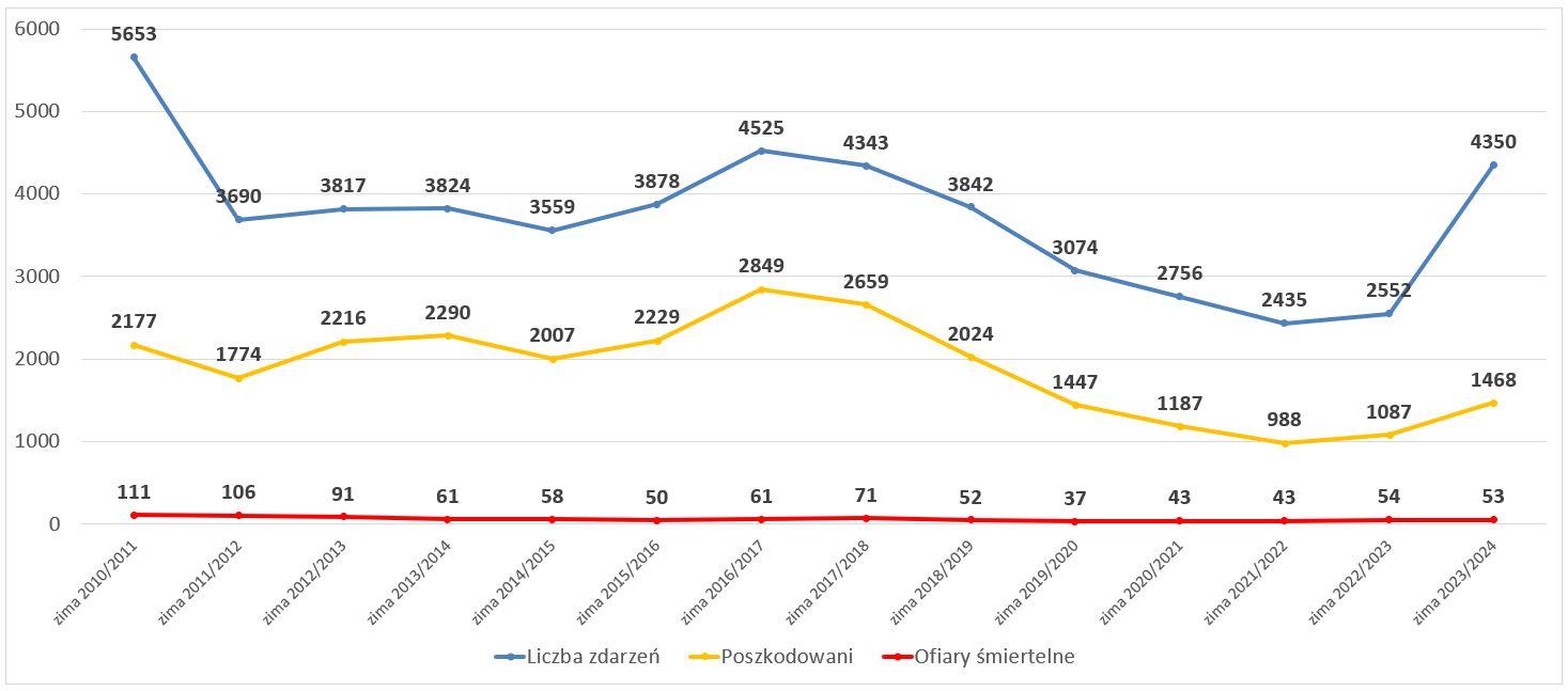 Liczba zdarzeń związanych z tlenkiem węgla, liczba poszkodowanych i ofiar śmiertelnych w wybranych sezonach grzewczych: