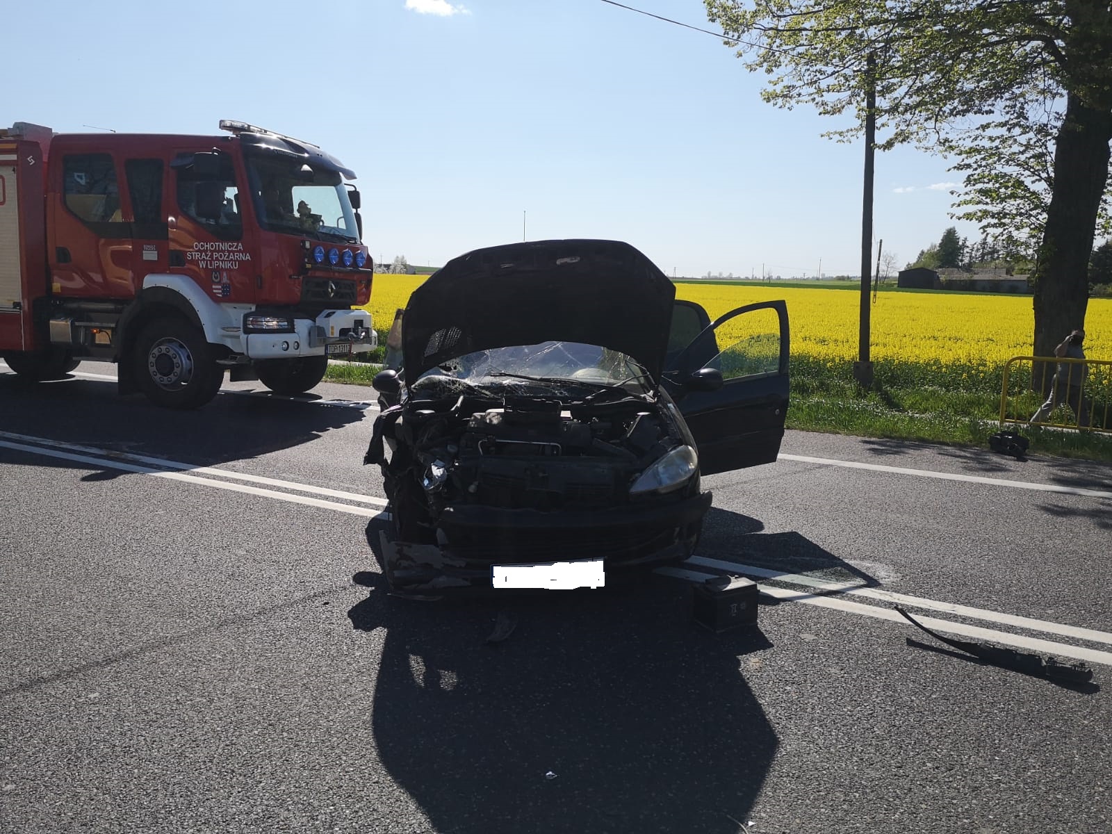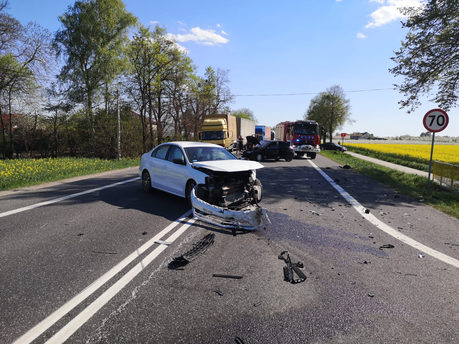 Po przybyciu na miejsce zdarzenia stwierdzono, że doszło do zderzenia samochodów VW Jetta oraz Peugeot. Pojazdy znajdowały się na obu pasach blokując przejazd w obu kierunkach. Działania zastępów straży pożarnej polegały na zabezpieczeniu miejsca zdarzenia, udzieleniu kwalifikowanej pierwszej pomocy kierującej jednym z pojazdów, jednocześnie odłączono akumulatory w obu pojazdach biorących udział w zdarzeniu. Po wstępnym zaopatrzeniu ranną kobietę Zespół Ratownictwa Medycznego zabrał do szpitala.
