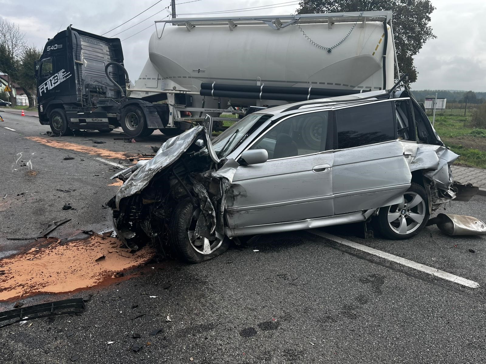 Po przybyciu na miejsce zdarzenia zastępów straży pożarnej stwierdzono, że w wyniku wypadku uszkodzone zostały dwa samochody ciężarowe oraz jeden samochód osobowy. Jeden z pojazdów ciężarowych wraz z przyczepą leżał na prawym boku w przydrożnym rowie, samochód osobowy znajdował się na środku drogi, natomiast ciągnik siodłowy z cysterną zlokalizowany był częściowo na drodze, a tylna część naczepy w rowie. Działania zastępów straży pożarnej w pierwszej fazie polegały na zabezpieczeniu miejsca zdarzenia, ewakuacji jednego z poszkodowanych z pojazdu na noszach typu deska oraz udzieleniu kwalifikowanej pierwszej pomocy wszystkim poszkodowanym. Dalsze działania polegały na odpięciu akumulatorów we wszystkich pojazdach oraz zabezpieczeniu wycieków płynów eksploatacyjnych. Trzy osoby poszkodowane po wstępnym zaopatrzeniu zostały zabrane do szpitala przez przybyłe na miejsce zdarzenia Zespoły Ratownictwa Medycznego. Pomocy uczestnikom wypadku przed przybyciem służb udzielili dwaj strażacy będący poza służbą, którzy najechali na zdarzenie. W czasie prowadzonych działań ruch drogowy był całkowicie zamknięty. Na czas czynności dochodzeniowych prowadzonych przez Policję miejsce zdarzenia było zabezpieczane przez dwa zastępy Ochotniczych Straży Pożarnych.