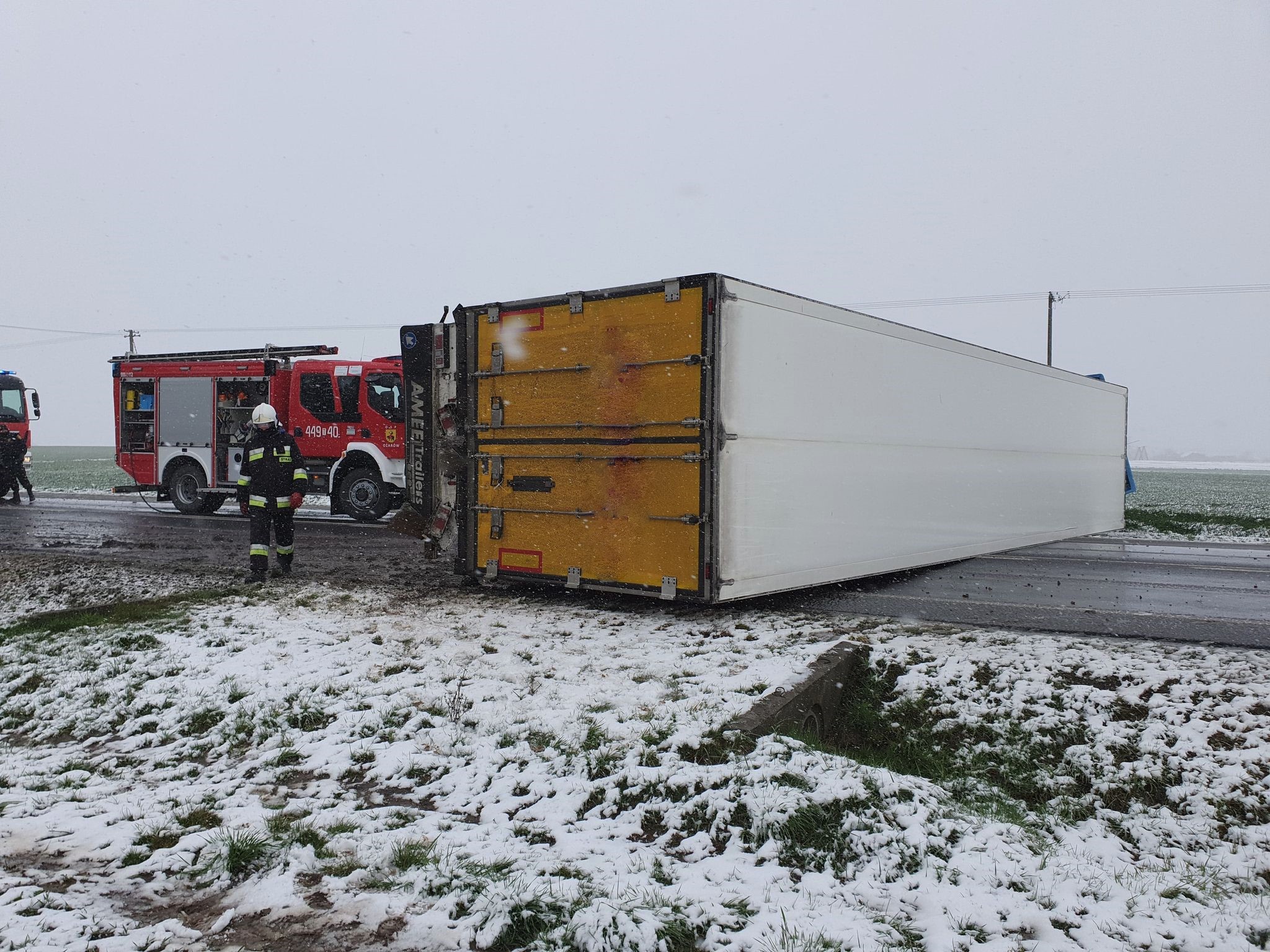 Po przybyciu na miejsce zdarzenia jednostek ochrony przeciwpożarowej stwierdzono, że na drodze krajowej nr 79 doszło do zdarzenia drogowego, w którym uczestniczył samochód ciężarowy z naczepą przewożącą przesyłki kurierskie. Samochód ciężarowy wraz z naczepą leżał na boku na drodze oraz częściowo w rowie, całkowicie blokując przejazd w obydwu kierunkach. Działania zastępów straży pożarnej polegały na zabezpieczeniu miejsca zdarzenia, udzieleniu kwalifikowanej pierwszej pomocy kierowcy, odłączeniu akumulatorów, ograniczeniu wycieku oleju napędowego poprzez podstawienie wanny wyłapującej oraz uszczelnianiu korka wlewowego zbiornika paliwa. Poszkodowanego kierowcę przekazano przybyłemu na miejsce Zespołowi Ratownictwa Medycznego, mężczyzna po przebadaniu przez ratowników medycznych pozostał na miejscu zdarzenia. Po przeprowadzeniu czynności dochodzeniowych przez Policję, pomoc drogowa przystąpiła do postawienia ciągnika siodłowego wraz z naczepą na koła oraz odholowania go na pobocze drogi udrażniając jeden pas drogowy. Po odholowaniu pojazdu z powierzchni drogi usunięto pozostałości powypadkowe.