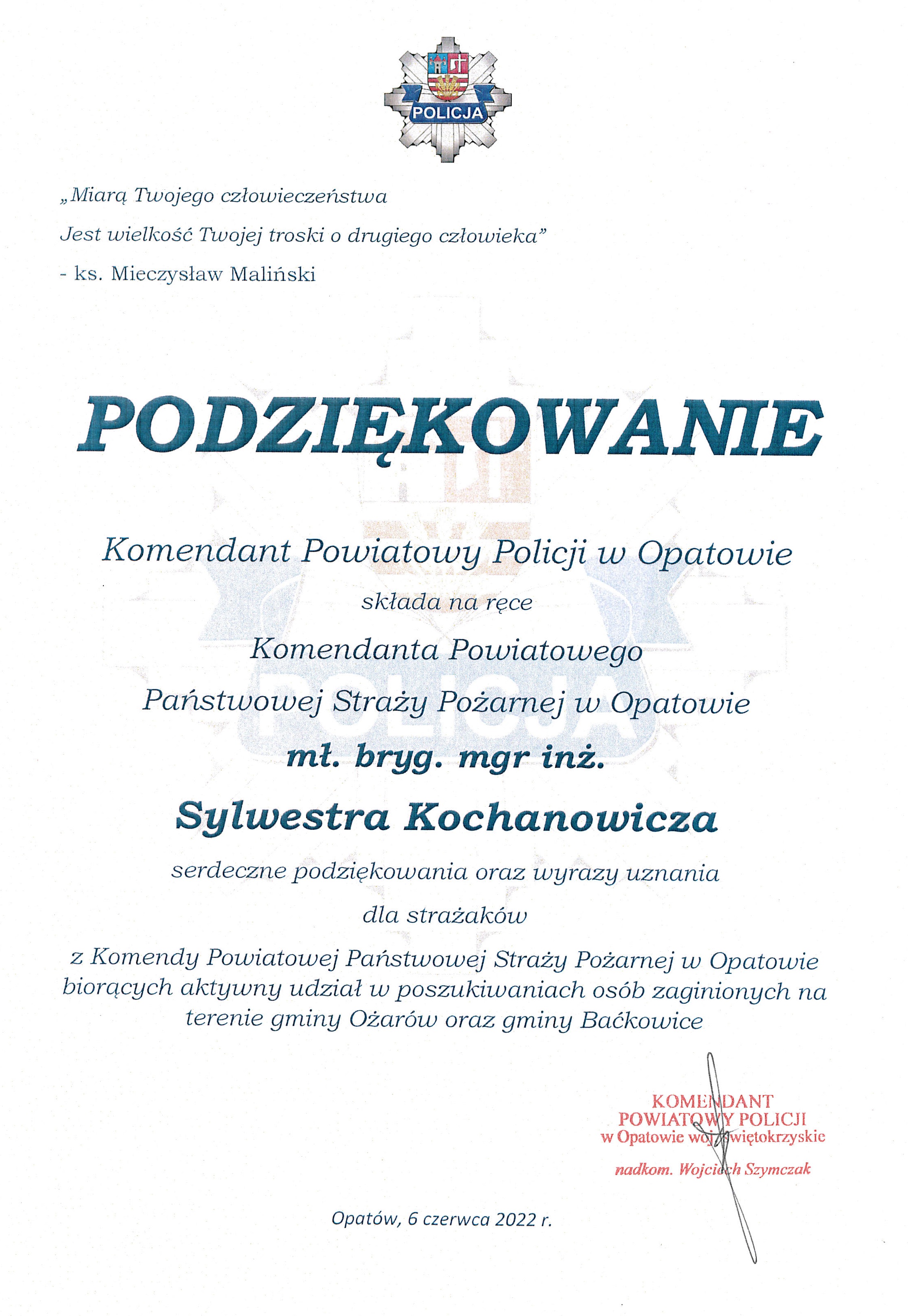 Komendant Powiatowy Policji w Opatowie nadkom. Wojciech Szymczak oraz opatowscy policjanci pragną podziękować strażakom z Komendy Powiatowej Państwowej Straży Pożarnej w Opatowie oraz druhom jednostek OSP z terenu powiatu opatowskiego za aktywny udział w poszukiwaniach osób zaginionych na terenie gminy Ożarów oraz gminy Baćkowice.