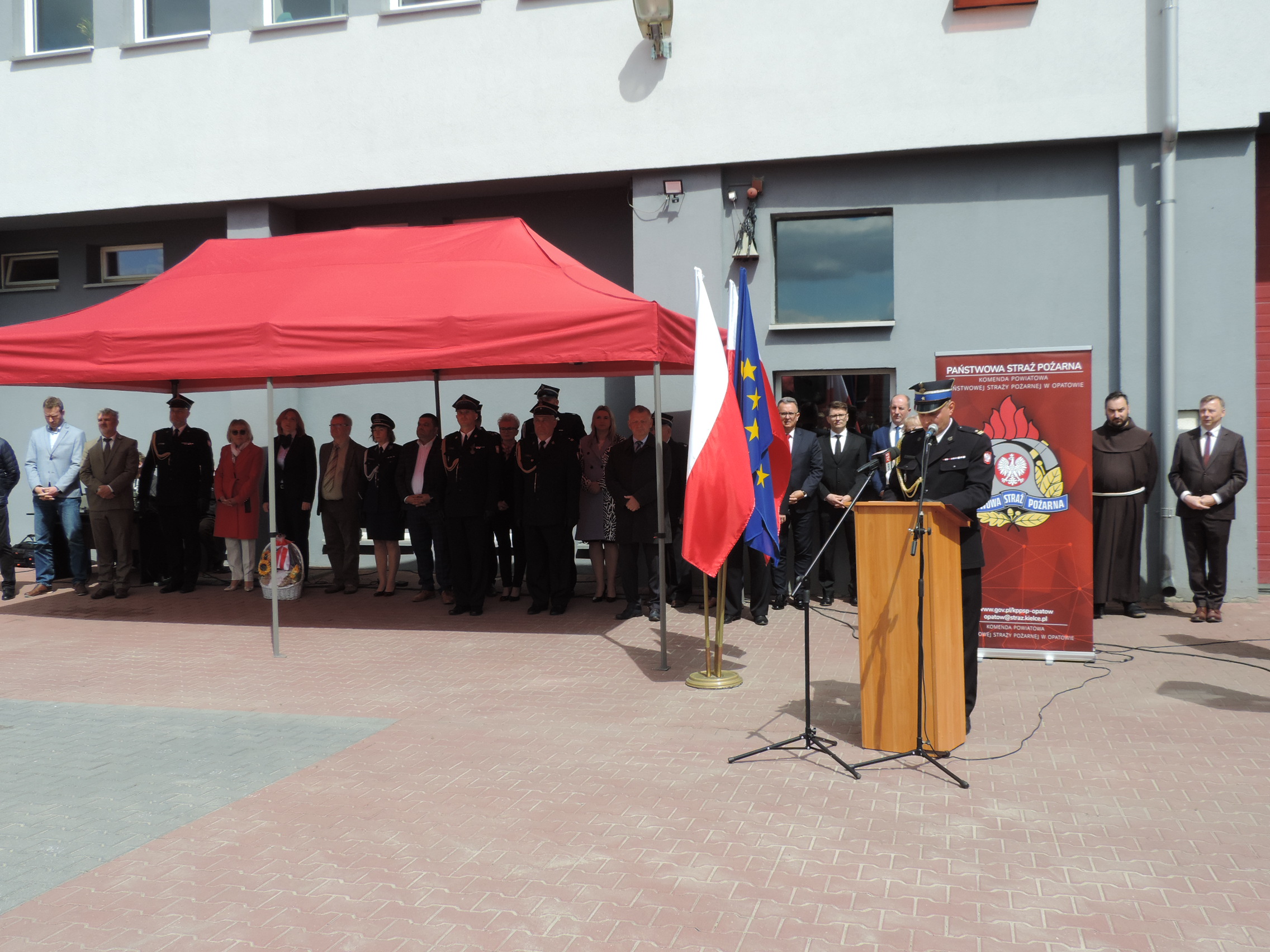 Uroczystość rozpoczęto od złożenia meldunku Świętokrzyskiemu Komendantowi Wojewódzkiemu Państwowej Straży Pożarnej w Kielcach st. bryg. Marcinowi Charubie przez dowódcę uroczystości kpt. Wiktora Łocha. Następnie Komendant Powiatowy PSP w Opatowie mł. bryg. Sylwester Kochanowicz dokonał otwarcia uroczystości, powitał przybyłych gości na czele ze Świętokrzyskim Komendantem Wojewódzkim PSP w Kielcach st. bryg. Marcinem Charubą oraz senatora Jarosława Rusieckiego, przedstawicieli samorządu powiatowego, samorządów gminnych, służb i instytucji współdziałających, przybyłych emerytów pożarnictwa oraz strażaków i pracowników komendy.