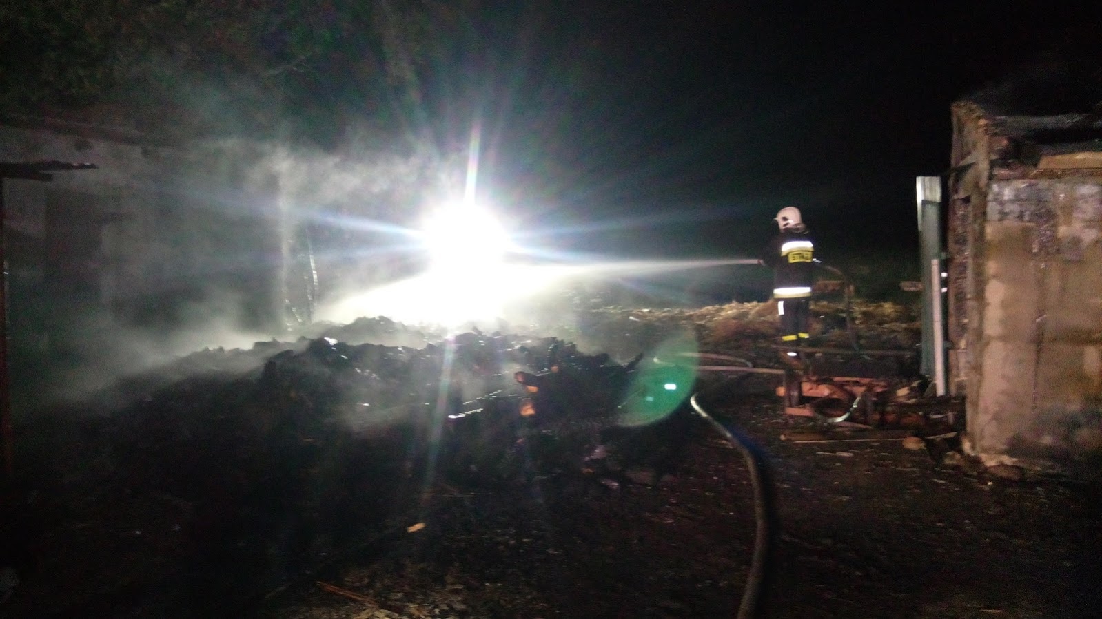 Po przyjeździe na miejsce zdarzenia stwierdzono, że pali się stodoła (wymiary 14x6x5)kryta blachą oraz dwa budynki gospodarcze jeden konstrukcji drewnianej (wymiary 2x2x3) a drugi murowanej (wymiary 3x4x4), dachy budynków gospodarczych przykryte eternitem. W momencie dojazdu na miejsce pierwszego zastępu stodoła oraz drewniany budynek gospodarczy(gołębnik) w całości objęte były pożarem, zagrożony był przyległy do stodoły drugi murowany budynek gospodarczy. Z informacji uzyskanych od użytkownika wynikało, że wewnątrz budynków nie ma osób poszkodowanych, a energia elektryczna została odłączona. Działania zastępów straży pożarnej polegały na zabezpieczeniu miejsca zdarzenia i podaniu dwóch prądów wody w natarciu na palącą się stodołę i drewniany gołębnik oraz jeden prąd wody w obronie murowanej szopy. Po ugaszeniu pożaru dokonano rozbiórki nadpalonych elementów konstrukcyjnych, przerzucono nadpalone drewno opałowe oraz przeszukano pogorzelisko i sprawdzono je przy użyciu kamery termowizyjnej.