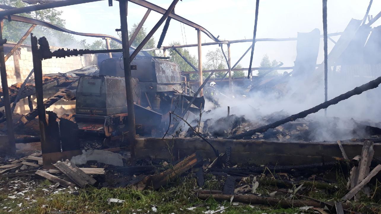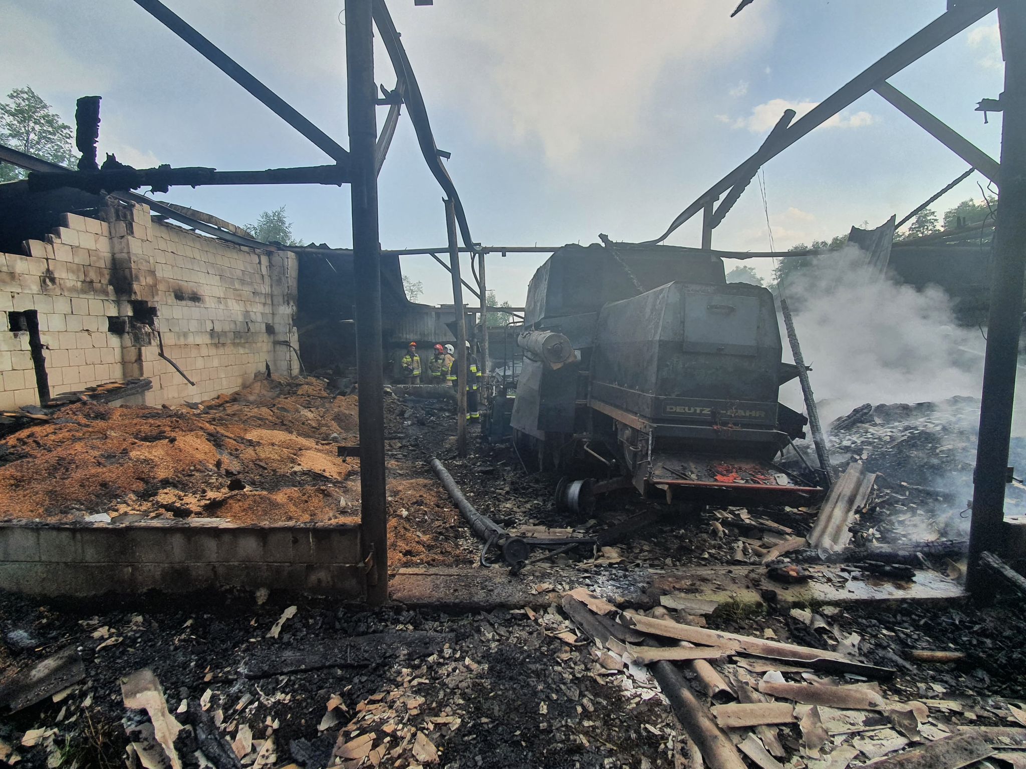 Po dojeździe na miejsce zdarzenia zastępów straży pożarnej stwierdzono, że pożarem objęty jest murowany budynek gospodarczy funkcjonalnie podzielony na trzy części: inwentarską, gospodarczą oraz warsztatową. Przed przybyciem zastępów straży, mieszkańcy posesji ewakuowali z części inwentarskiej zwierzęta hodowlane oraz prasę kostkującą. Na skutek pożaru nikt nie odniósł obrażeń. Pierwszy zastęp przybyły na miejsce zdarzenia podał dwa prądy wody w natarciu na palący się budynek a po przybyciu kolejnych zastępów JOP podano dwa prądy w obronie budynków znajdujących się w pobliżu. Jednocześnie z prowadzonymi działaniami gaśniczymi zbudowano stanowisko wodne ze stawu znajdującego się w pobliżu miejsca zdarzenia. Część inwentarska budynku była pusta a nad nią znajdowała się słoma. W części gospodarczej znajdował się maszyny rolnicze oraz płody rolne. W części warsztatowej znajdowały się drobne narzędzia elektryczne oraz maszyny ogrodnicze. Po zlokalizowaniu pożaru dalsze działania polegały na ewakuacji z budynku składowanych w/w maszyn rolniczych oraz urządzeń, dogaszaniu palącej się słomy i zboża. Spalone płody rolne wyrzucono na zewnątrz budynku w celu dokładnego dogaszenia. Po całkowitym ugaszeniu pożaru dokonano niezbędnych prac rozbiórkowych ścian grożących zawaleniem. Miejsce pożaru sprawdzono kamerą termowizyjną w celu wykluczenia pojedynczych zarzewi ognia. W części inwentarskiej budynku przeprowadzono pomiar na obecność gazów niebezpiecznych przy pomocy detektora wielogazowego PhD6 – wynik pomiarów negatywny.