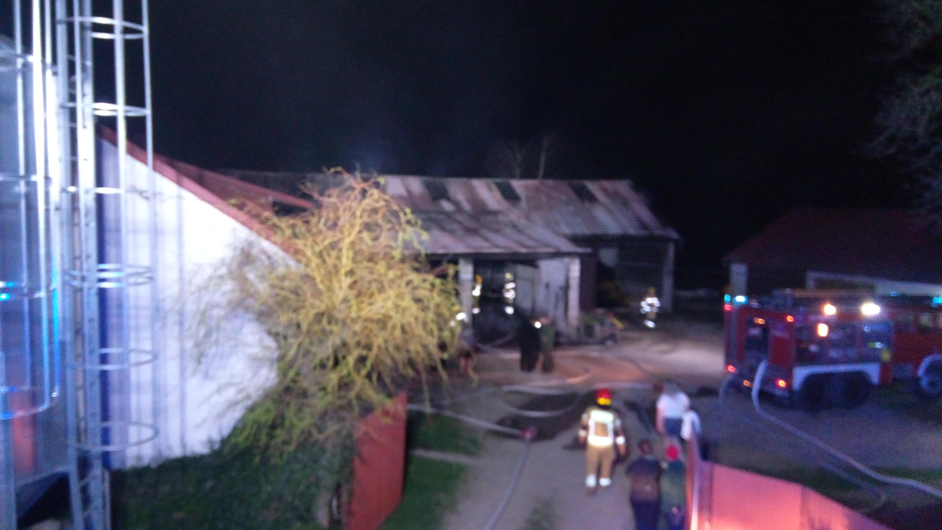 Po przybyciu na miejsce zdarzenia zastępów straży pożarnej stwierdzono pożar budynku gospodarczo-inwentarskiego z dobudówką. Cały budynek ogarnięty przez pożar. Pożarem ogarnięte zostało również pomieszczenie magazynowe przyległe do obory. Zagrożony przyległy budynek. Przed przyjazdem jednostek ochrony przeciwpożarowej właściciel wyprowadził z budynku gospodarczego część zwierząt oraz poinformował kierującego działaniami ratowniczymi, że w środku pozostała część zwierząt spaliła się. Reszta stada znajdowała się na zewnątrz budynków na pastwisku oraz w przyległej do budynku gospodarczego oborze. Działania zastępów straży pożarnej w pierwszej fazie polegały na zabezpieczeniu miejsca zdarzenia oraz podaniu trzech prądów wody w natarciu na palące się budynki oraz jednego w obronie na przyległą oborę. Na miejsce zadysponowany został Zespół Ratownictwa Medycznego do dwóch osób poszkodowanych. Do czasu przyjazdu Zespołu Ratownictwa Medycznego poszkodowanym udzielono kwalifikowanej pierwszej pomocy (ocena stanu poszkodowanych, wsparcie psychiczne, tlenoterapia, schładzanie oparzeń). Po zlokalizowaniu pożaru dalsze działania polegały na dogaszaniu pojedynczych zarzewi ognia z jednoczesnym przewietrzaniem pomieszczeń oraz usuwaniu nadpalonych części drewnianej więźby i zniszczonego sprzętu gospodarskiego. Po całkowitym ugaszeniu pożaru całe pogorzelisko sprawdzono za pomocą kamery termowizyjnej. Mając na uwadze powstałe duże uszkodzenia w konstrukcji budynku oraz stan wyprowadzonego bydła (widoczne poparzenia na ciele zwierząt) KDR na miejsce za pośrednictwem stanowiska kierowania komendanta powiatowego zadysponował Powiatowego Inspektora Nadzoru Budowlanego oraz Powiatowego Lekarza Weterynarii.
