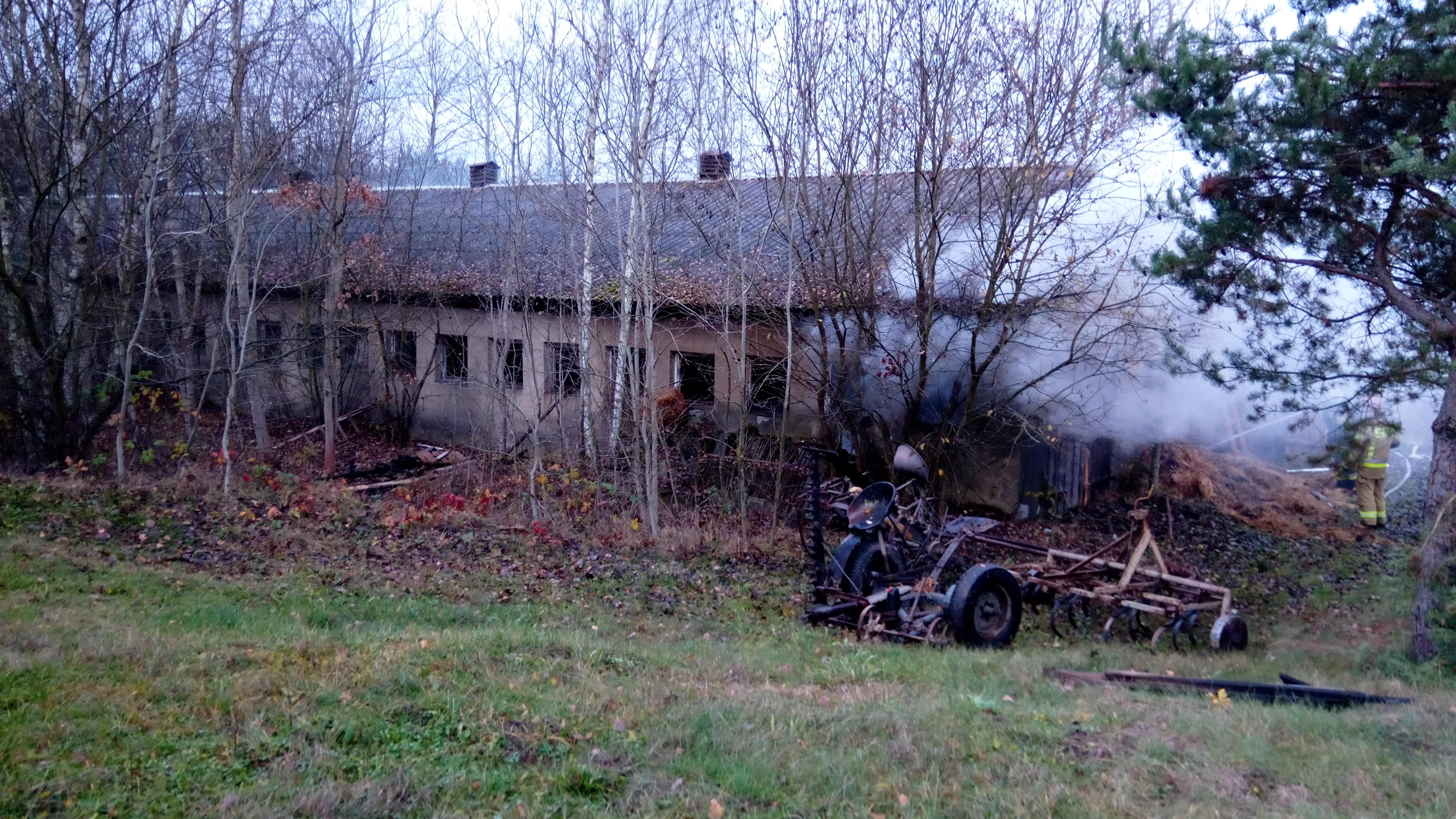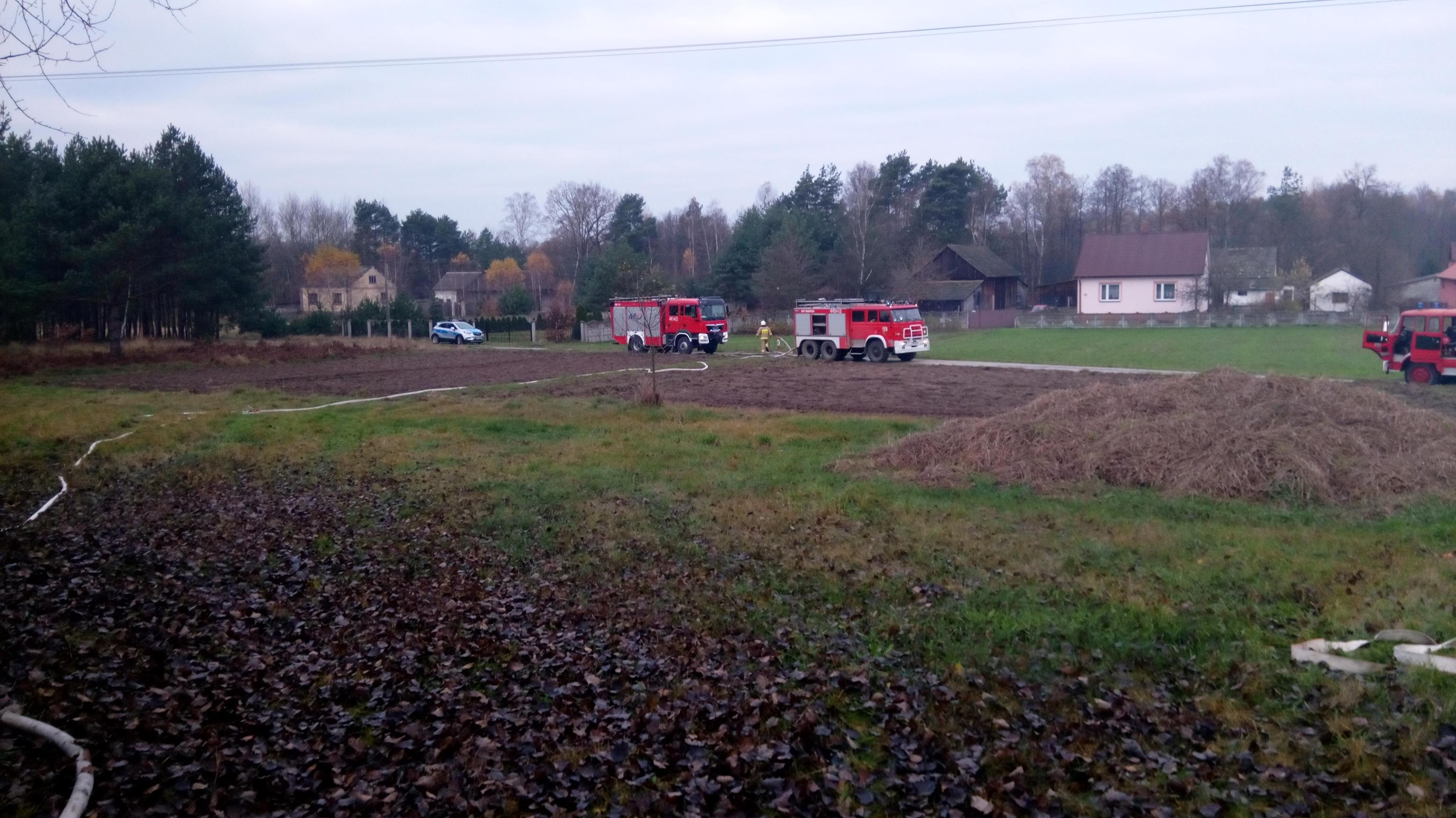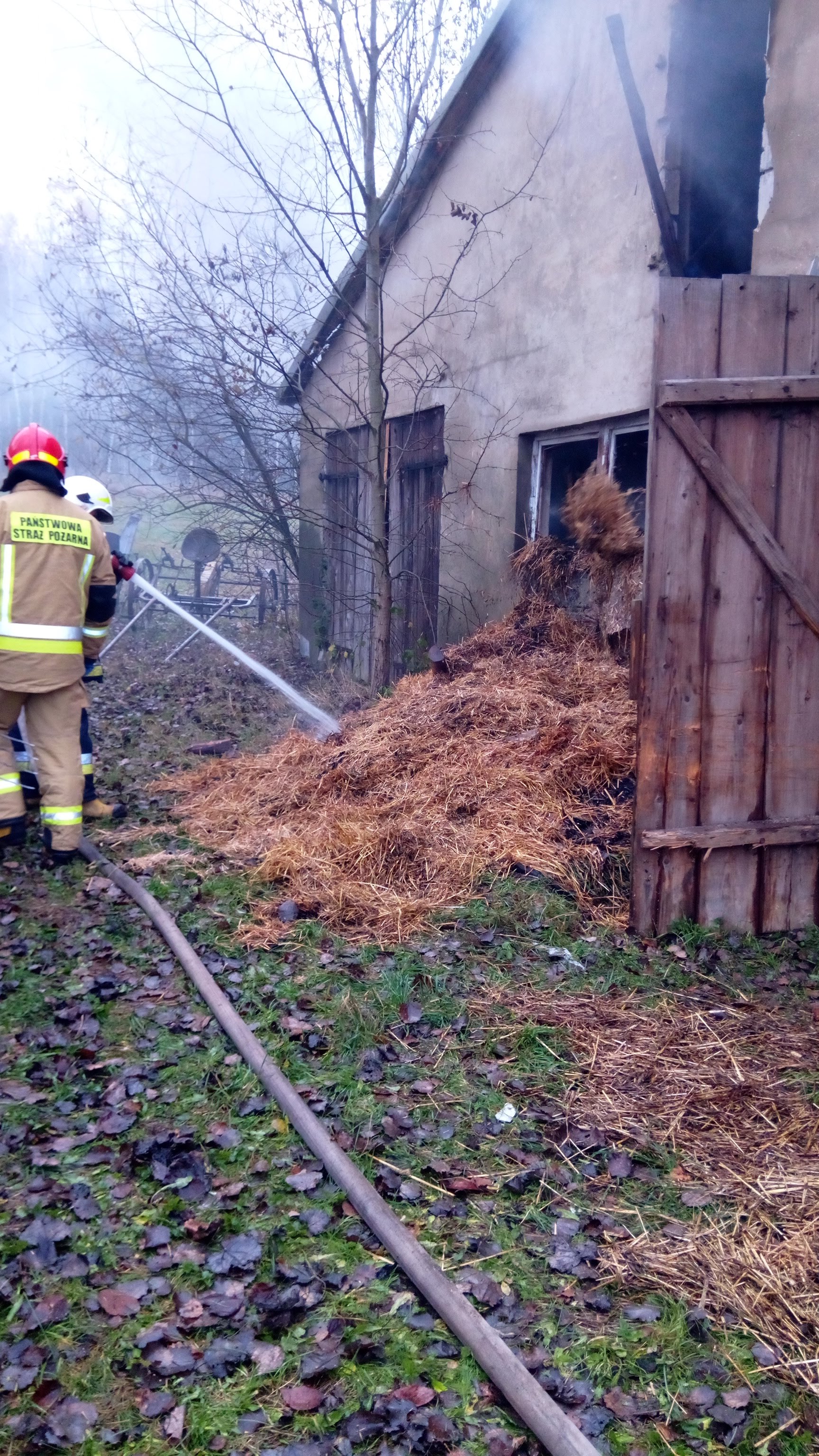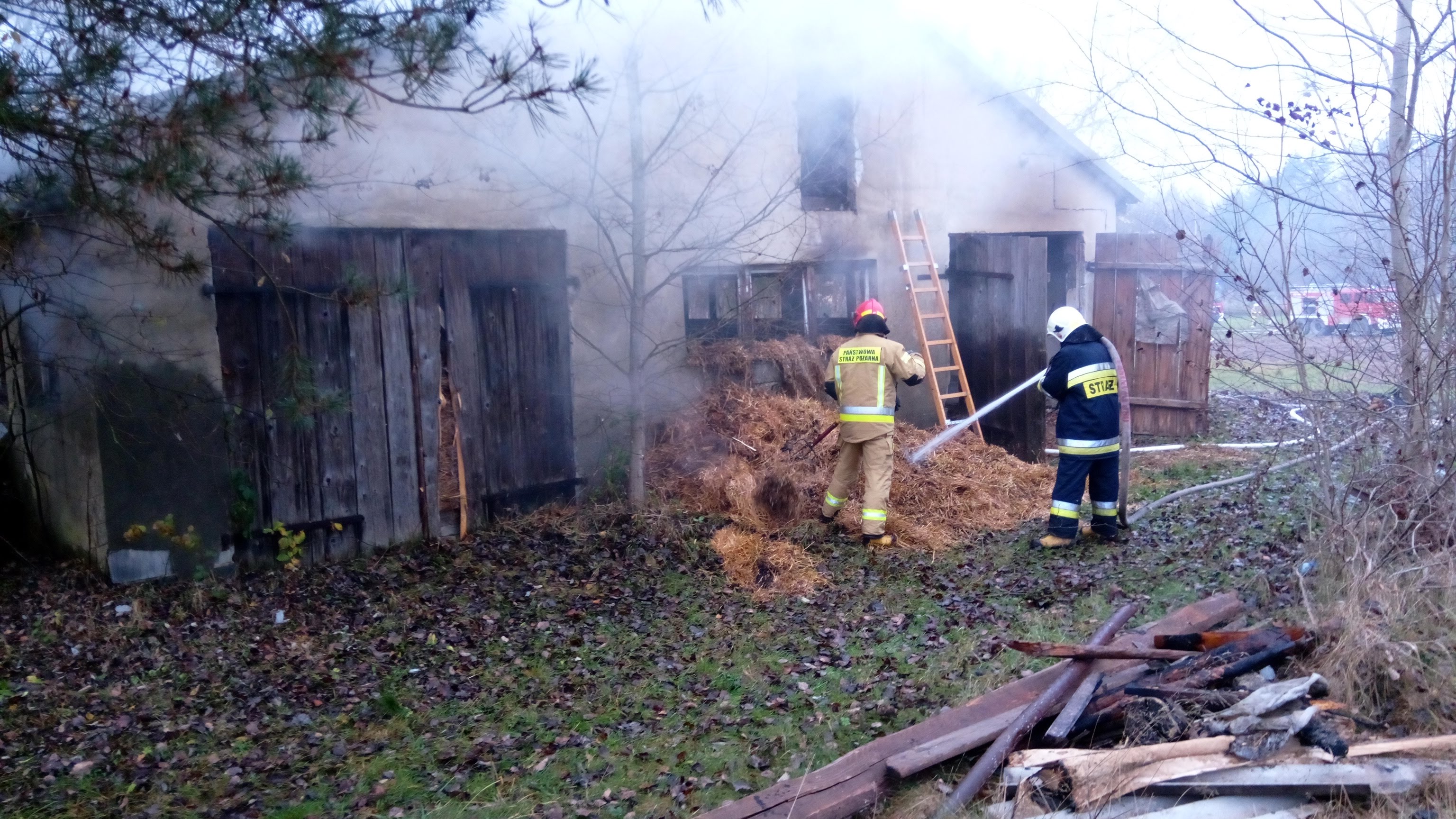 Po przybyciu na miejsce zdarzenia zastępów straży pożarnej stwierdzono pożar części budynku inwentarskiego (bez drobiu hodowlanego). Pożar na zewnątrz budynku, brak innych budynków zagrożonych, jak również osób poszkodowanych. Budynek w całości odłączony od sieci elektrycznej. Działania zastępów straży pożarnej polegały na podaniu trzech prądów wody (dwóch w natarciu na ognisko pożaru, jednego w obronie pozostałej części budynku). Po zlokalizowaniu pożaru dalsze działania polegały na ewakuacji z budynku składowanych w nim maszyn rolniczych (kultywator, zgrabiarka, kosiarka), dogaszaniu palącej się słomy oraz ocieplenia stropu (trociny). Spaloną słomę wyrzucono na zewnątrz budynku w celu dokładnego dogaszenia. Po całkowitym ugaszeniu pożaru dokonano niezbędnych prac rozbiórkowych więźby dachowej grożących zawaleniem. Miejsce pożaru sprawdzono kamerą termowizyjną w celu wykluczenia pojedynczych zarzewi ognia.