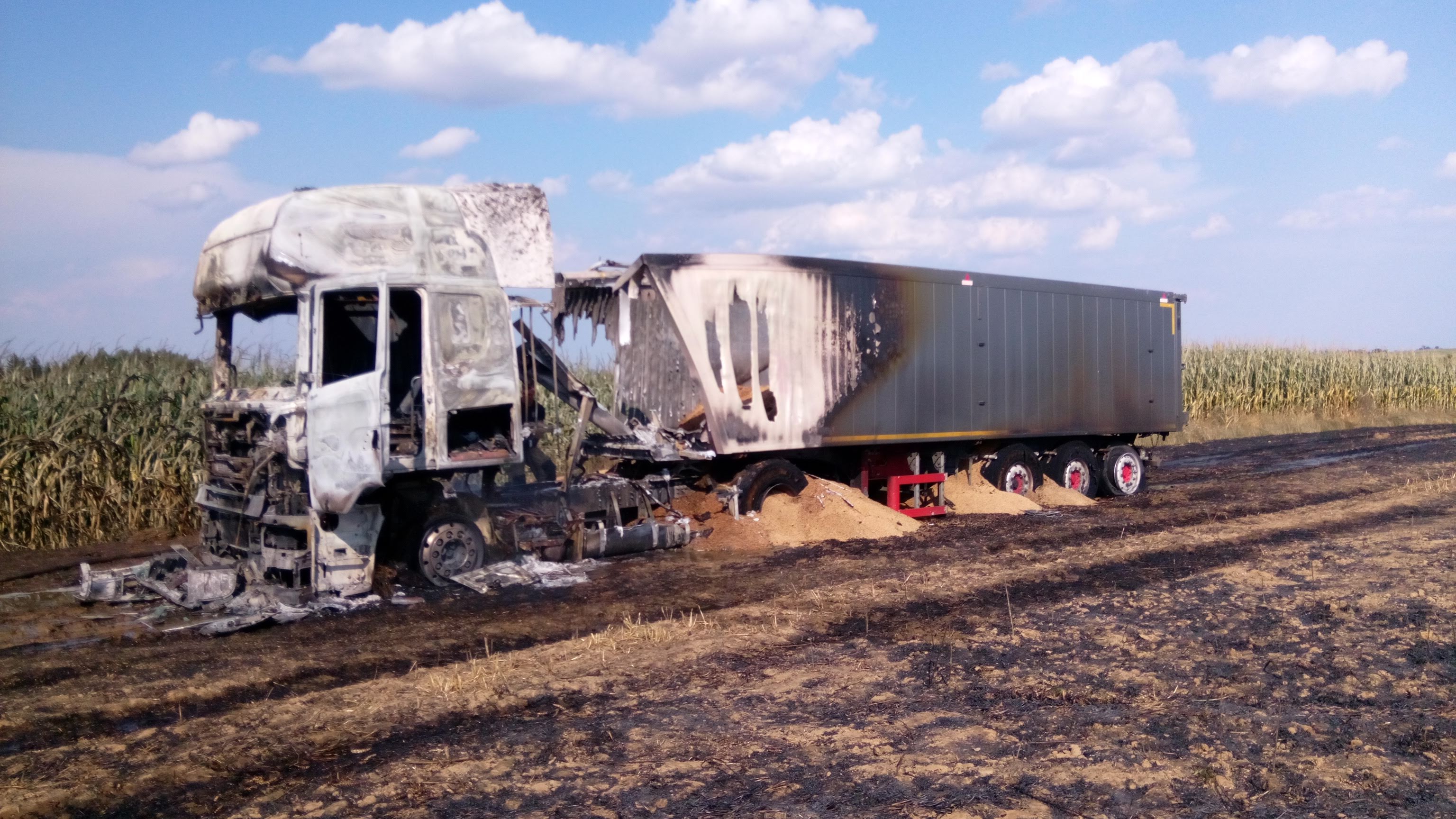 Po przybyciu na miejsce zdarzenia zastępów straży pożarnej stwierdzono pożar ciągnika siodłowego z naczepą na polu uprawnym. Na naczepie znajdowało się ok. 15 ton pszenicy. Pożarem objęty był cały pojazd z naczepą oraz ok. 20 arów ścierniska. Działania zastępów polegały na zabezpieczeniu miejsca zdarzenia, podaniu jednego prądu piany ciężkiej na palący się samochód oraz dwa prądy wody na palące się ściernisko. Po ugaszeniu ognia pogorzelisko sprawdzono przy pomocy kamery termowizyjnej i dokładnie dogaszono. Na polu uprawnym pojedyncze zarzewia ognia dogaszono za pomocą tłumic i łopat.