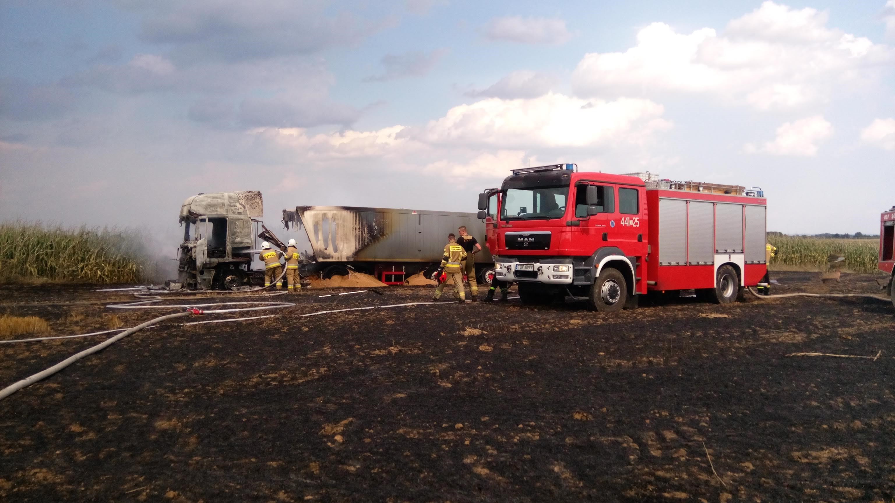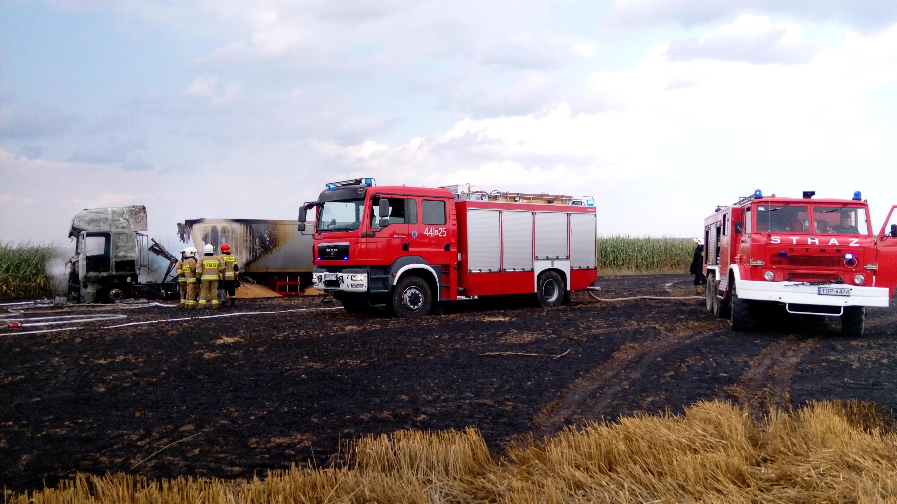 Pożar ciągnika siodłowego oraz ścierniska po kombajnie