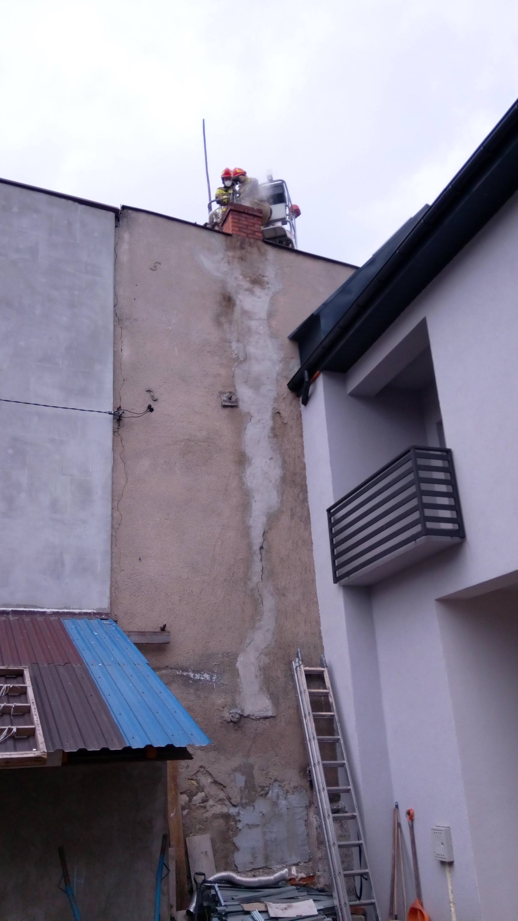 Po przybyciu na miejsce zdarzenia zastępów straży pożarnej stwierdzono, że doszło do zapalenia się sadzy w przewodzie kominowym budynku mieszkalnego, wielorodzinnego. Wszyscy mieszkańcy opuścili budynek przed przybyciem zastępów jednostek ochrony przeciwpożarowej. Działania zastępów straży pożarnej polegały na zabezpieczeniu miejsca zdarzenia, następnie ugaszono palącą się sadzę przy pomocy piasku oraz wyczyszczono komin przy użyciu zestawu kominiarskiego. Prace prowadzono przy użyciu podnośnika hydraulicznego SH-23. Pomieszczenia budynku zostały przewietrzone oraz sprawdzone na obecność tlenku węgla przy pomocy detektora wielogazowego (wynik negatywny). Konstrukcję przewodu kominowego sprawdzono kamerą termowizyjną.